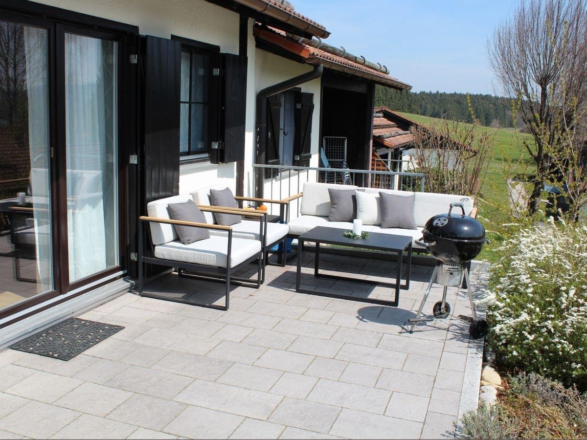 Die nach Süden ausgerichtete Terrasse - mit Blick auf den See - bietet Entspannung pur. Sie ist ausgestattet mit einer gemütlichen Lounge-Ecke, einem Tisch für 8 Personen sowie Grillmöglichkeit.