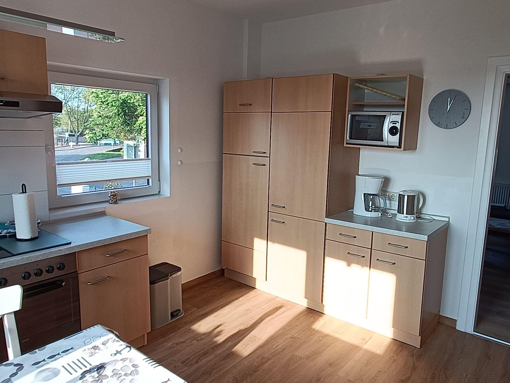 Ferienwohnung EG (70 m²), 1 Wohnraum, 1 Schlafzimmer mit Doppelbett, 1 Schlafzimmer mit Einzelbett, 1 Schlafmöglichkeit im Wohnbereich (Schrankbett), Küche mit Geschirrspüler, Dusche und WC (getrennt).