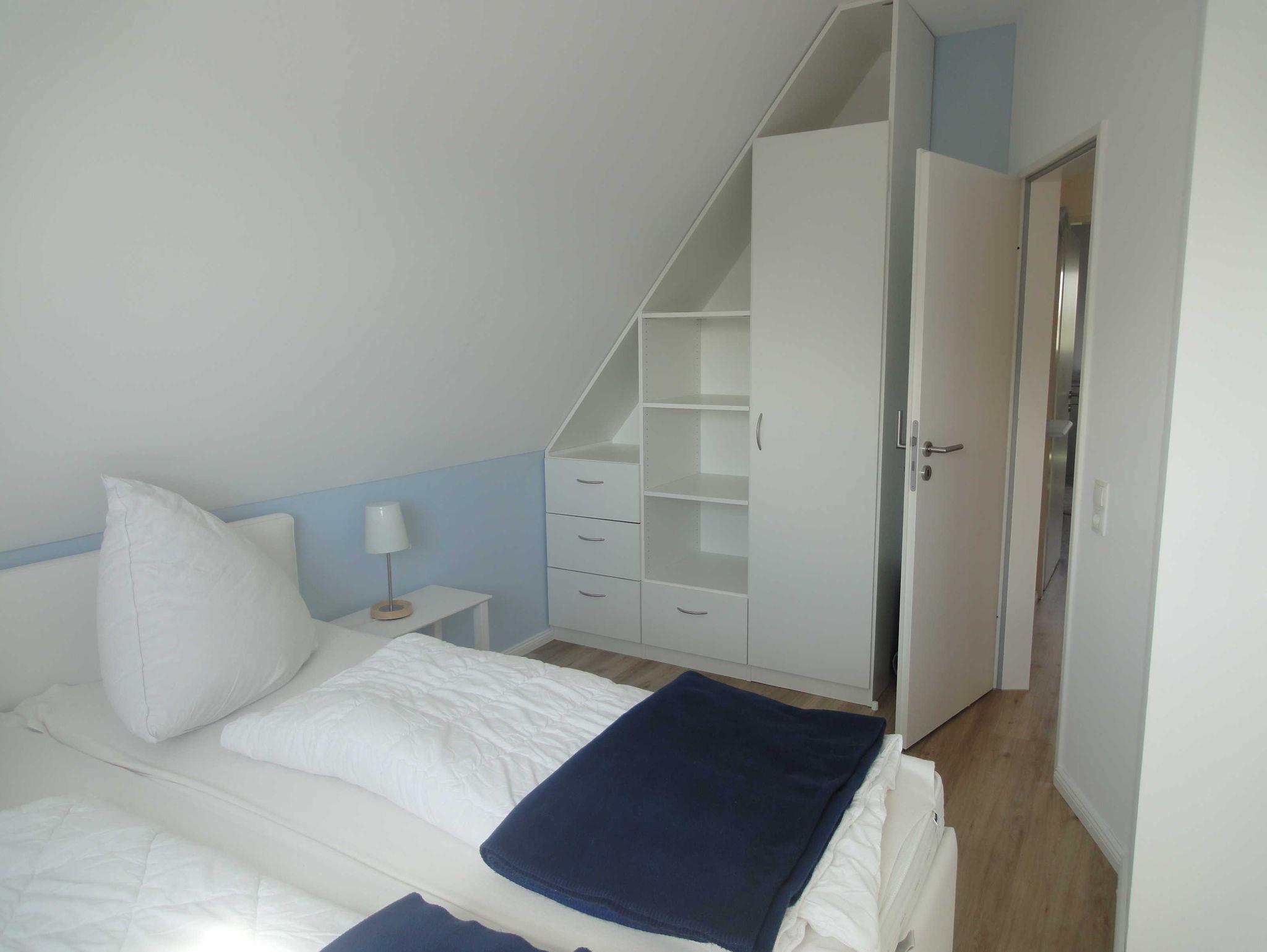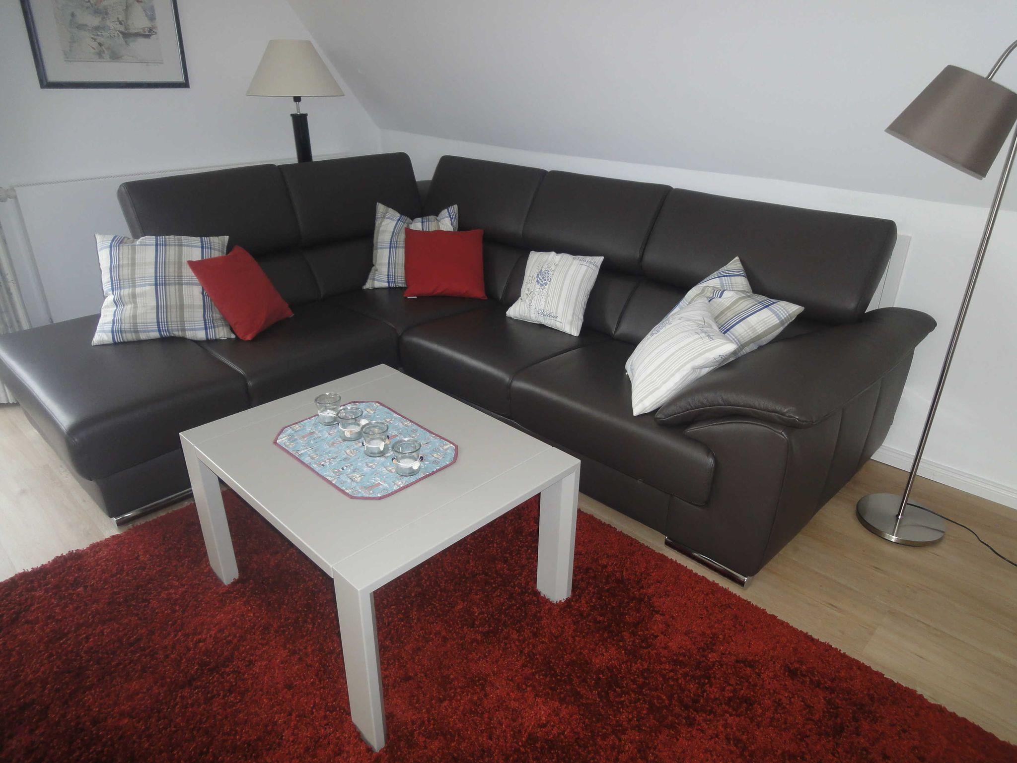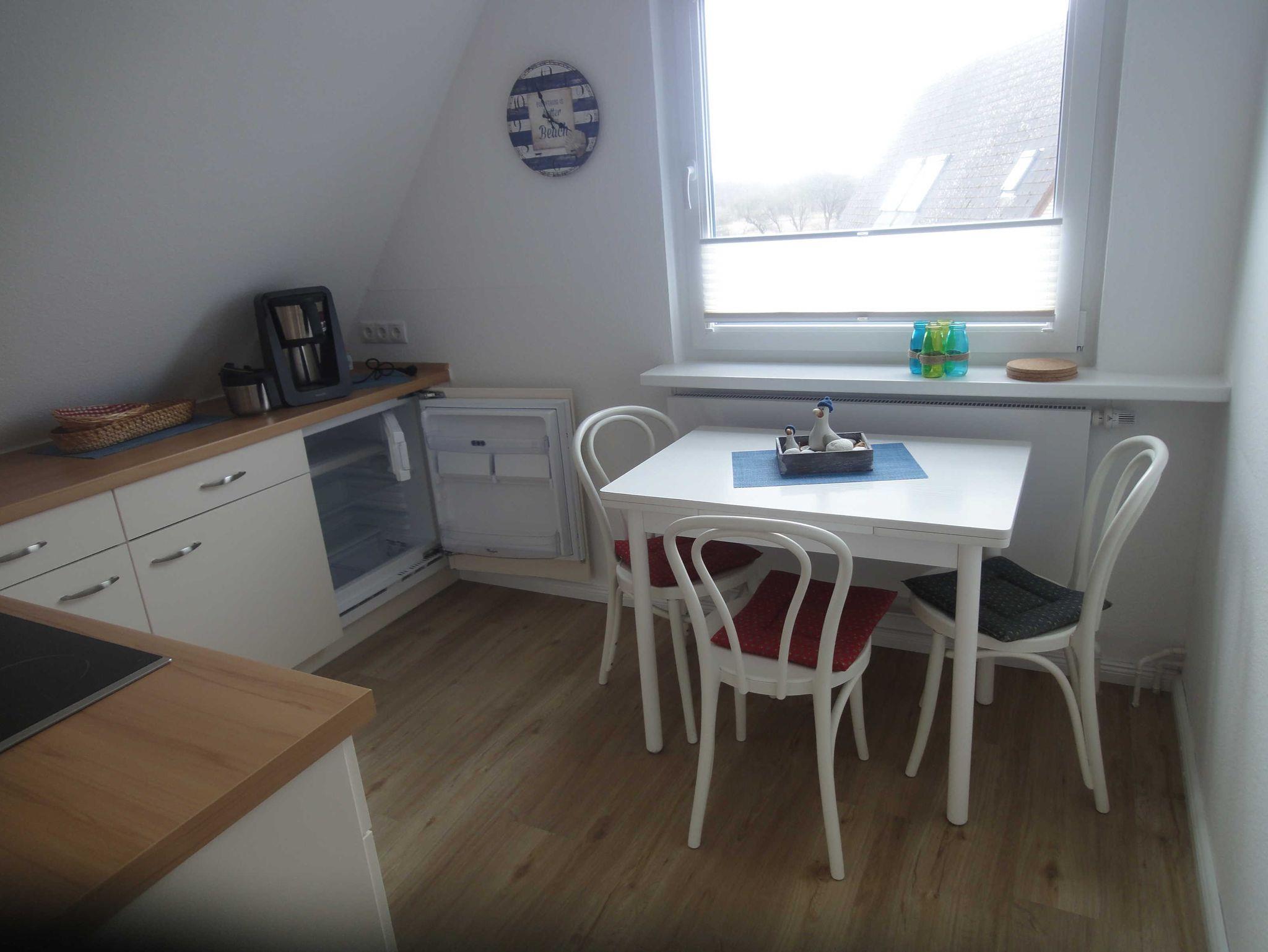Ferienwohnung (54 qm) im Obergeschoss mit West-Balkon. Wohnzimmer mit Alkovenbett (100 x 190), 1 Schlafzimmer mit Doppelbett, Küche und Dusche/WC.
