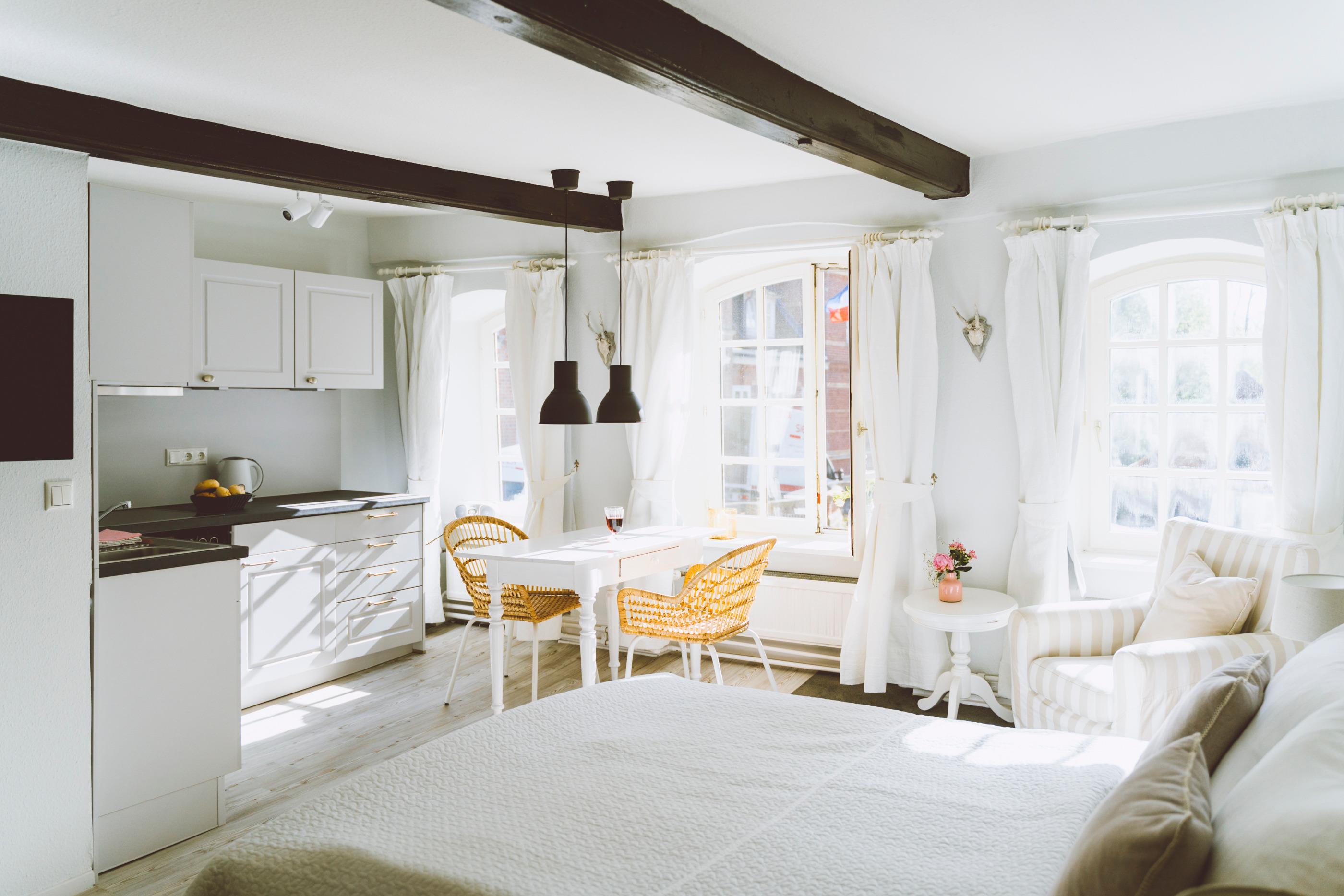 Genießen Sie Ihr kleines Urlaubsreich für zwei. Beim Ausschlafen im gemütlichen Boxspringbett. Beim Frühstücken mit Blick auf den Gutshof. Beim gemeinsamen Kochen. Beim Essen bei einem Glas Wein. Einfach wohlfühlen.