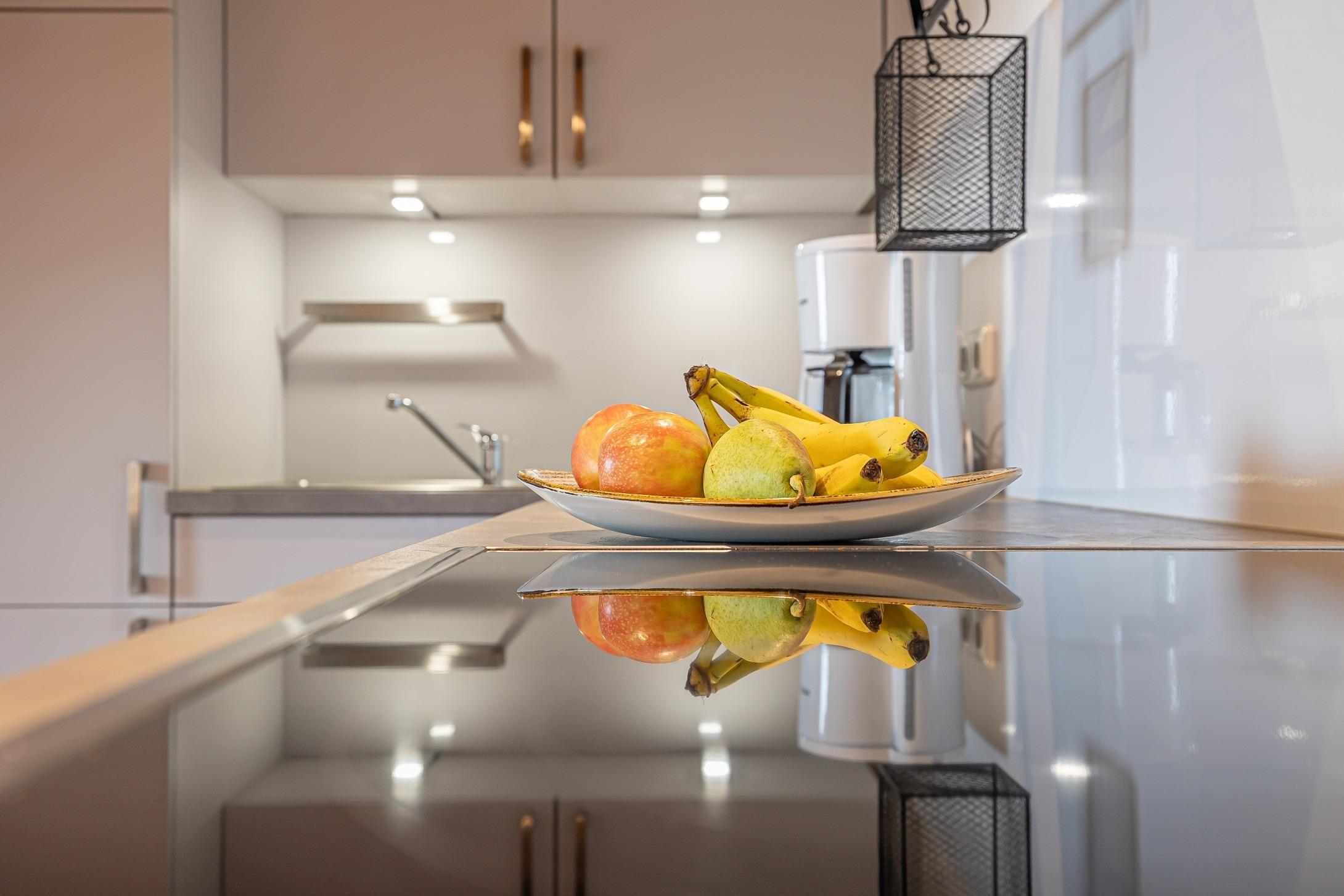 offener Wohn- und Essbereich mit Küche und TV und Sonos / Zugang zur Terrasse