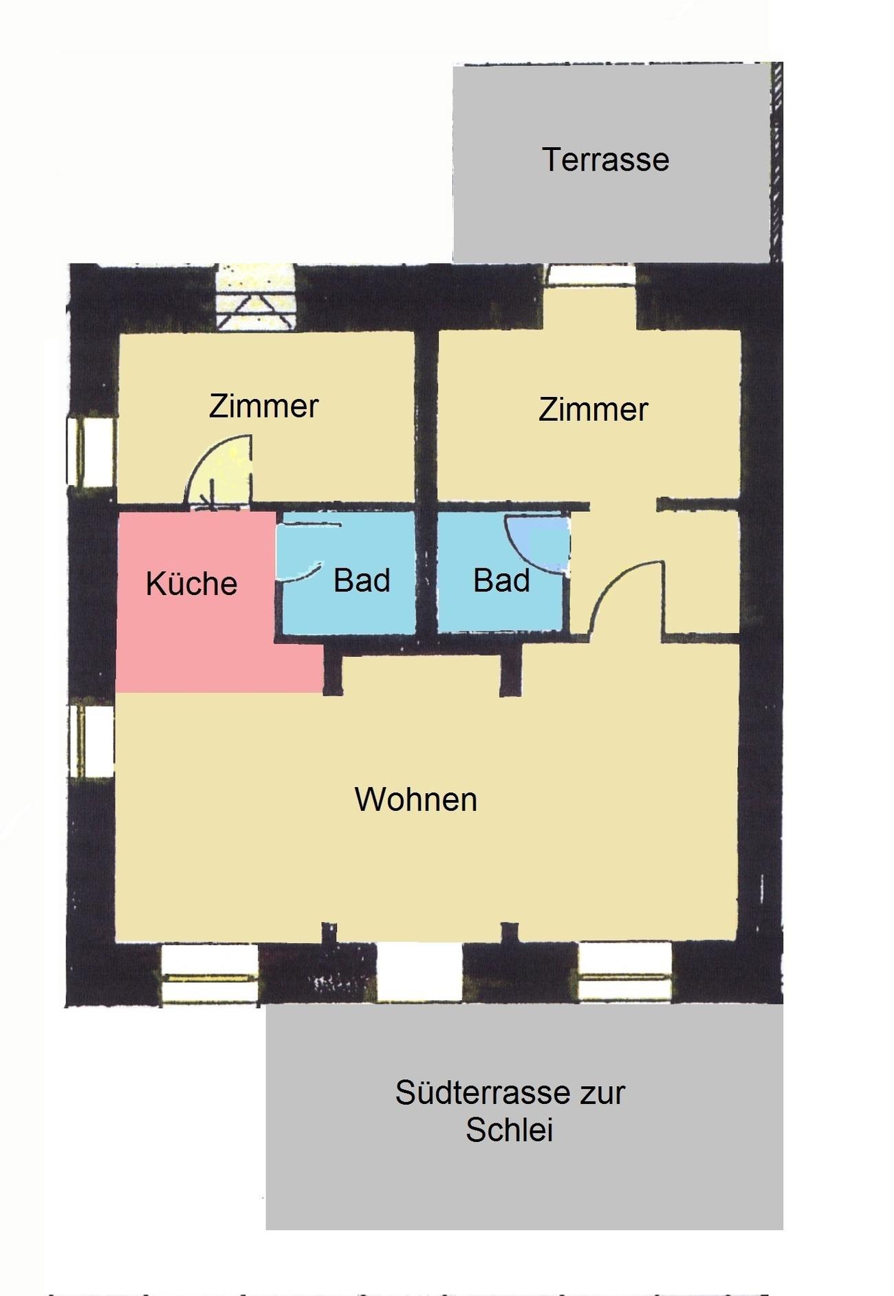 Gemütliche Ferienwohnung im Erdgeschoss einer historischen Mühle (1883) unmittelbar an der Schlei, mit Blick auf das Maasholmer Noor. Mit Kamin, wlan, 2 getrennten Schlafzimmer mit jeweils eigenem Dusch/WC Bad und hochwertiger Einbauküche.