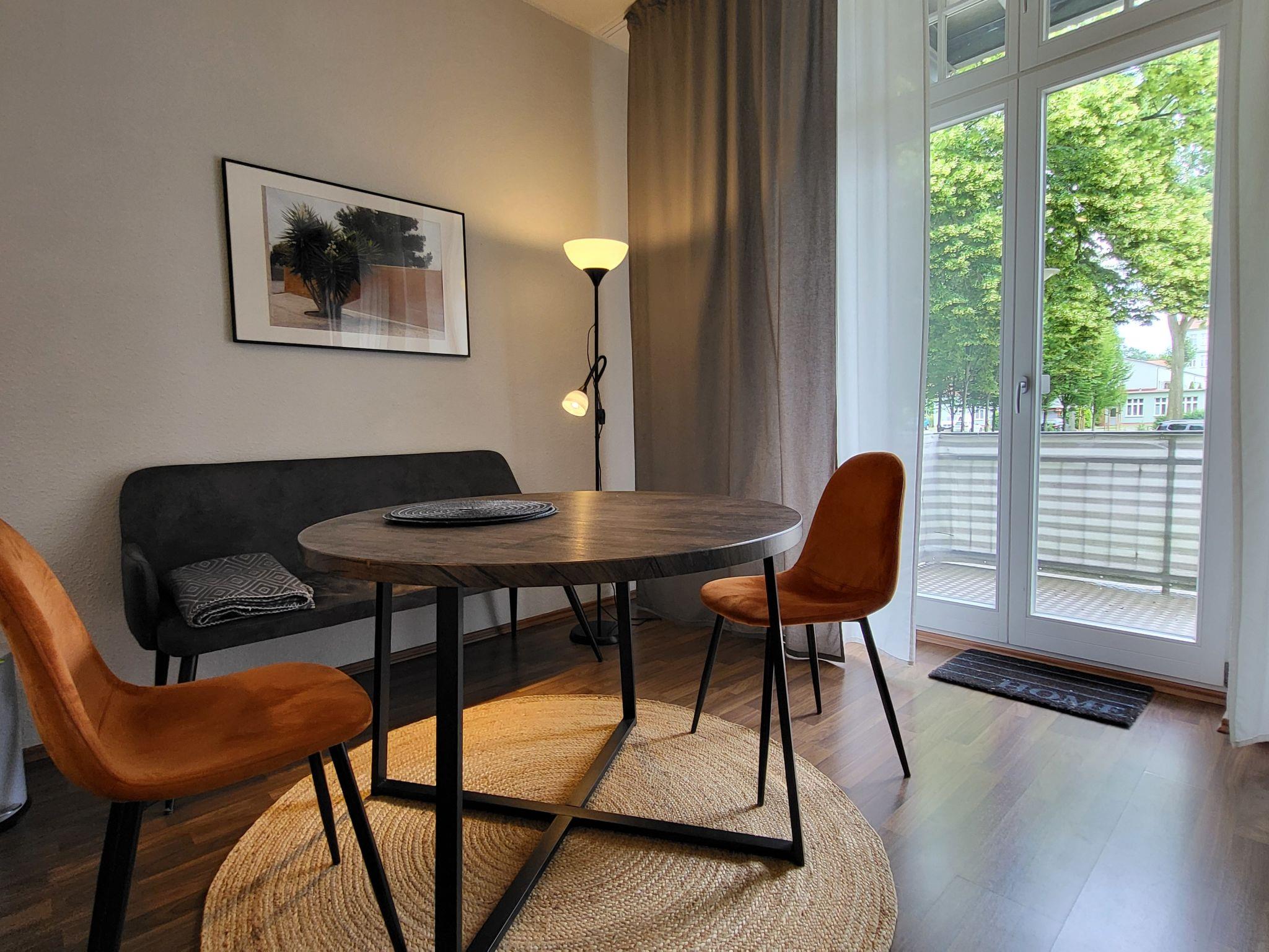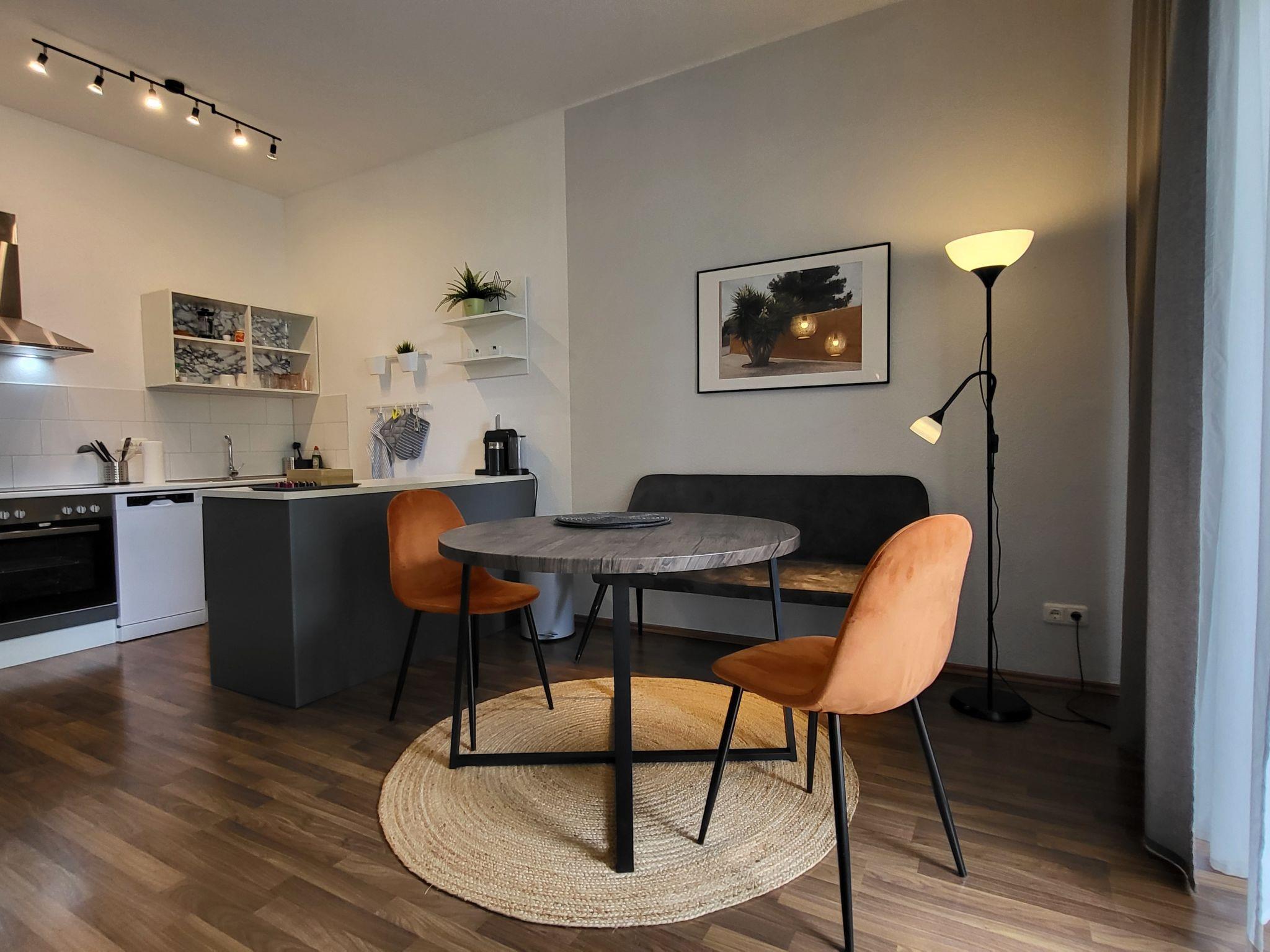 "Modernes Apartment in Magdeburg", 1-room apartment 48 m2, on the ground floor. Spacious and bright, tasteful furnishings: large living/sleeping room with 1 double bed (180 cm, length 200 cm), dining table, kitchen corner, cable TV and radio. Exit to the balcony, west facing position. (oven, dishwasher, 4 induction hot plates, toaster, kettle, microwave, electric coffee machine) with kitchen corner. Bath/WC. Heating. Balcony 6 m2, west facing position. Balcony furniture. Facilities: washing machine. Extra. Parking (1 car).