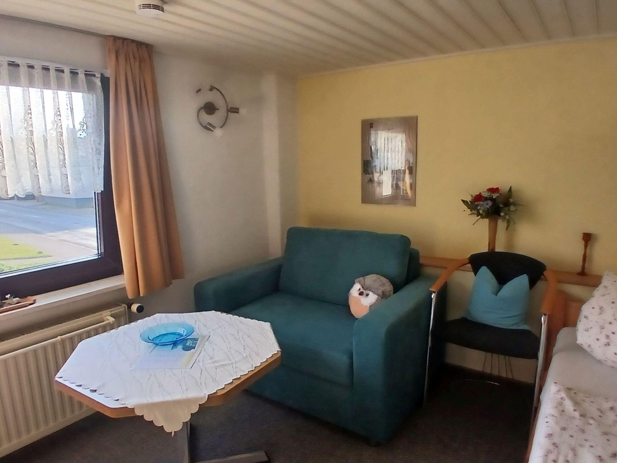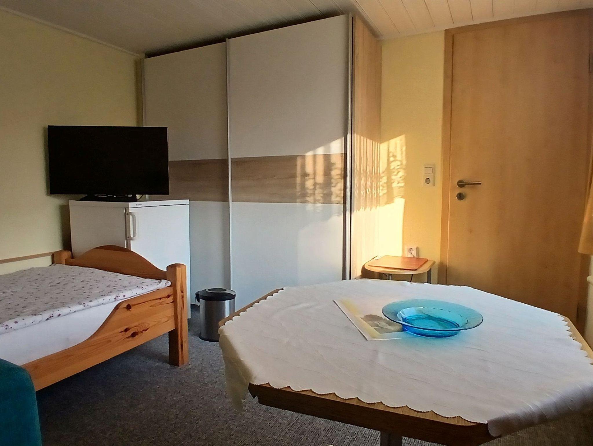 Das Zimmer Links ist gemütlich und praktisch eingerichtet mit Blick auf den Hof und einen Teil des Gartens. So gehören zur Ausstattung auch ein Radio, TV, Geschirr, Kaffeemaschine, Toaster und ein Kühlschrank. Auf Anfrage kann gegebenenfalls eine Aufbettung erfolgen. Das Zimmer ist mit Zimmer Rechts durch einen Flur verbunden und teilt sich das Bad mit Dusche und WC. Beide Zimmer sind separat voneinander buchbar, werden gern auch gemeinsam gebucht. 2024 wurden beide Zimmer frisch renoviert.