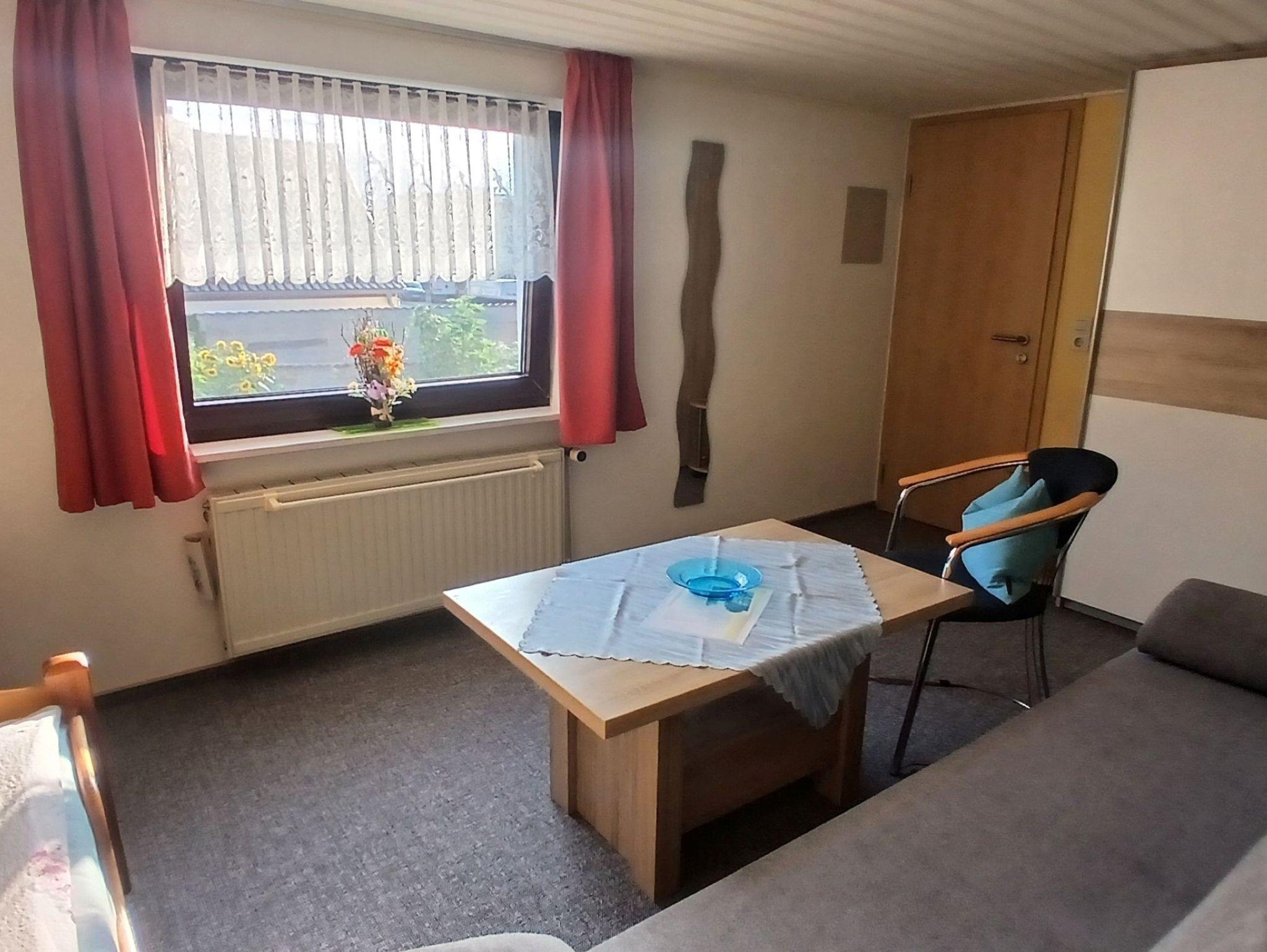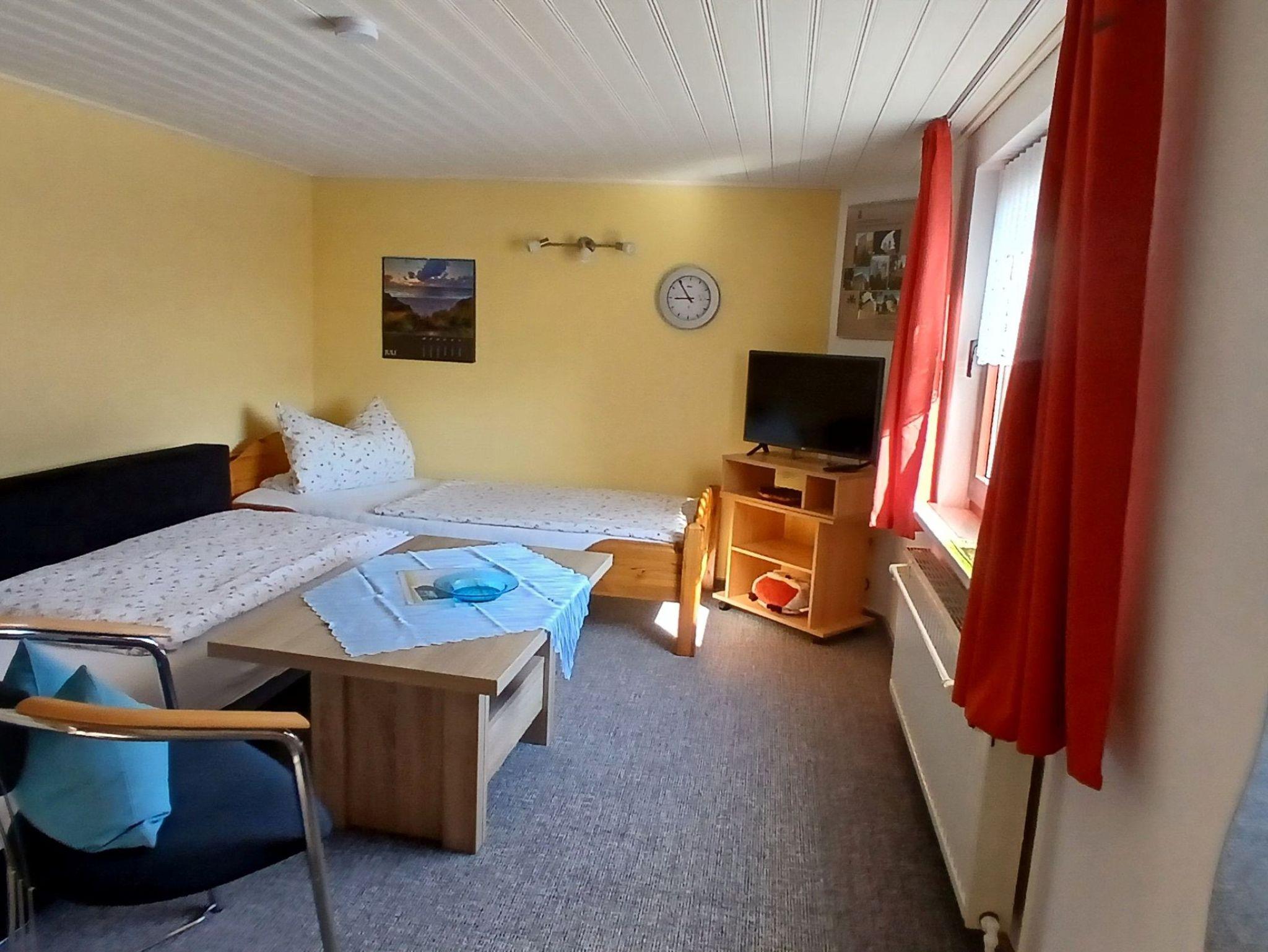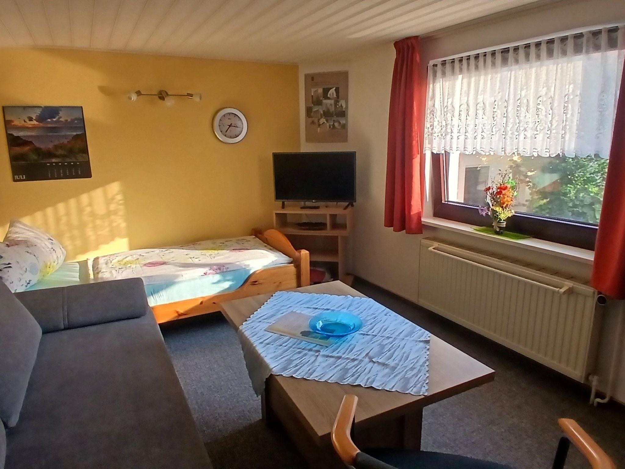 Das Zimmer Rechts ist freundlich und praktisch eingerichtet und kann Dank der Schlafcouch auch als Doppelbelegung gebucht werden. Vom Fenster aus blickt man in den Garten. Zur Ausstattung gehören ein Radio, TV, Geschirr, Kaffeemaschine, Toaster und ein Kühlschrank. Es ist mit Zimmer Links durch einen Flur verbunden und teilt sich das Bad mit Dusche und WC. Beide Zimmer sind separat voneinander buchbar, werden gern auch gemeinsam gebucht. 2024 wurden beide Zimmer frisch renoviert.