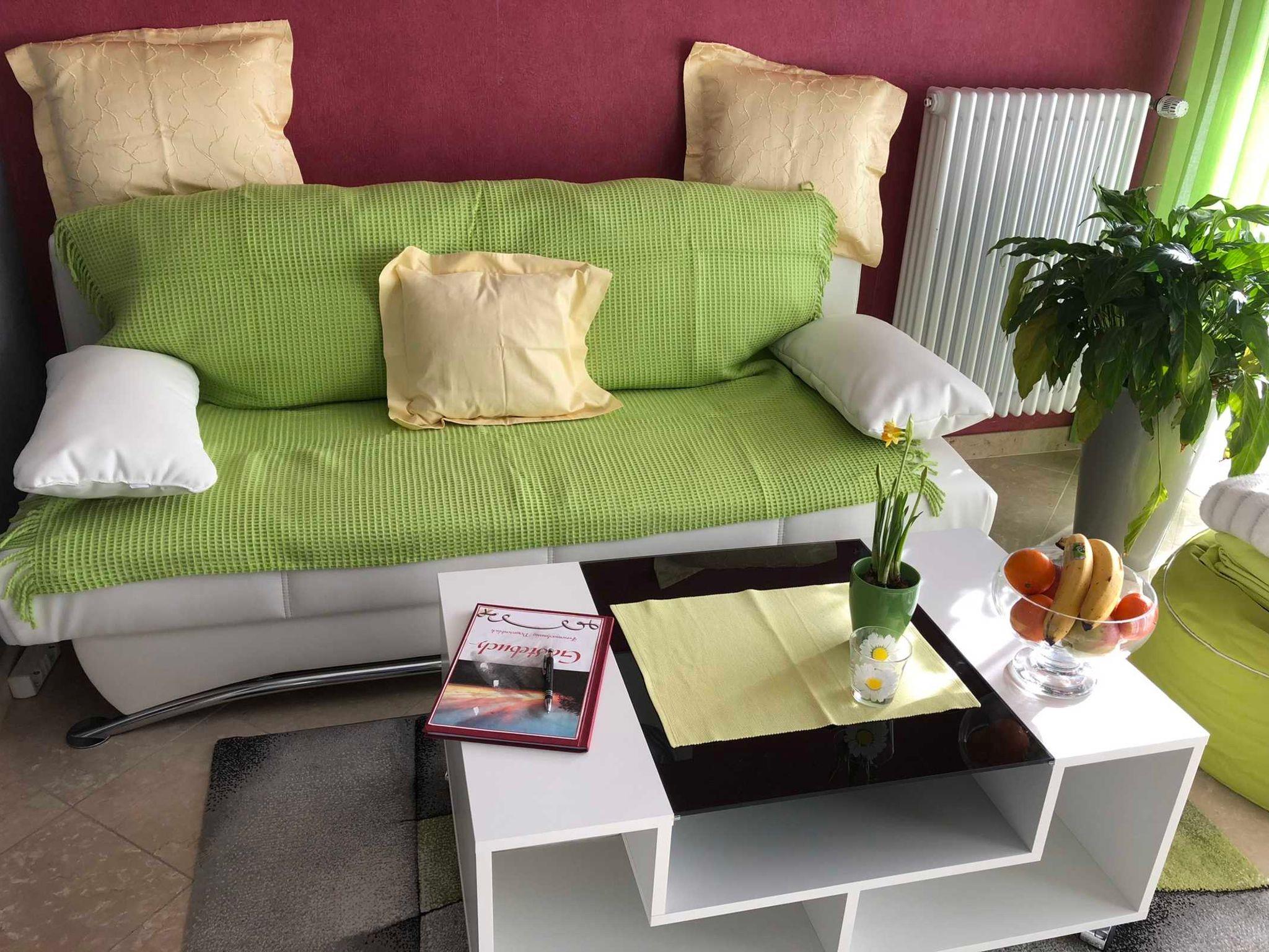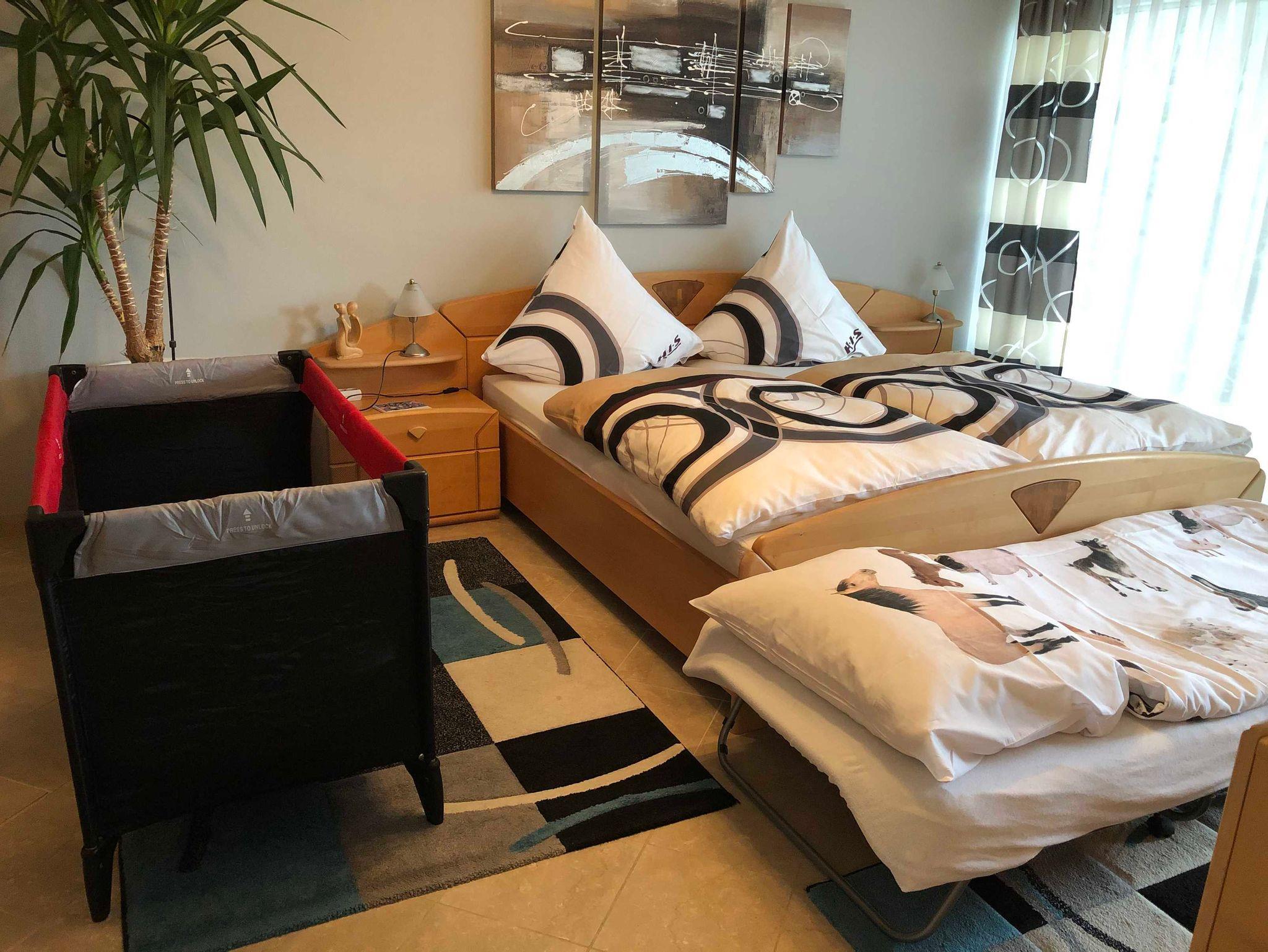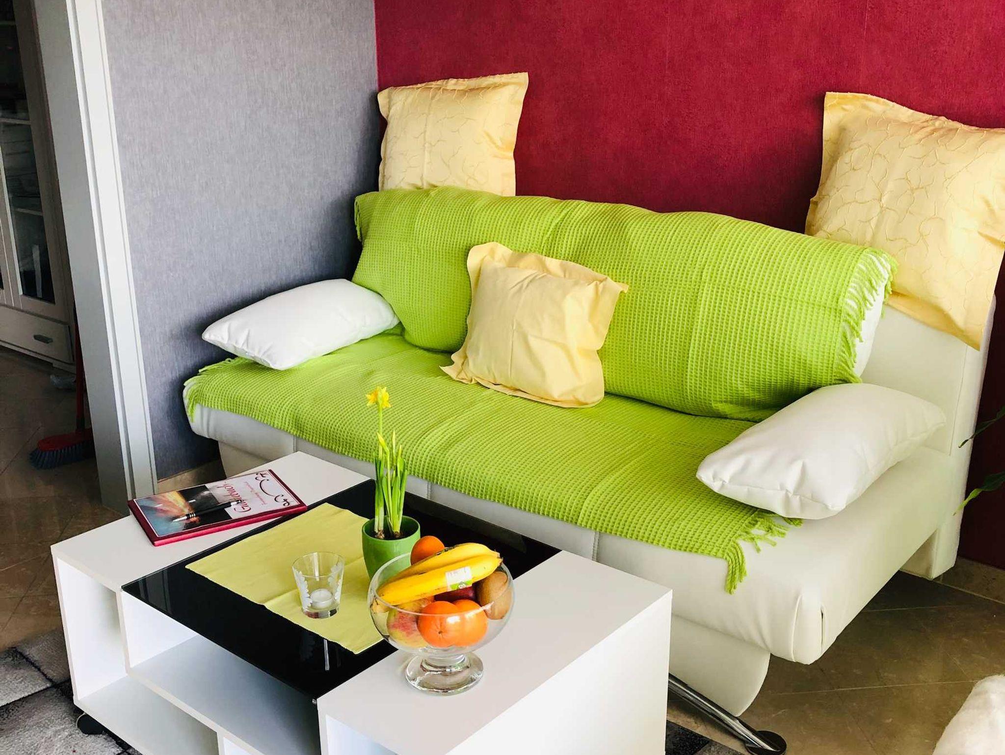 Nichtraucherwohnung, Badezimmer, Küche, Schlafzimmer mit Doppelbett und bei Bedarf Zustellbett. Wohnzimmer mit Schlafcouch für 2 Personen, Zugang auf die große Terrasse von Schlaf- und Wohnzimmer.