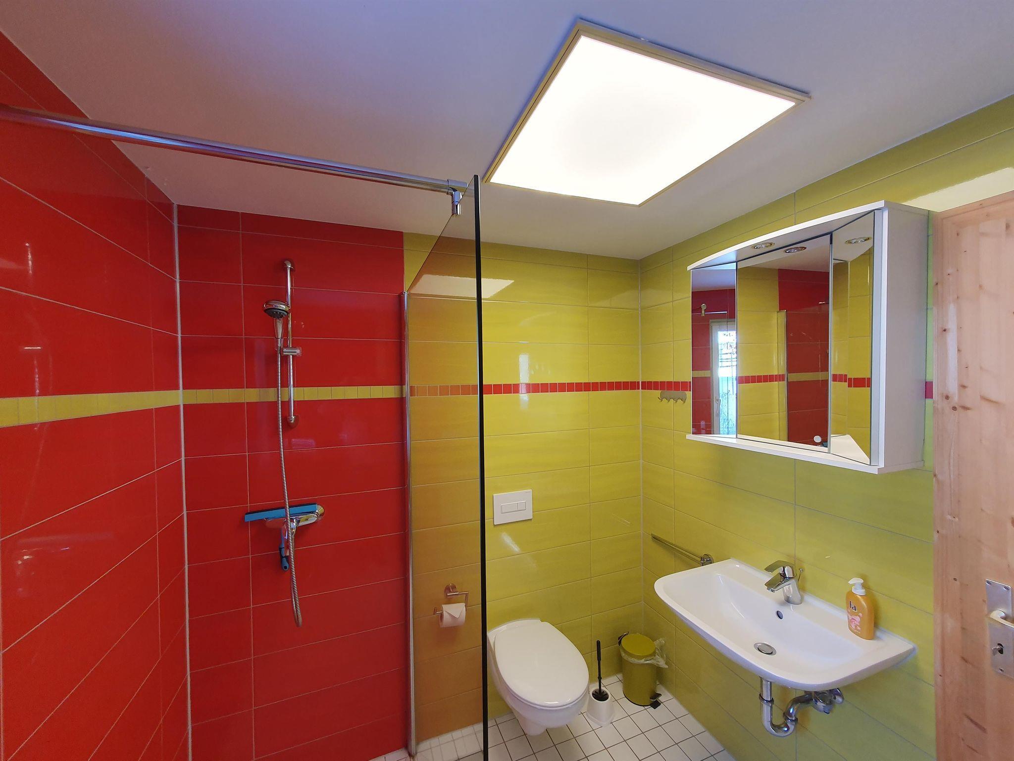 Im ausgestattetem Bad befindet sich eine bodengleiche Dusche.