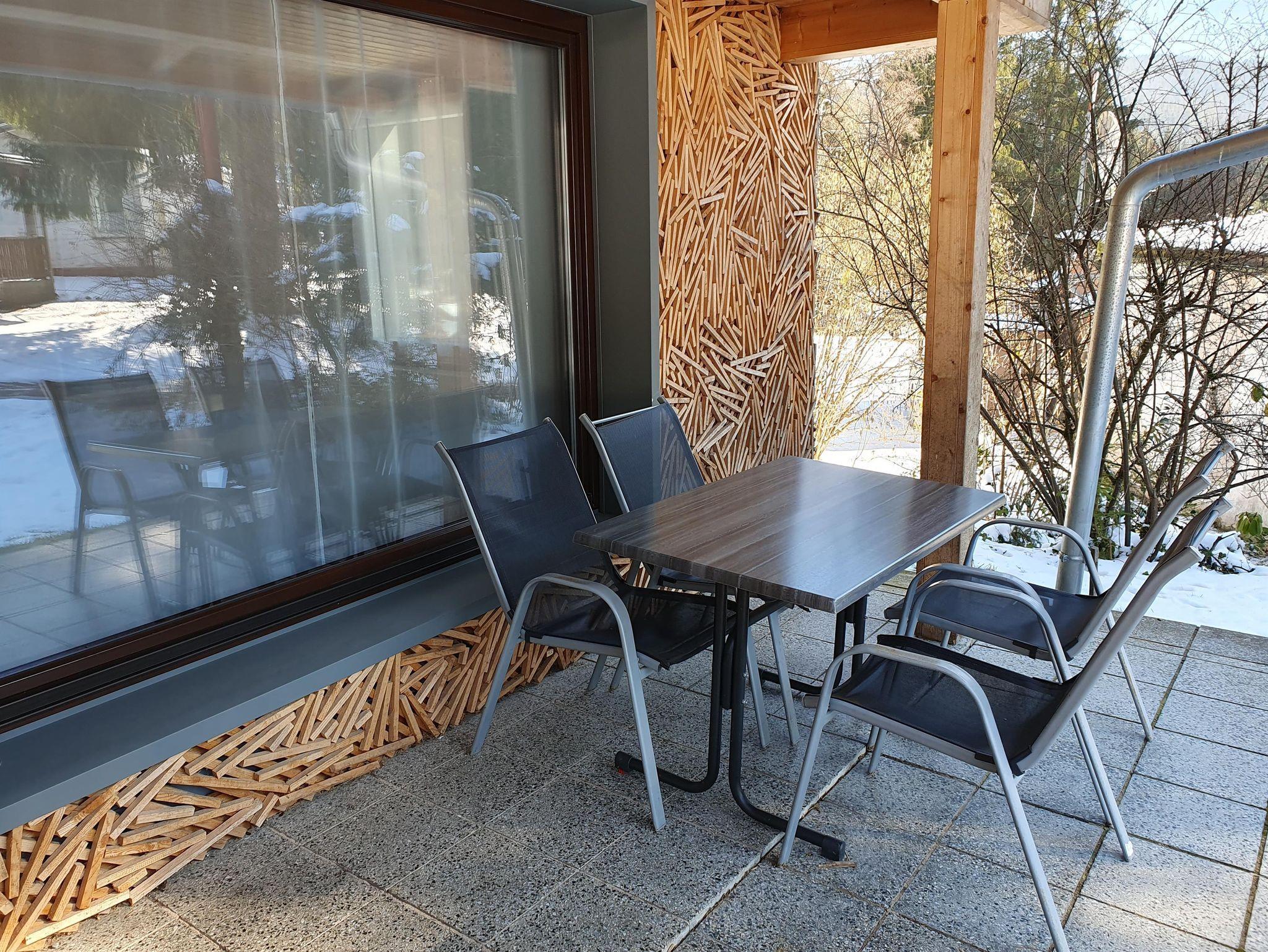 Die Terrasse ist überdacht und mit modernem Gartenmobiliar versehen. Der Bungalow ist baugleich mit dem Bungalow 278, nur spiegelbildlich errichtet. Die beiden Bungalows bilden zusammen ein Doppelhaus.