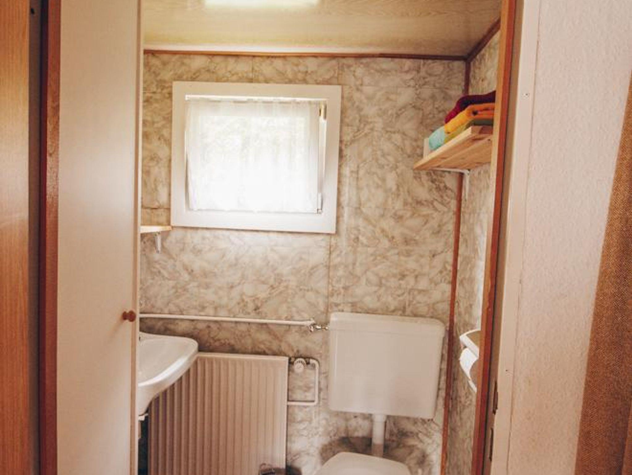 Es sind 5 Schlafmöglichkeiten vorhanden. Zwei Schlafzimmer, die durch eine Schiebetür getrennt sind, besitzen je ein Doppelbett. In einem getrennten Schlafraum befindet sich ein Einzelbett. Das Sofa im Wohnzimmer kann nötigenfalls als zusätzliche Aufbettung genutzt werden. Der Bungalow ist mit einem Bad mit WC ausgestattet. Eine Dusche verfügt der Bungalow nicht. Daher wird dieser preisgünstiger angeboten. Zum Duschen können die Gemeinschaftsanlagen des Campingplatzes genutzt werden. Vor dem Eingang befindet sich eine überdachte Terrasse.