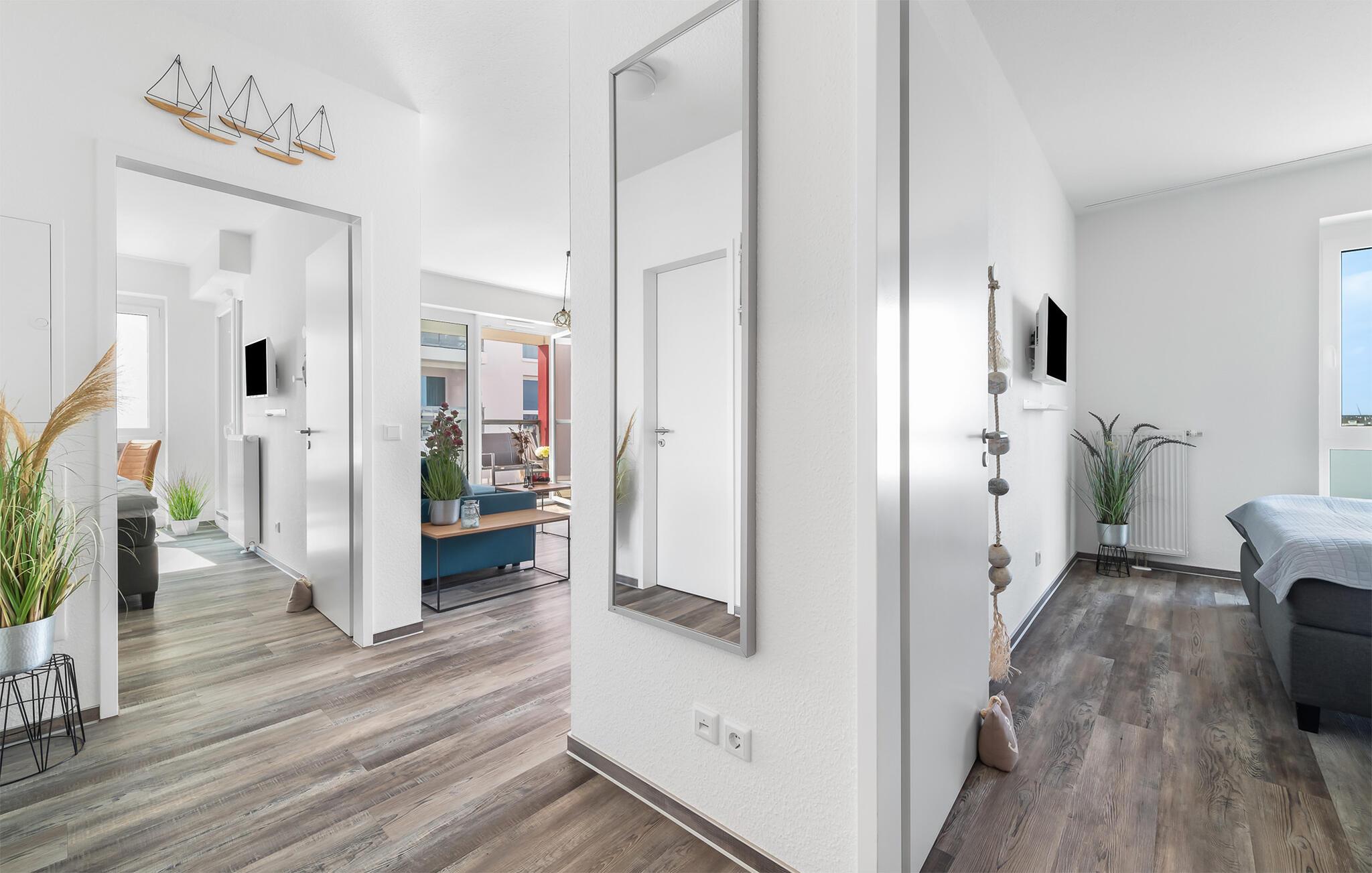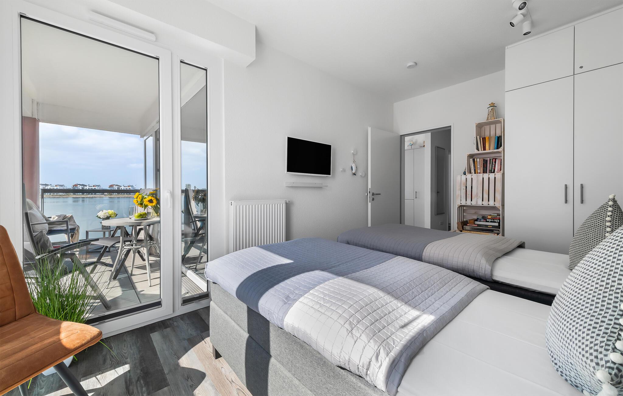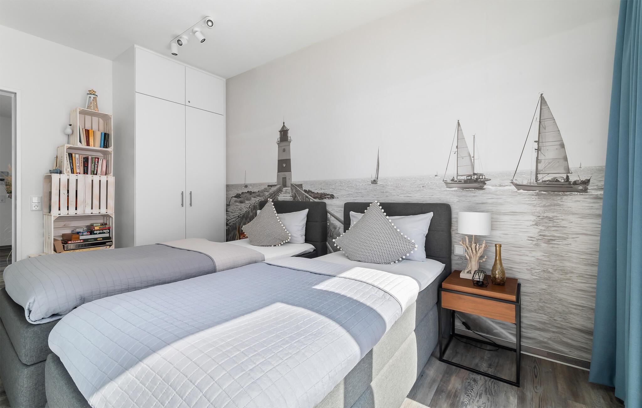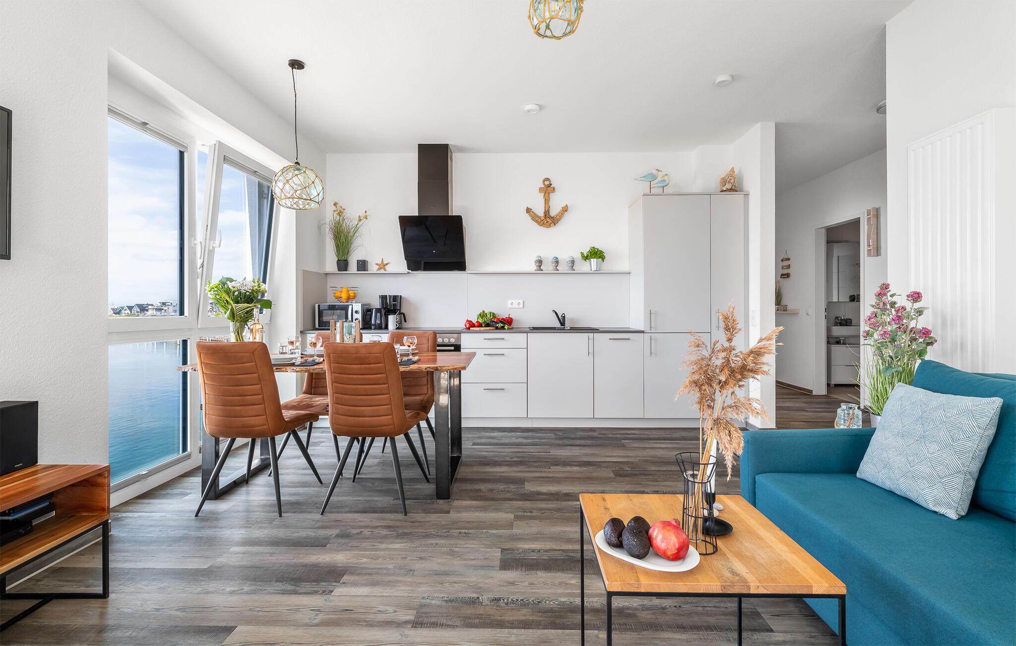 En speciell höjdpunkt i denna lägenhet är den hisnande vattenutsikten som du kan njuta av från alla rum. Balkongen är den perfekta platsen för att njuta av den friska havsluften och varva ner. Hela lägenhetens interiör kännetecknas av modern design och maritim mysighet, vilket skapar en elegant och hemtrevlig atmosfär. Dessutom gör duschen på golvnivå och hissen en barriärfri vistelse möjlig.