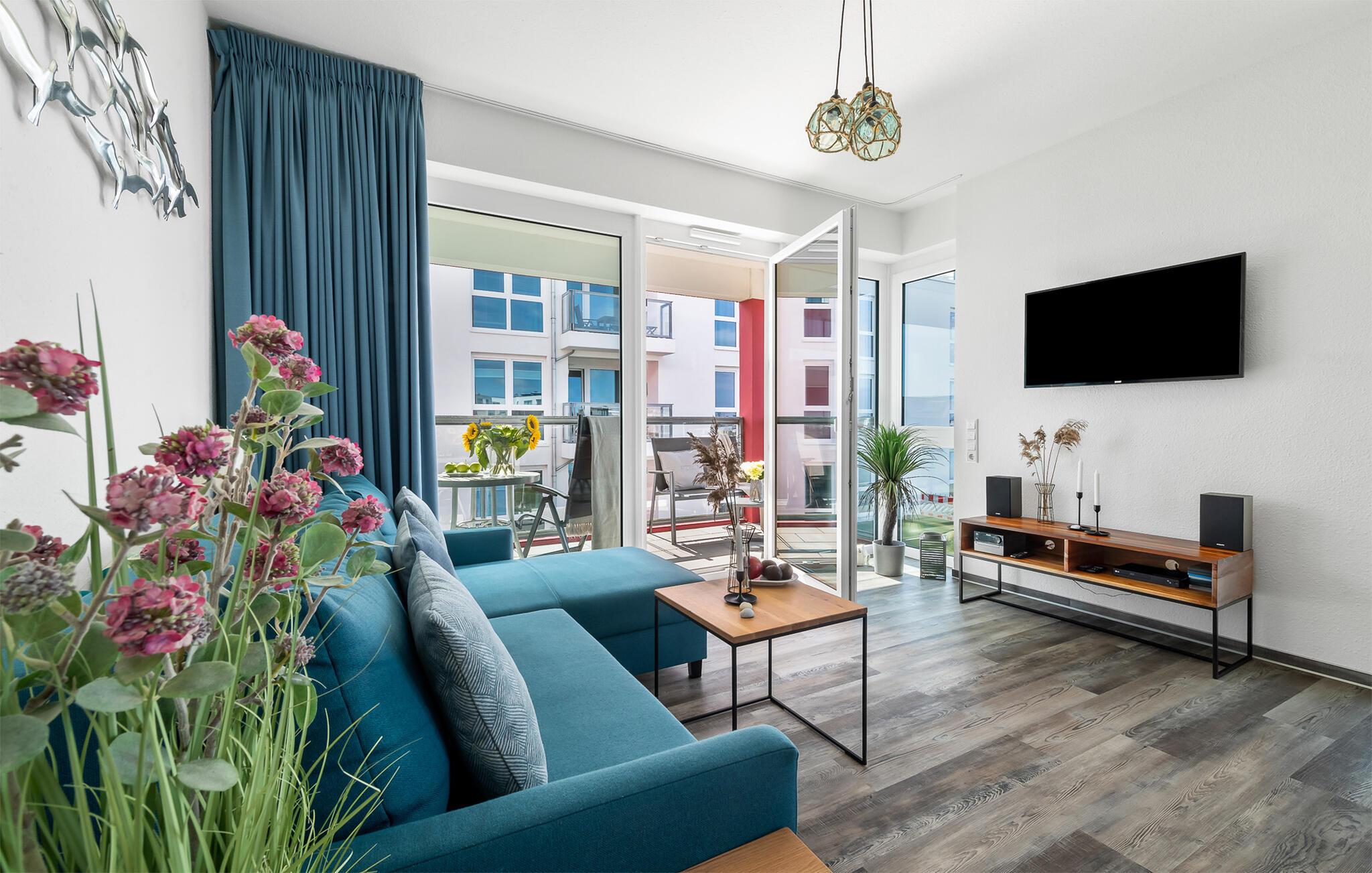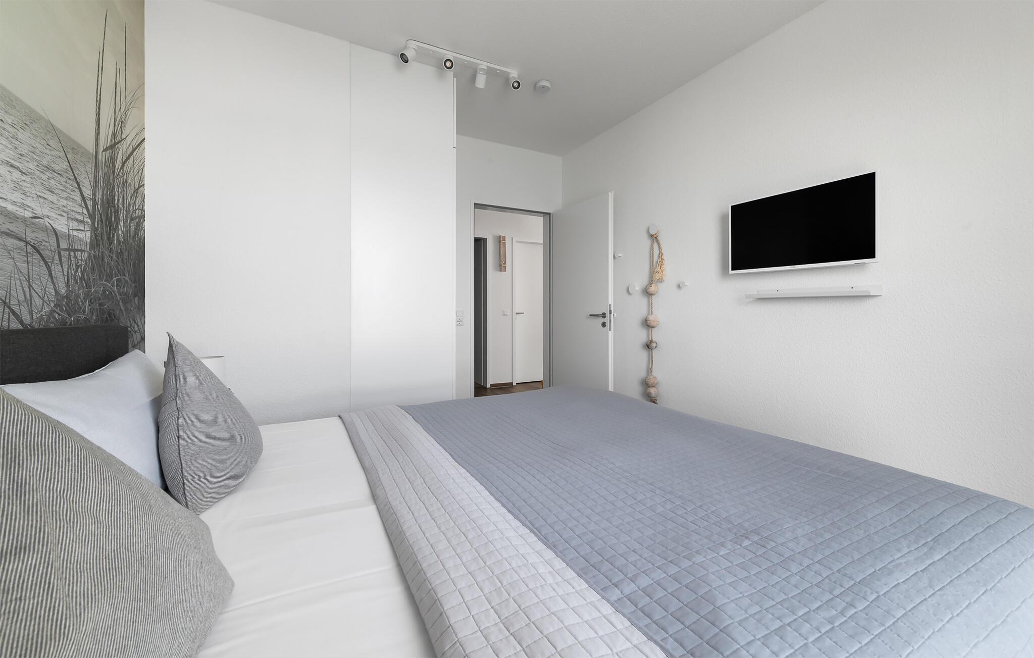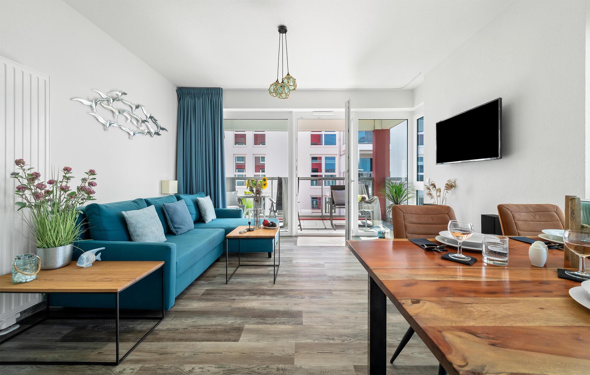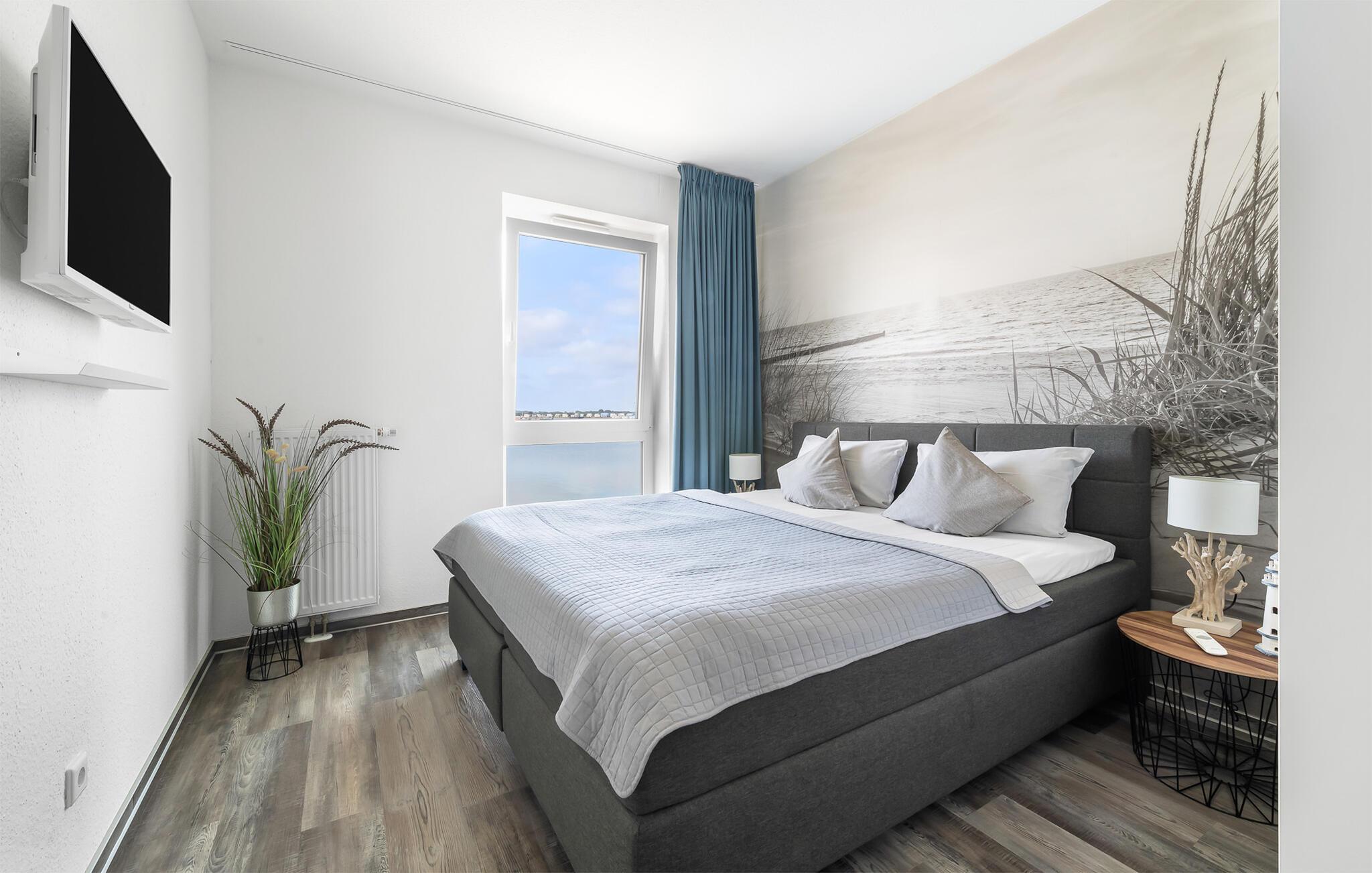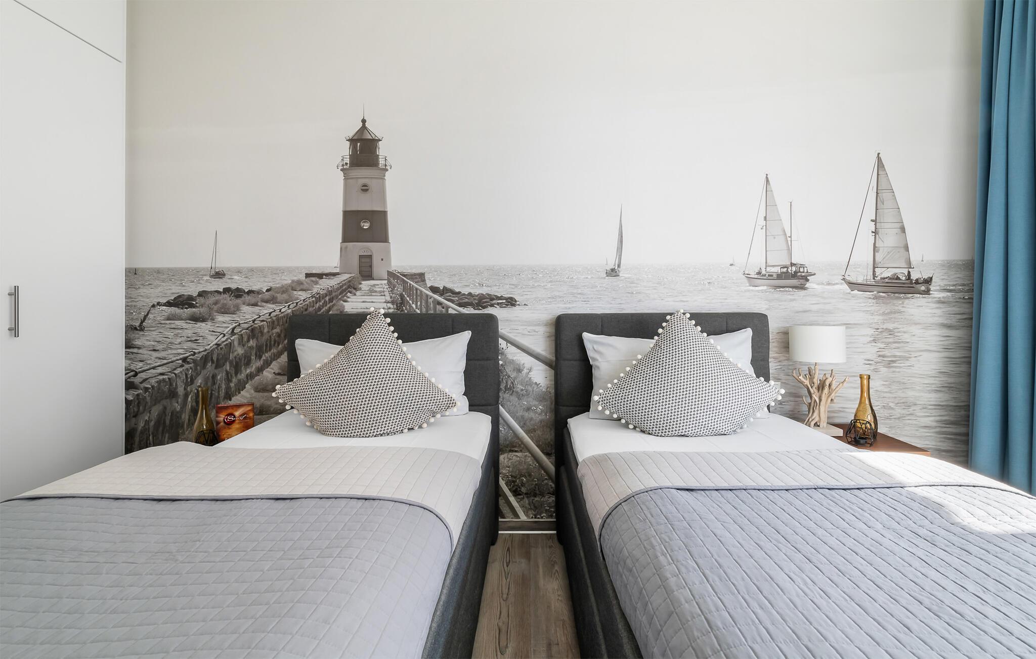 En speciell höjdpunkt i denna lägenhet är den hisnande vattenutsikten som du kan njuta av från alla rum. Balkongen är den perfekta platsen för att njuta av den friska havsluften och varva ner. Hela lägenhetens interiör kännetecknas av modern design och maritim mysighet, vilket skapar en elegant och hemtrevlig atmosfär. Dessutom gör duschen på golvnivå och hissen en barriärfri vistelse möjlig.