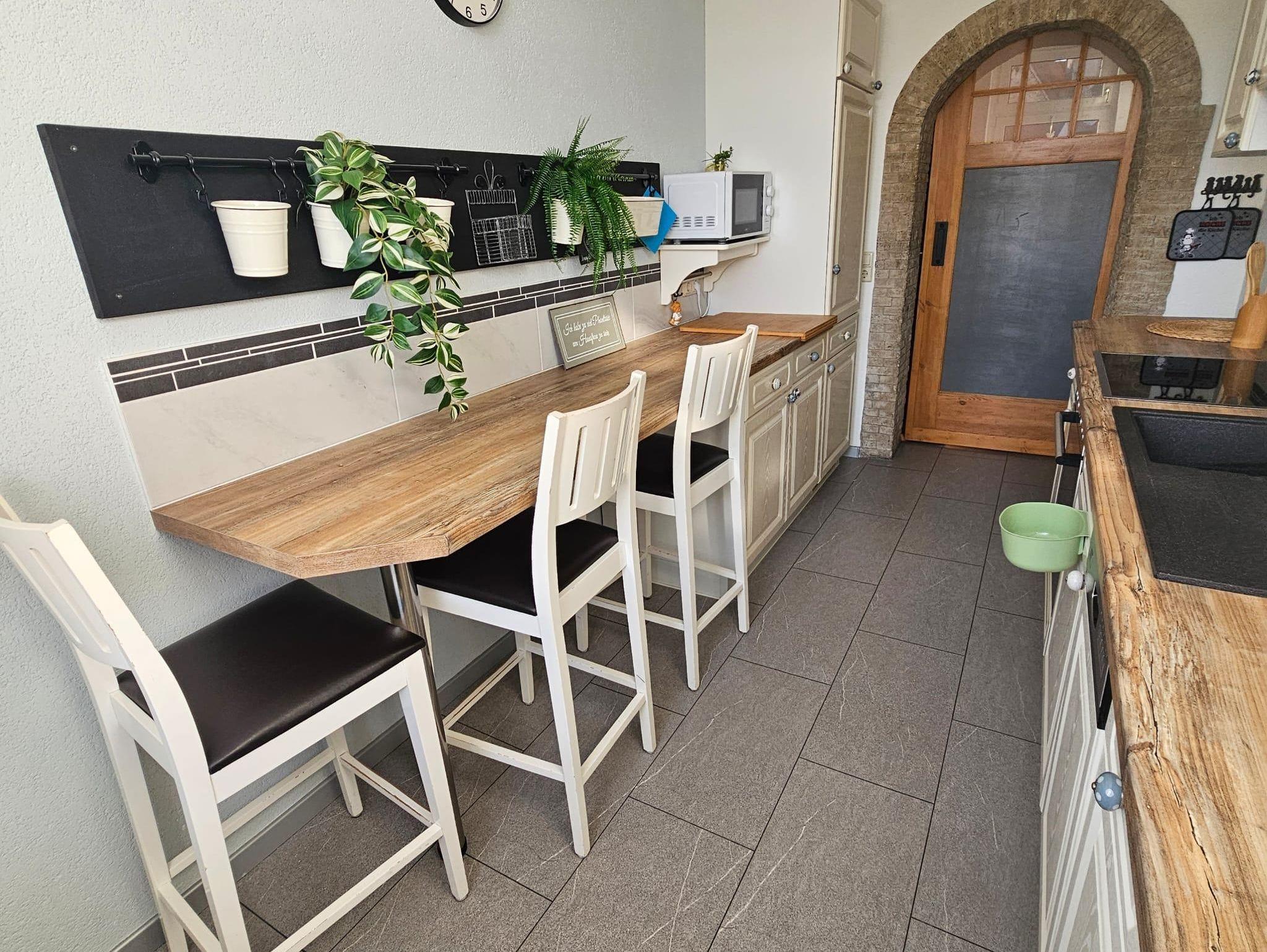 Die Küche ist voll ausgestattet. (Kühlschrank, Gefrierfach, Kaffemaschine, Toaster, Wasserkocher, Herd, Mikrowelle)
