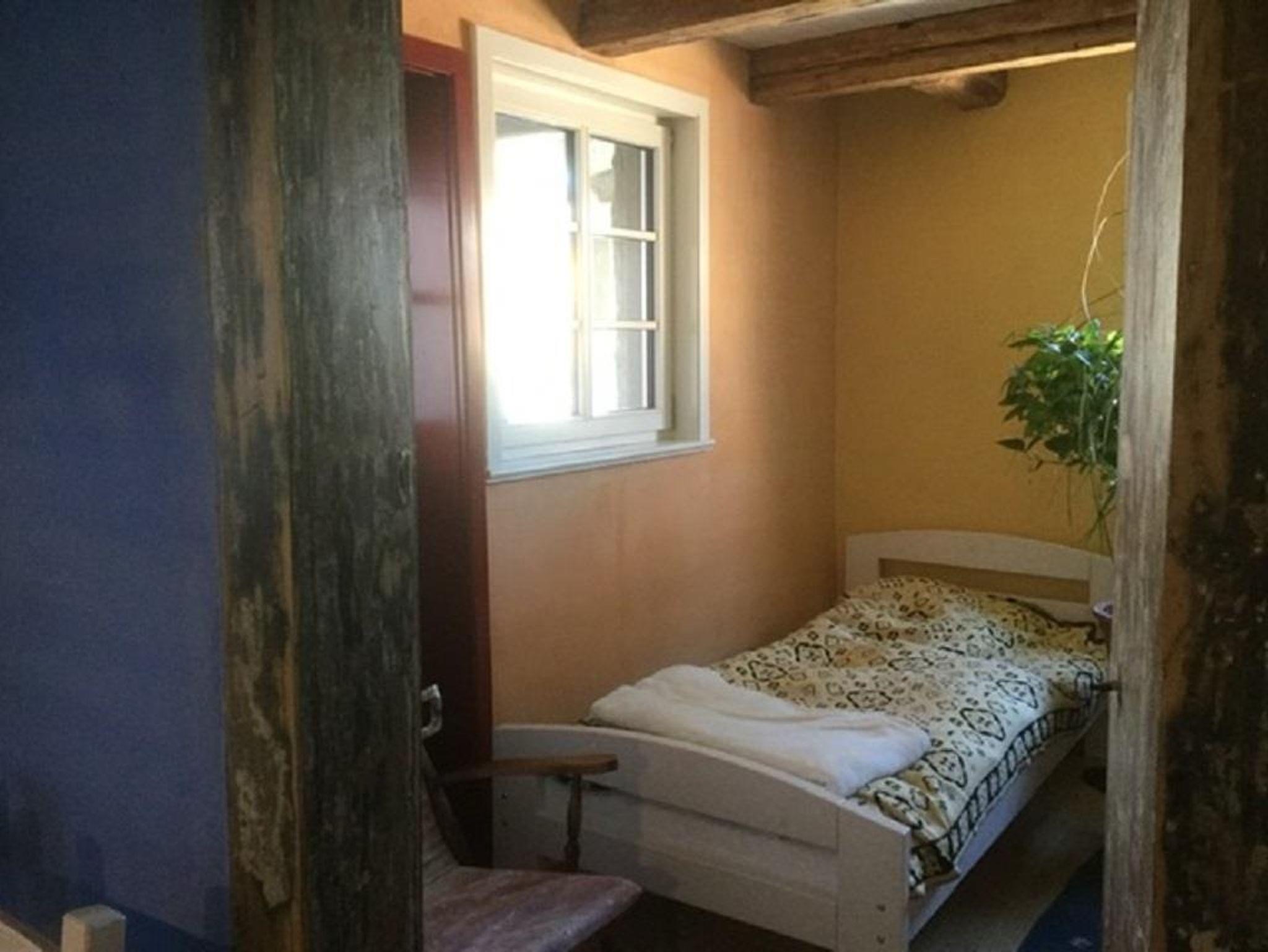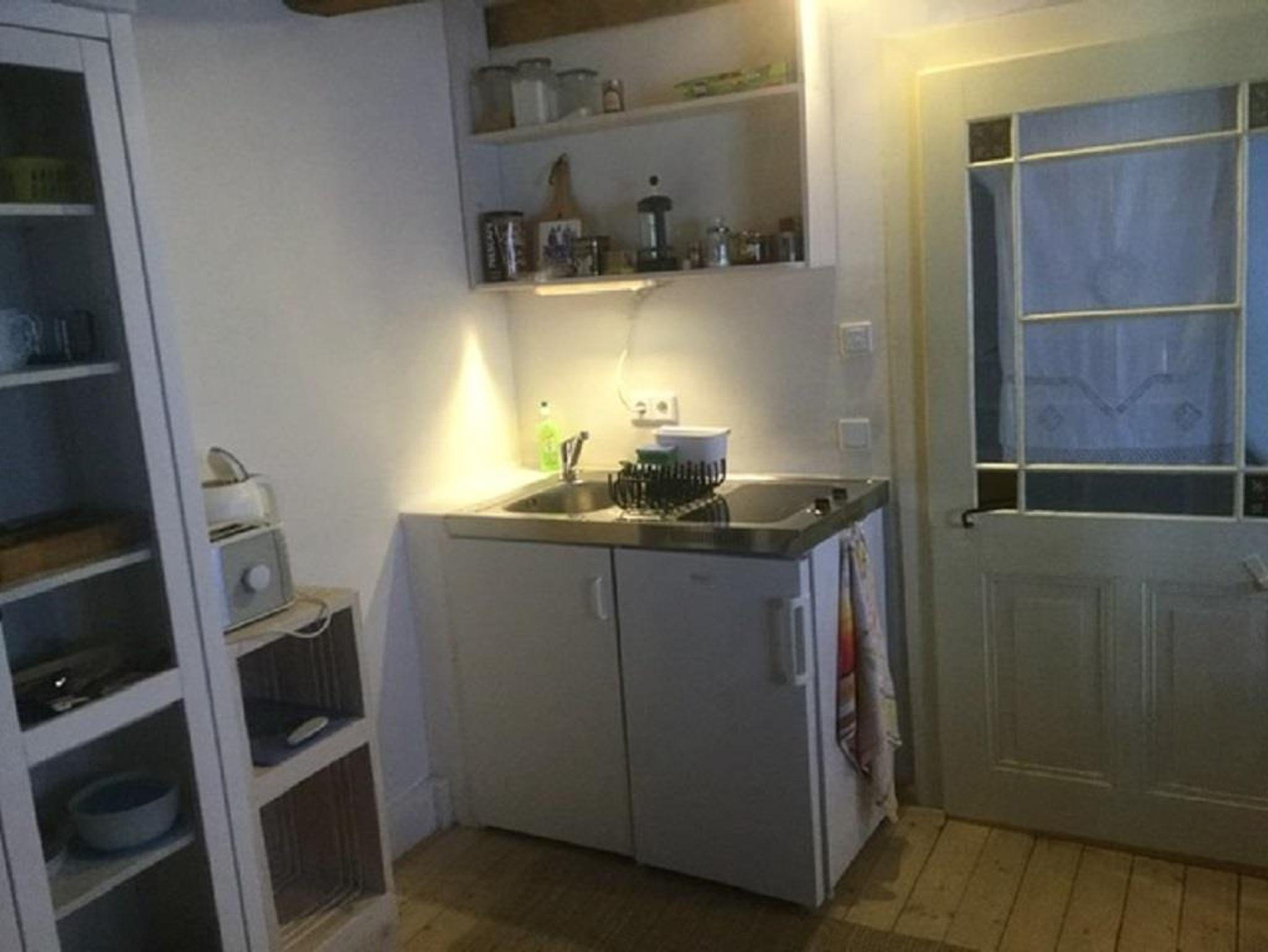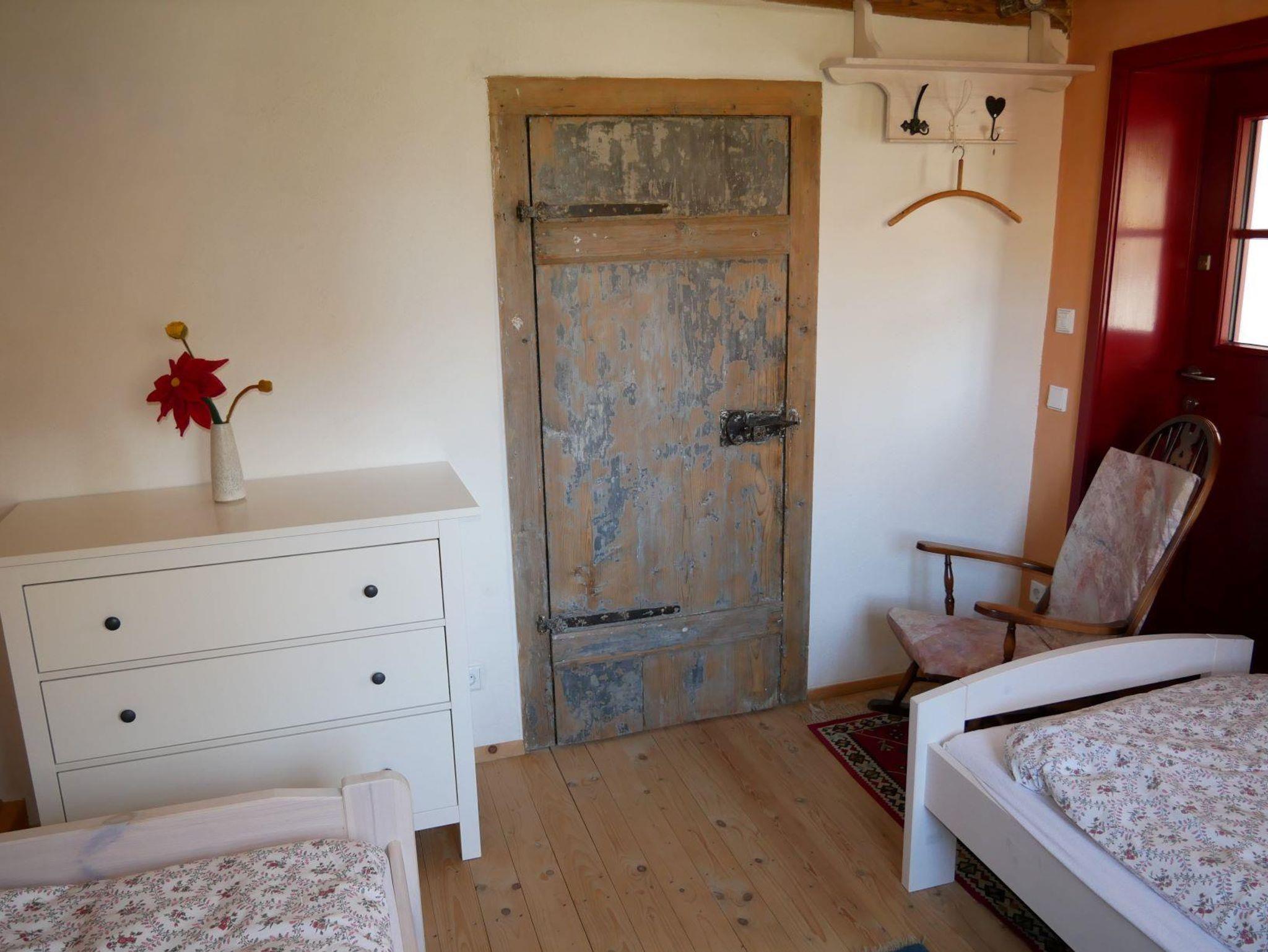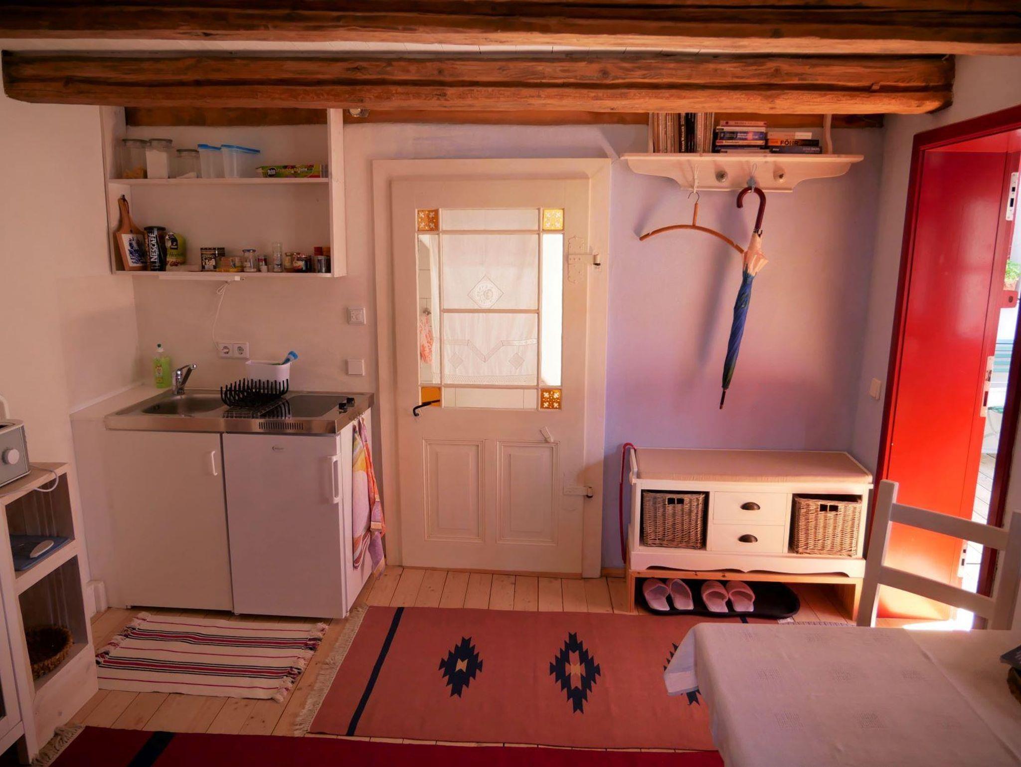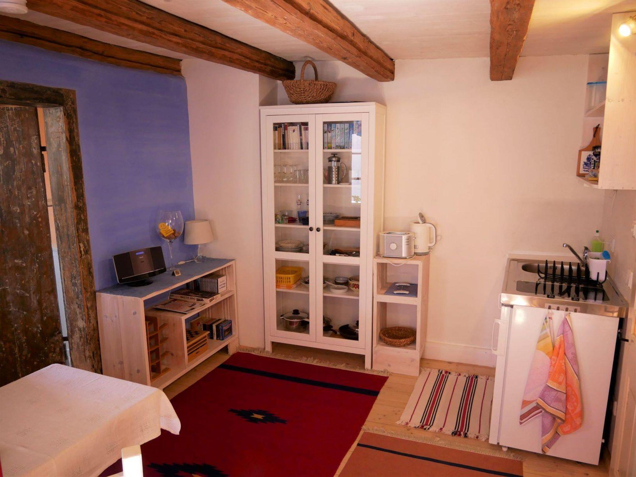 „Bachmanns Witwe“ ist eine kleine Ferienwohnung mit 28 m² für zwei Personen. Sie haben ein Schlafzimmer mit zwei einzelnen Betten und einen Wohnraum mit Sitzplatz, Miniküchenzeile mit Kochfeld und Kühlschrank sowie einen Schrank voller Kochutensilien, Kaffe- und Teekanne, Geschirr und Besteck. Zu Ihrer Verfügung stehen Toaster und Wasserkocher sowie ein Radio.