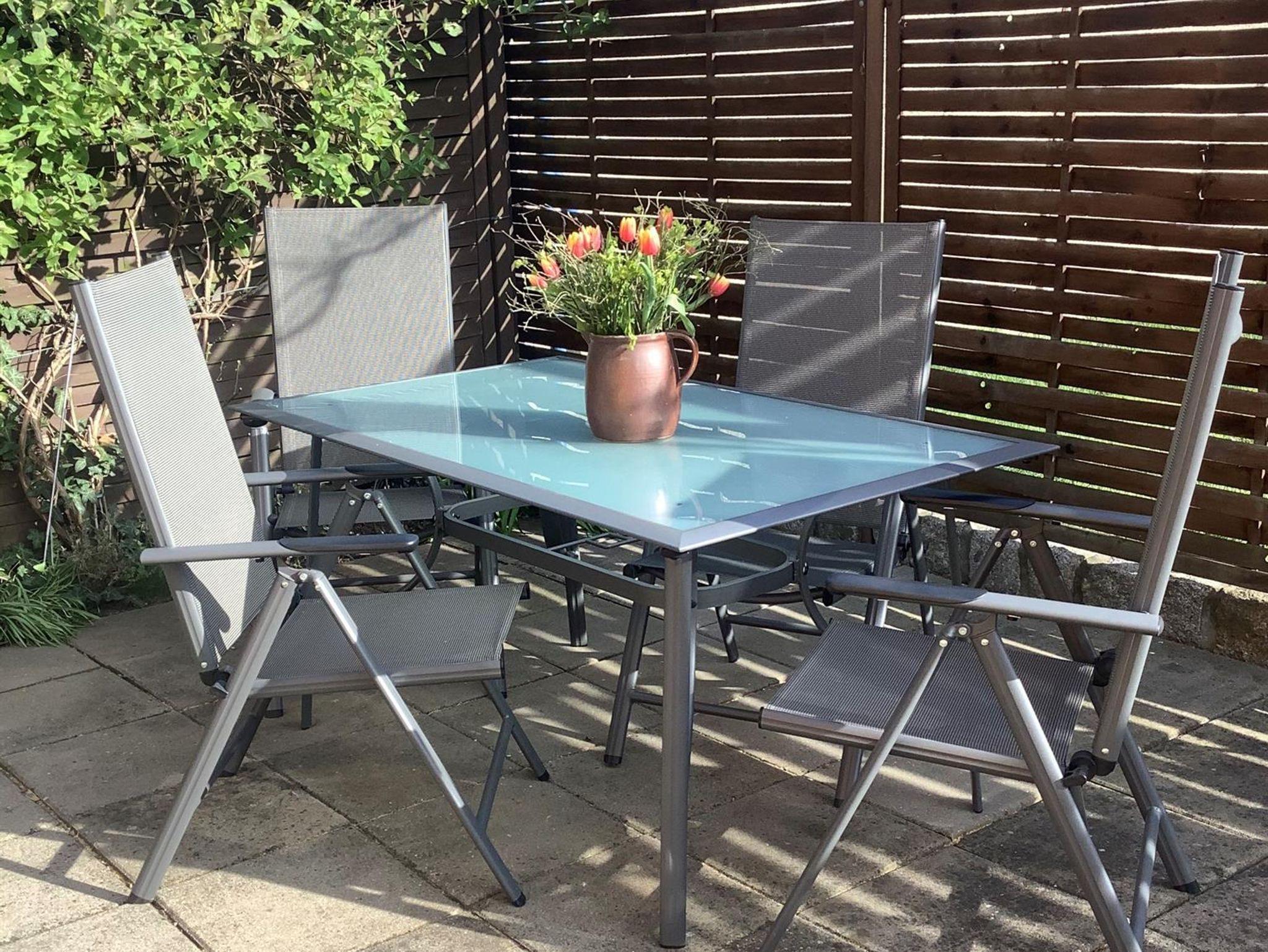 Die gepflegte Sitzecke im Freien lädt zum Verweilen ein. Sollten Sie Fahrräder mitbringen, so können sie diese regensicher unterstellen.