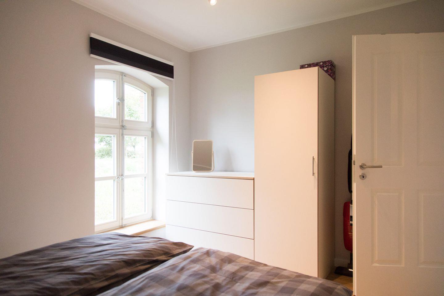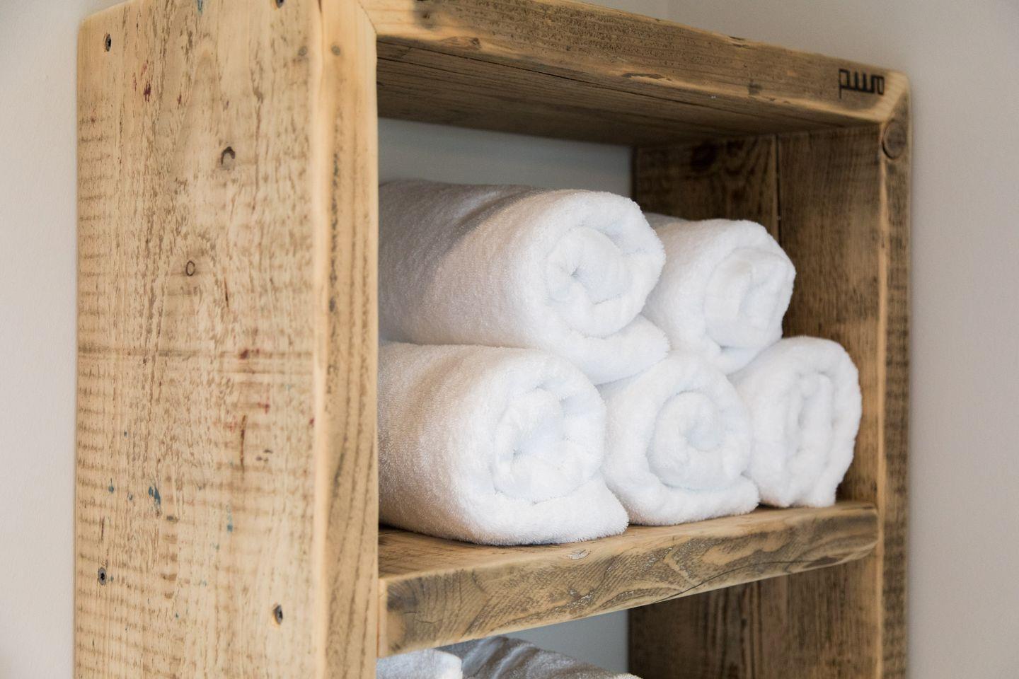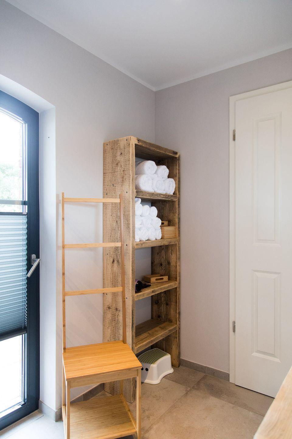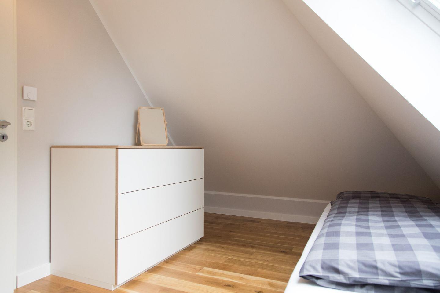 Für eine ungestörte und erholsame Nachtruhe ist das Obergeschoss den zwei Schlafzimmern vorbehalten. Neben dem Zimmer mit Doppelbett gibt es einen Schlafraum mit zwei Einzelbetten. Auch ein Kinderbett ist vorhanden. Durch die Dachfenster fällt das Licht von Mond und Sternen vom klaren Nordseehimmel. Dank Fliegenschutz kannst du jederzeit ausgiebig lüften – ebenso wie im Badezimmer. Dieses begeistert dank eigener Terrassentür nicht nur mit natürlichem Licht, sondern auch mit vielen Naturholz-Elementen und großzügigen Ablagemöglichkeiten.