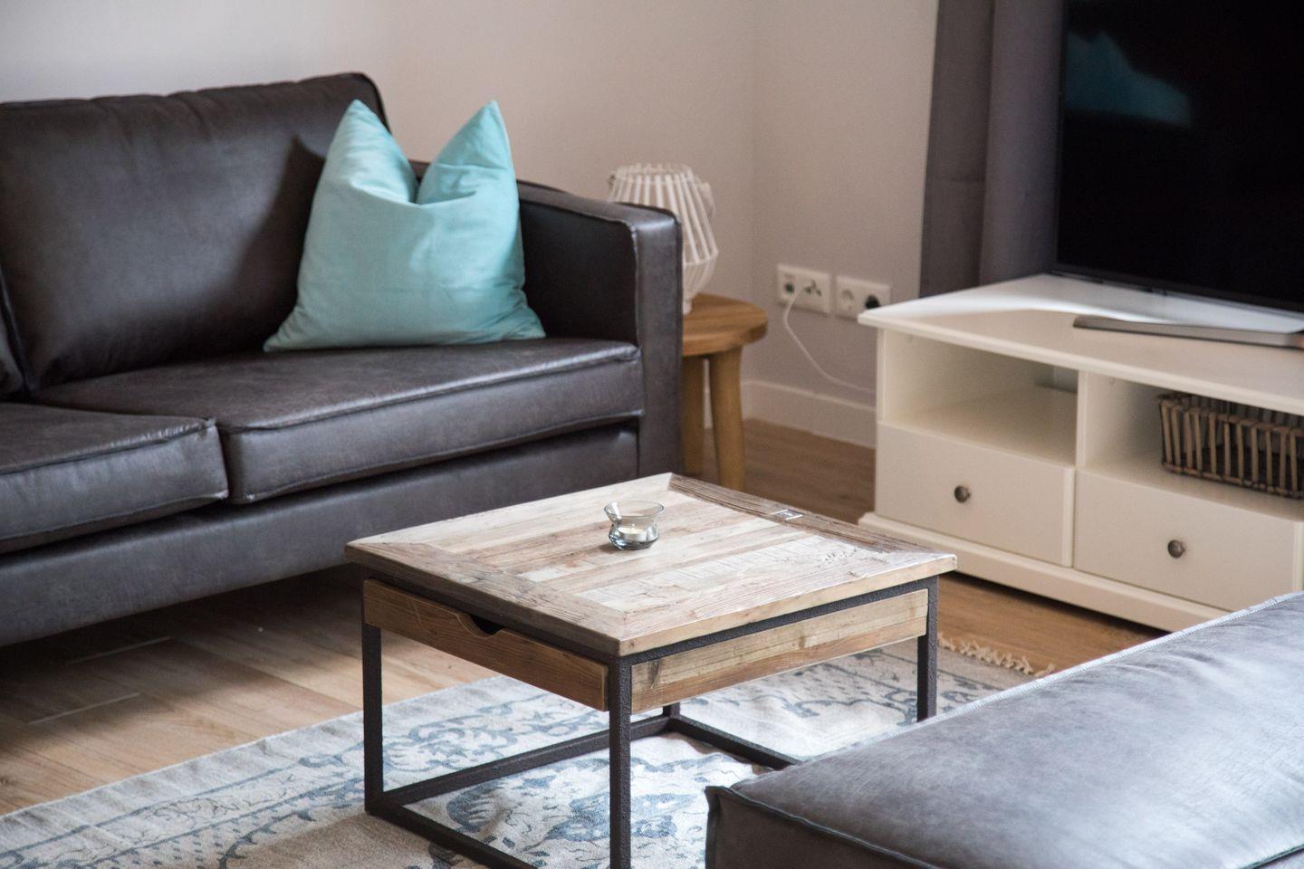 Die offene Wohnküche ist ein echtes Highlight. Hier erwartet Sie eine voll ausgestattete Küche mit modernen Annehmlichkeiten wie einem Ceranherd, einer Mikrowelle, einem Kühlschrank mit Gefrierfach und sogar einer Espressomaschine – ideal für einen perfekten Start in den Tag. Der Essbereich und die Sofaecke im Wohnzimmer laden zum gemeinsamen Verweilen und geselligen Beisammensein ein. Genießen Sie beim Kochen und Essen die moderne Einrichtung und die behagliche Atmosphäre, die der Gulfhof Dreybült 2 Aiko ausstrahlt.