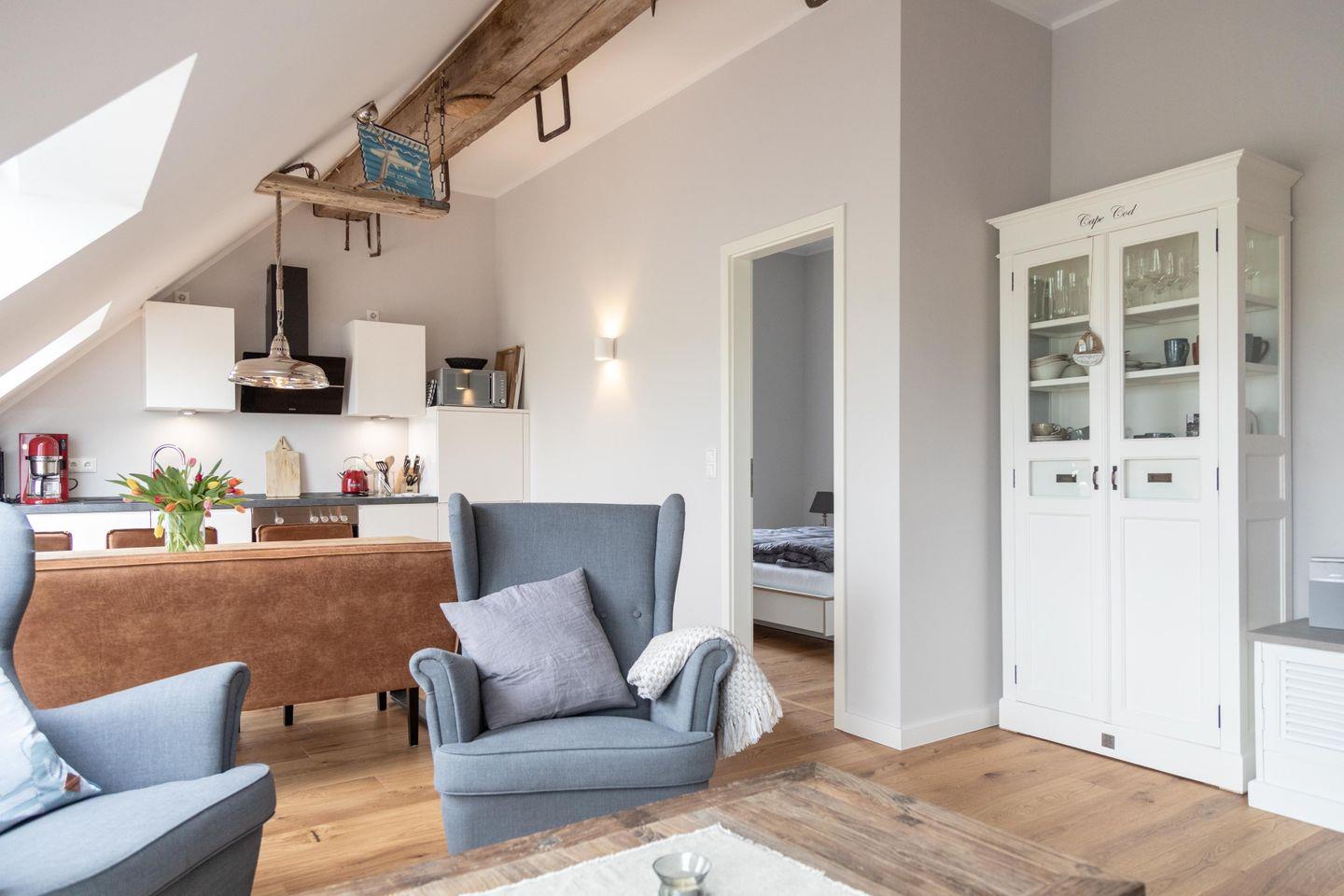 Im ersten Obergeschoss bildet der großzügige lichtdurchflutete Wohn- und Essbereich mit Küchenzeile das gemütliche Herz der Wohnung. Die vollausgestattete Küche lässt mit hochwertigem Geschirr, Mikrowelle und KitchenAid-Geräten keine Wünsche offen. An den einladenden Essbereich mit handgefertigtem Tisch und bequemen Lederstühlen schließt sich die heimelige Sofa-Ecke an: Sowohl von der extralangen Ledercouch als auch von den beiden Sesseln fällt der Blick durch das große Fenster auf den nahen Deich. Im Sommer lassen sich die Dachflächenfenster zu kleinen Balkonen öffnen.