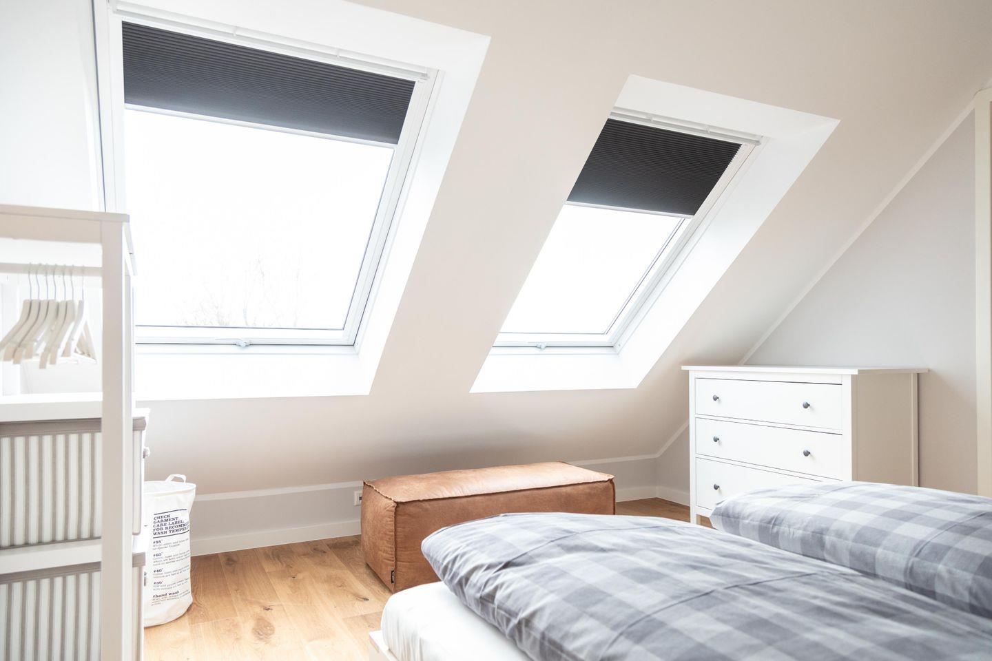 Auf derselben Etage befinden sich außerdem ein Schlafzimmer mit Doppelbett sowie ein Bad mit Dusche. Weitere Schlafmöglichkeiten findest du im Dachgeschoss: Dort gibt es ein Schlafzimmer mit einem Doppelbett sowie ein weiteres mit zwei Einzelbetten. Alle Betten wurden von einem Schreiner aus der Region gefertigt und sorgen mit bequemen Matratzen und hautsympathischem Bettzeug für süße Träume. Das Bad im Dachgeschoss präsentiert sich mit Dusche und Eck-Badewanne als kleiner Wellnessbereich.