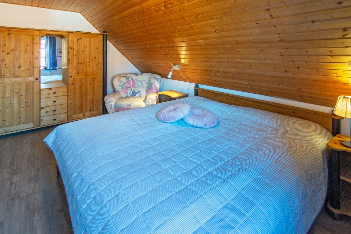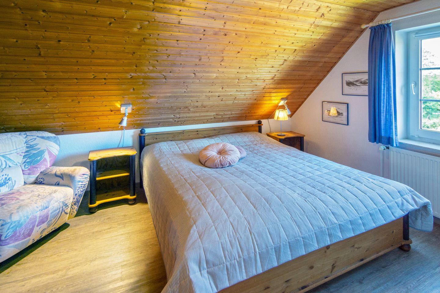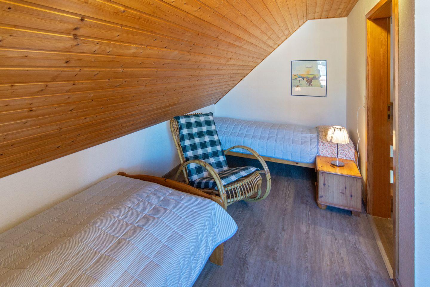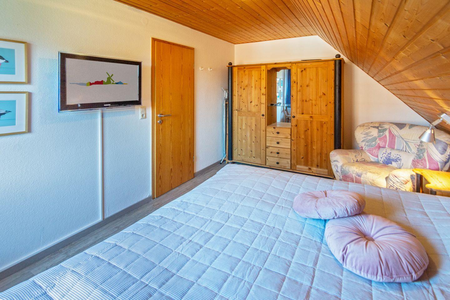 Im Obergeschoss befinden sich zwei Schlafzimmer mit pflegeleichtem Bodenbelag; das ausgebaute Dachgeschoss bietet zwei weitere Einzelbetten. Für die Kleinsten sind Babybett, Hochstuhl und Spielzeug vorhanden. Das Tageslichtbad verfügt über Dusche und WC. Fliegengitter und Rauchmelder sorgen für Sicherheit und Wohlbefinden.