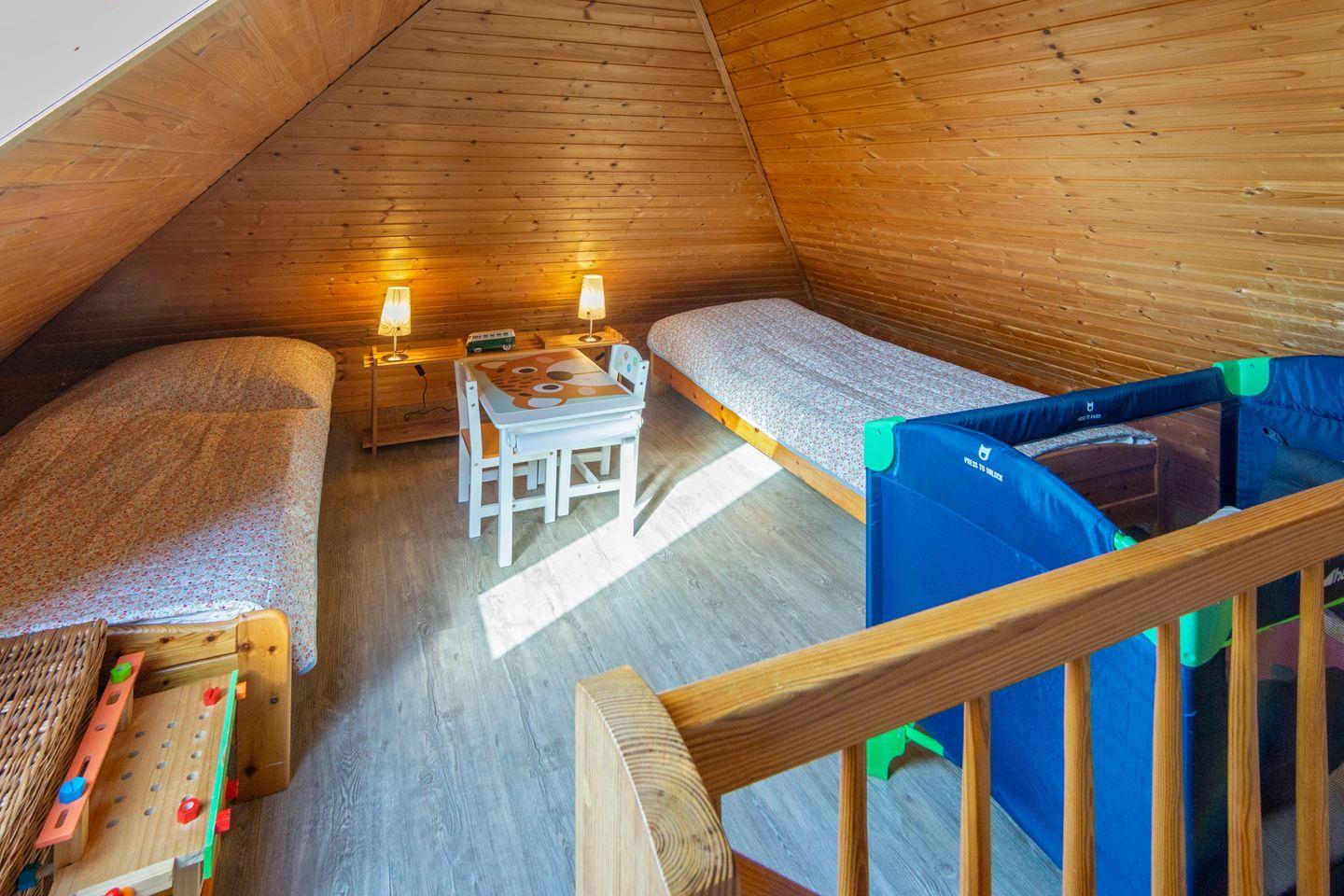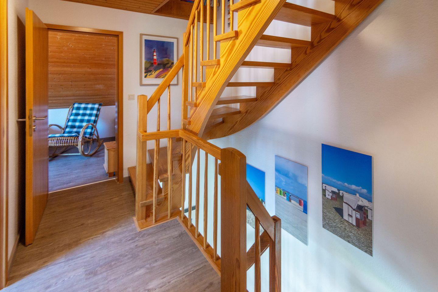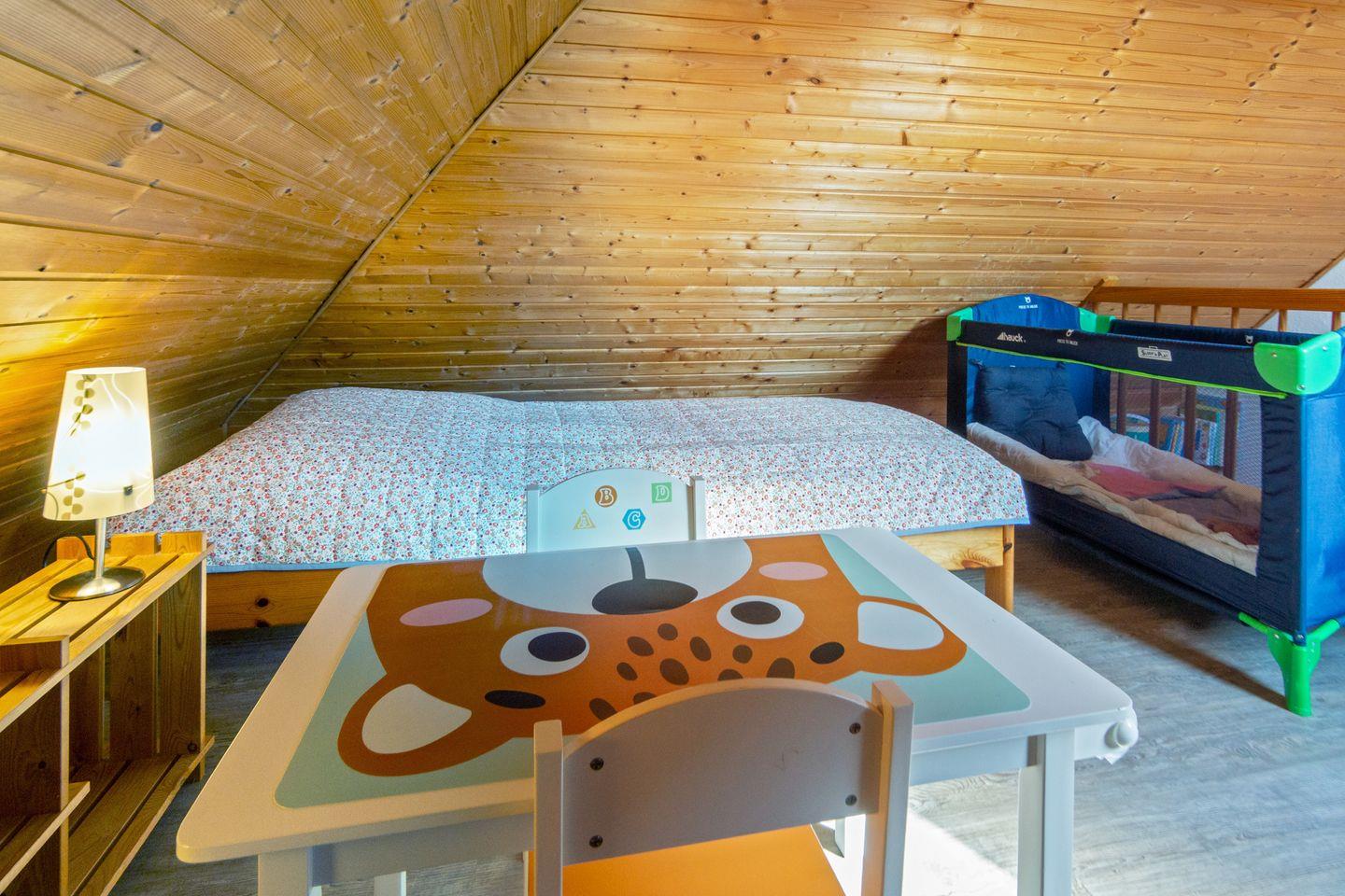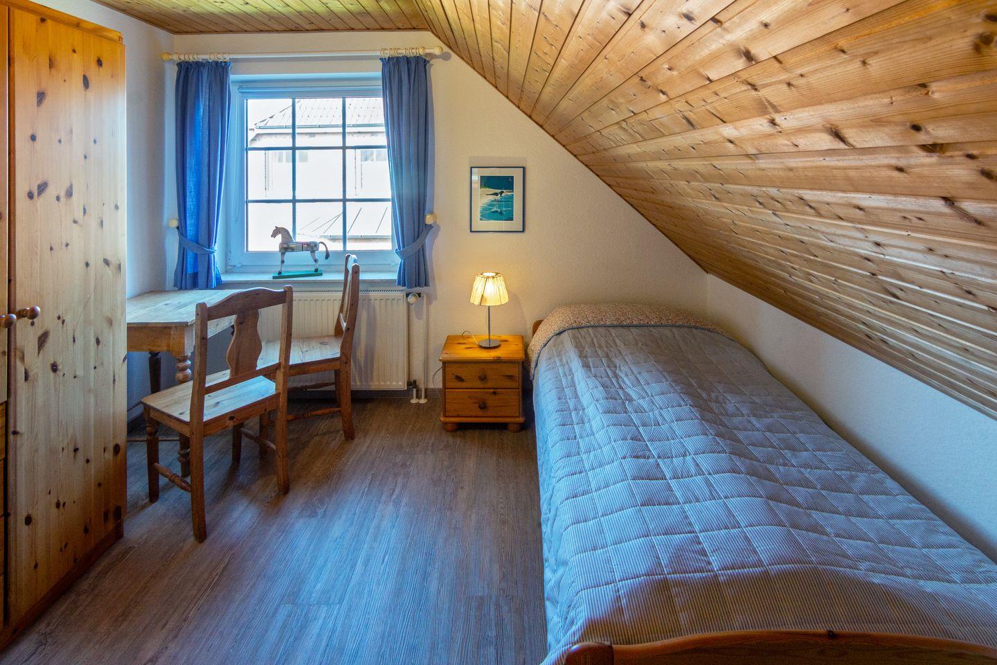 Im Obergeschoss befinden sich zwei Schlafzimmer mit pflegeleichtem Bodenbelag; das ausgebaute Dachgeschoss bietet zwei weitere Einzelbetten. Für die Kleinsten sind Babybett, Hochstuhl und Spielzeug vorhanden. Das Tageslichtbad verfügt über Dusche und WC. Fliegengitter und Rauchmelder sorgen für Sicherheit und Wohlbefinden.