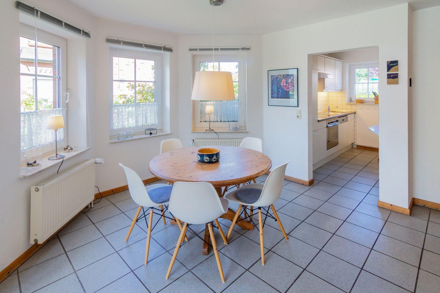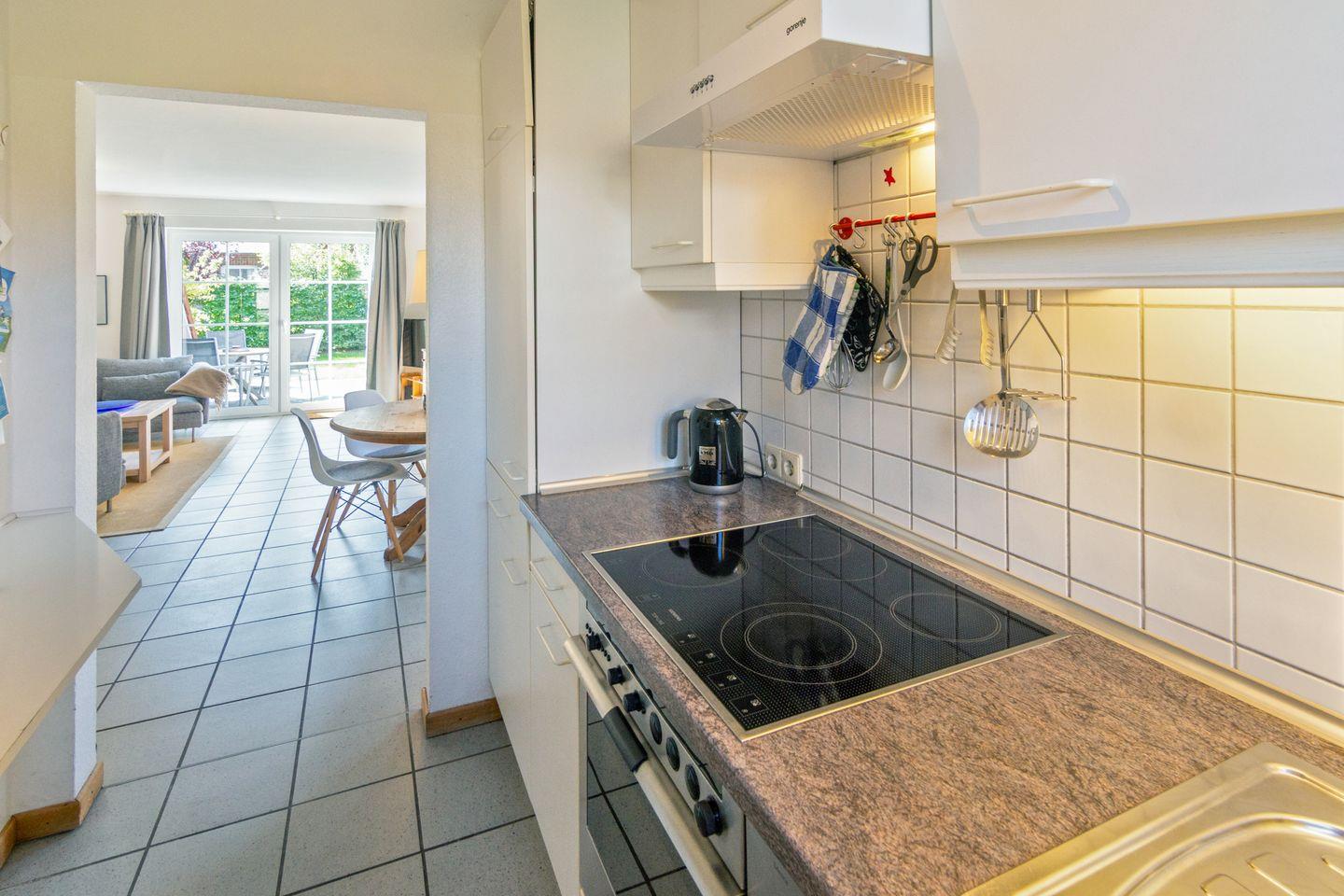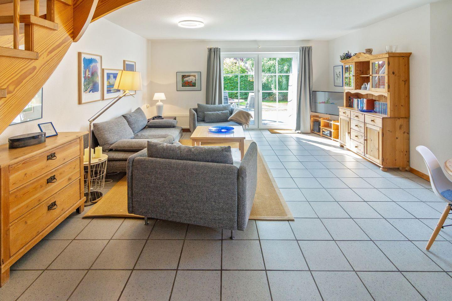 Der helle Wohnbereich im Erdgeschoss überzeugt mit gemütlicher Couch, zwei SAT-TVs, CD-Player, HiFi-Anlage und kostenfreiem WLAN. Die angrenzende, offene Küche ist voll ausgestattet – mit Cerankochfeld, Backofen, Mikrowelle, Spülmaschine, Kaffeemaschine, Toaster, Mixer und mehr. Am großen Esstisch genießt die ganze Familie gemeinsame Mahlzeiten. Ein Gäste-WC, Garderobe sowie Waschmaschine, Bügeleisen und Staubsauger sorgen für zusätzlichen Komfort.