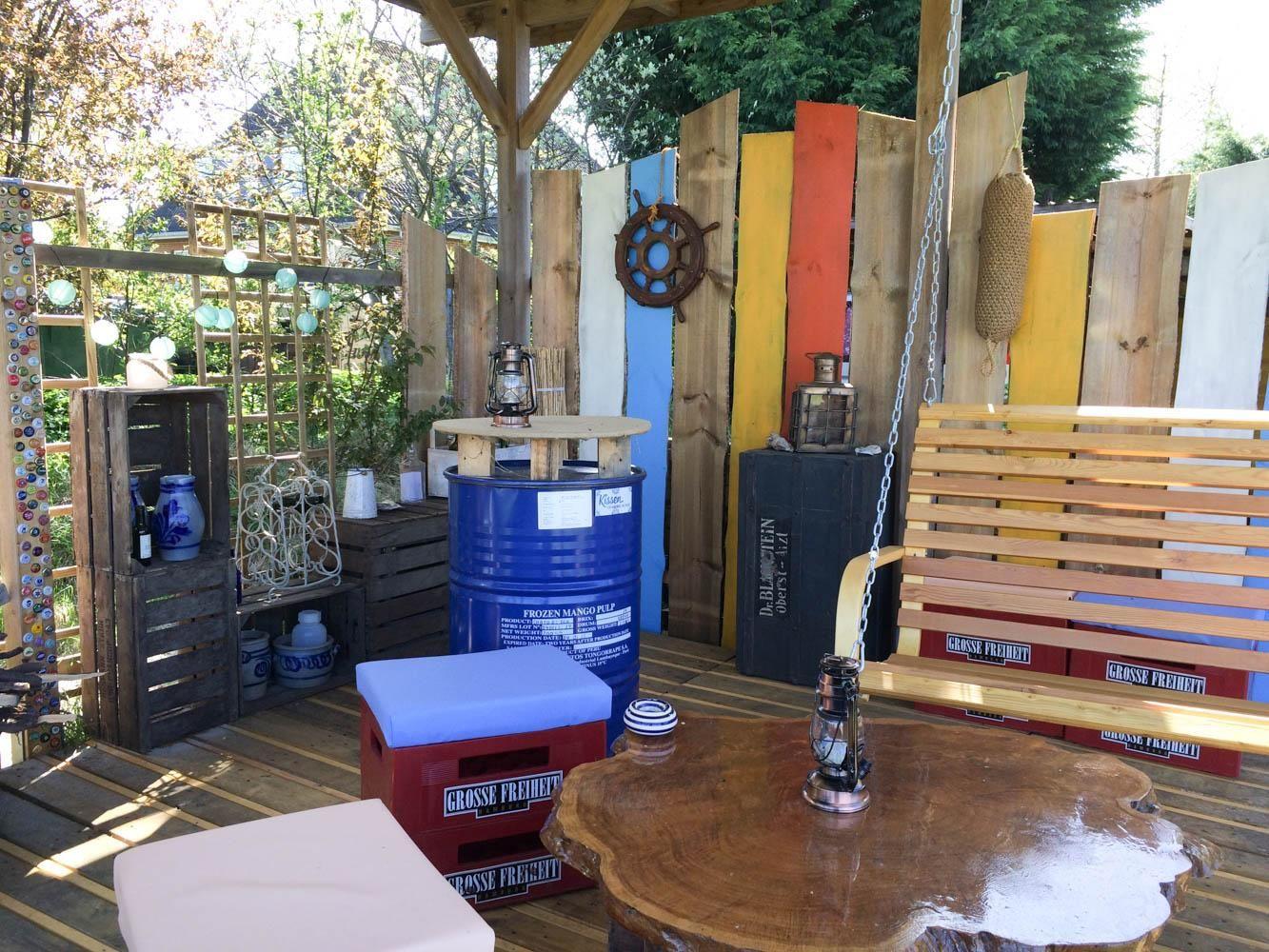 Als weitere Attraktion finden Sie im Garten den „Hasenbaudraufschaubau“: Eine großzügige, überdachte Sitzmöglichkeit mit Hängeschaukel, Stromanschluss und funktionierendem Ofen.