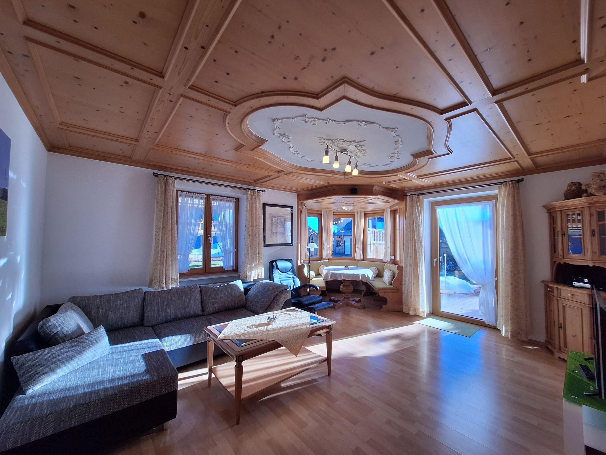 Wunderschöne neumöblierte 3-Zimmer-Familienferienwohnung Oberstdorf im Erdgeschoß mit Erker, großer Balkon (Blick zur Alpspitz) und zusätzliche, große Terrasse, 2 separate Schlafzimmer, extra Ankleidezimmer, Ess- und Sitzecke, Badewanne und Dusche, separates WC, Sat-TV, vollausgestattete Küche.