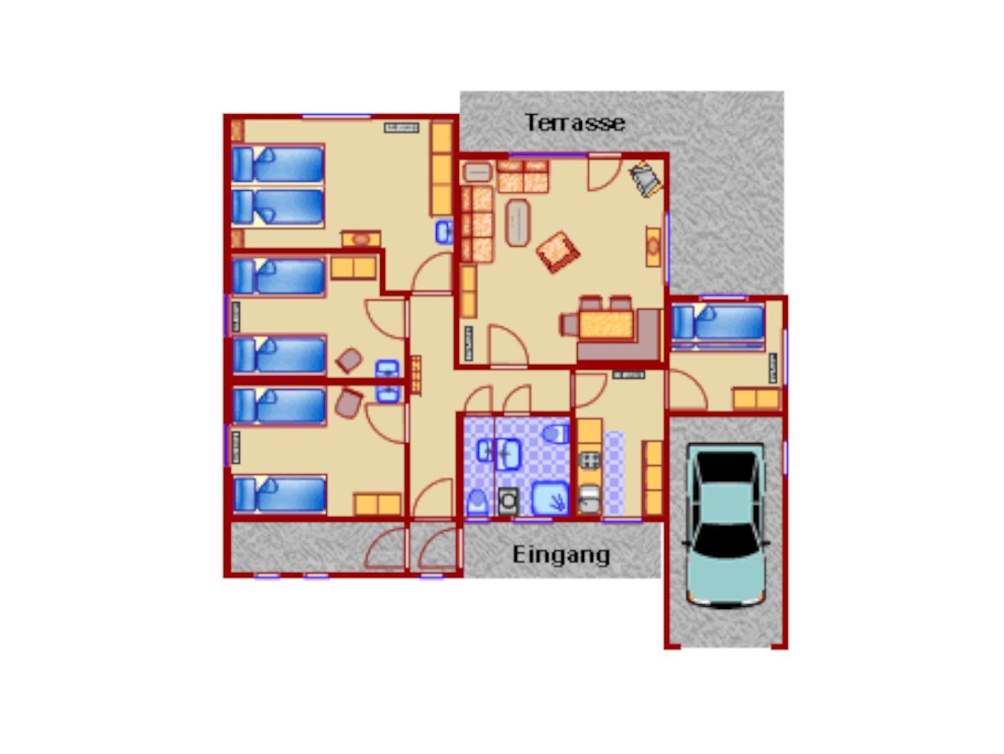Vier Schlafzimmer bieten komfortable Schlafmöglichkeiten. Ein Schlafzimmer ist mit einem Doppelbett ausgestattet, zwei weitere verfügen jeweils über zwei Einzelbetten und ein weiteres Zimmer über ein Etagenbett. Das Badezimmer bietet eine große Dusche, Waschtisch und WC, ergänzt durch ein separates Gäste-WC.