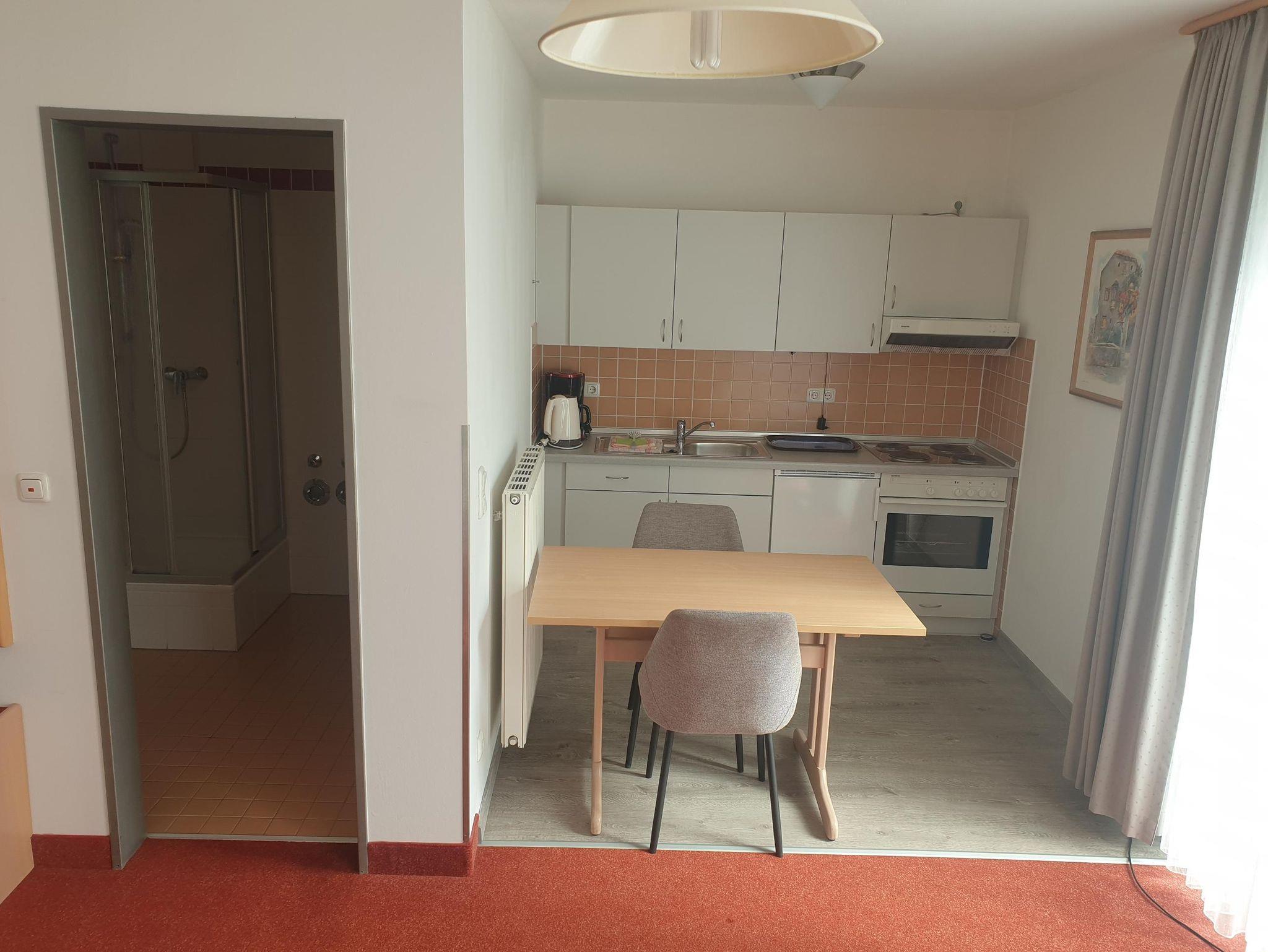 Kombinierter Wohn- und Schlafraum mit Doppelbett, gemütlicher Sitzecke, SAT-TV, Radio, Telefon, sowie freies W-Lan. Das Appartement verfügt über eine komplett ausgestattete Küche und Bad mit Dusche, WC und Föhn. Balkon oder Terrasse mit Blick zur kleinen Kappl verfügbar (Südseite).