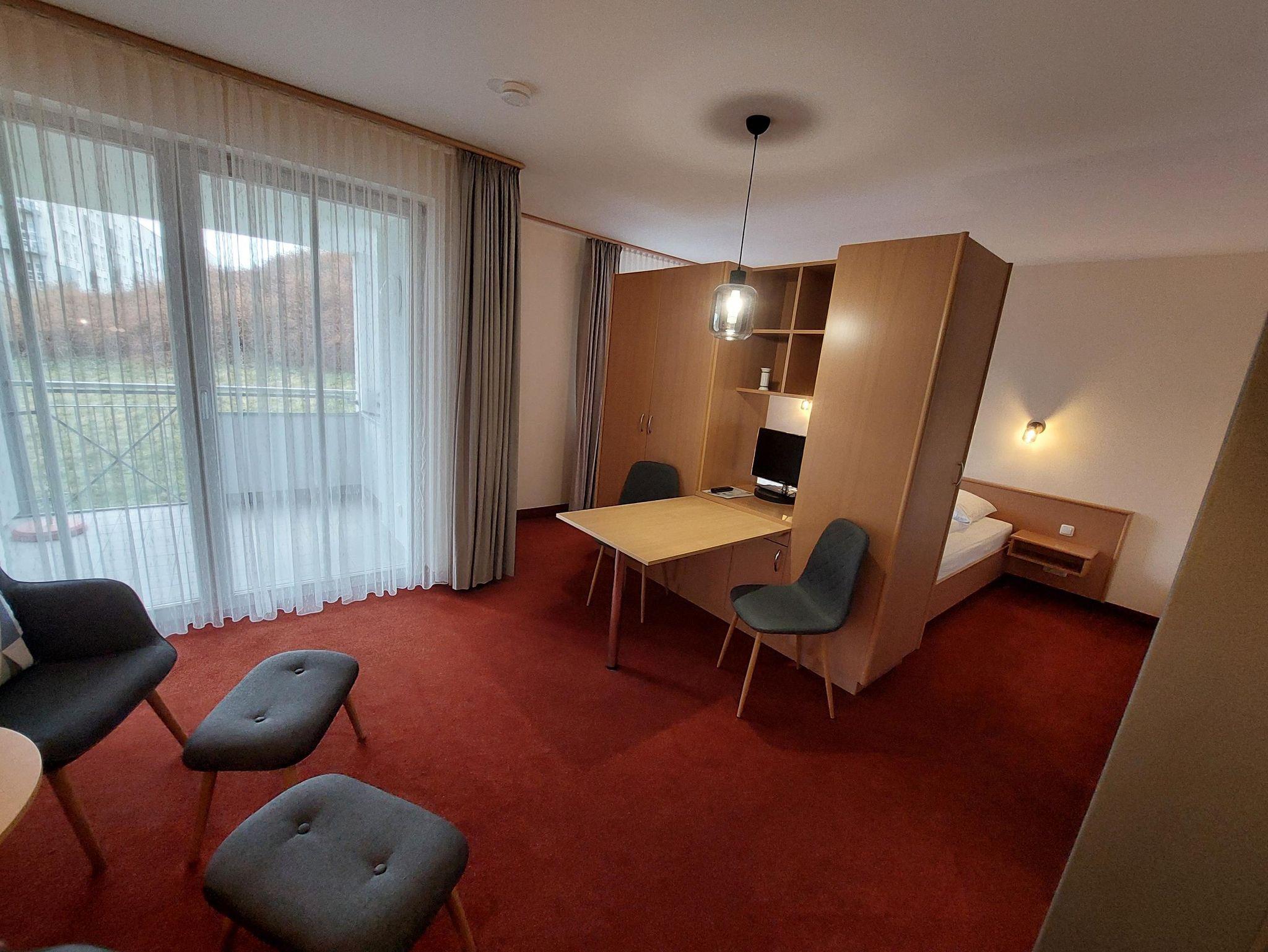 Kombinierter Wohn- und Schlafraum mit Doppelbett, gemütlicher Sitzecke, SAT-TV, Radio, Telefon, sowie freies W-Lan. Das Appartement verfügt über eine komplett ausgestattete Küche und Bad mit Dusche, WC und Föhn. Überwiegend Balkon verfügbar.