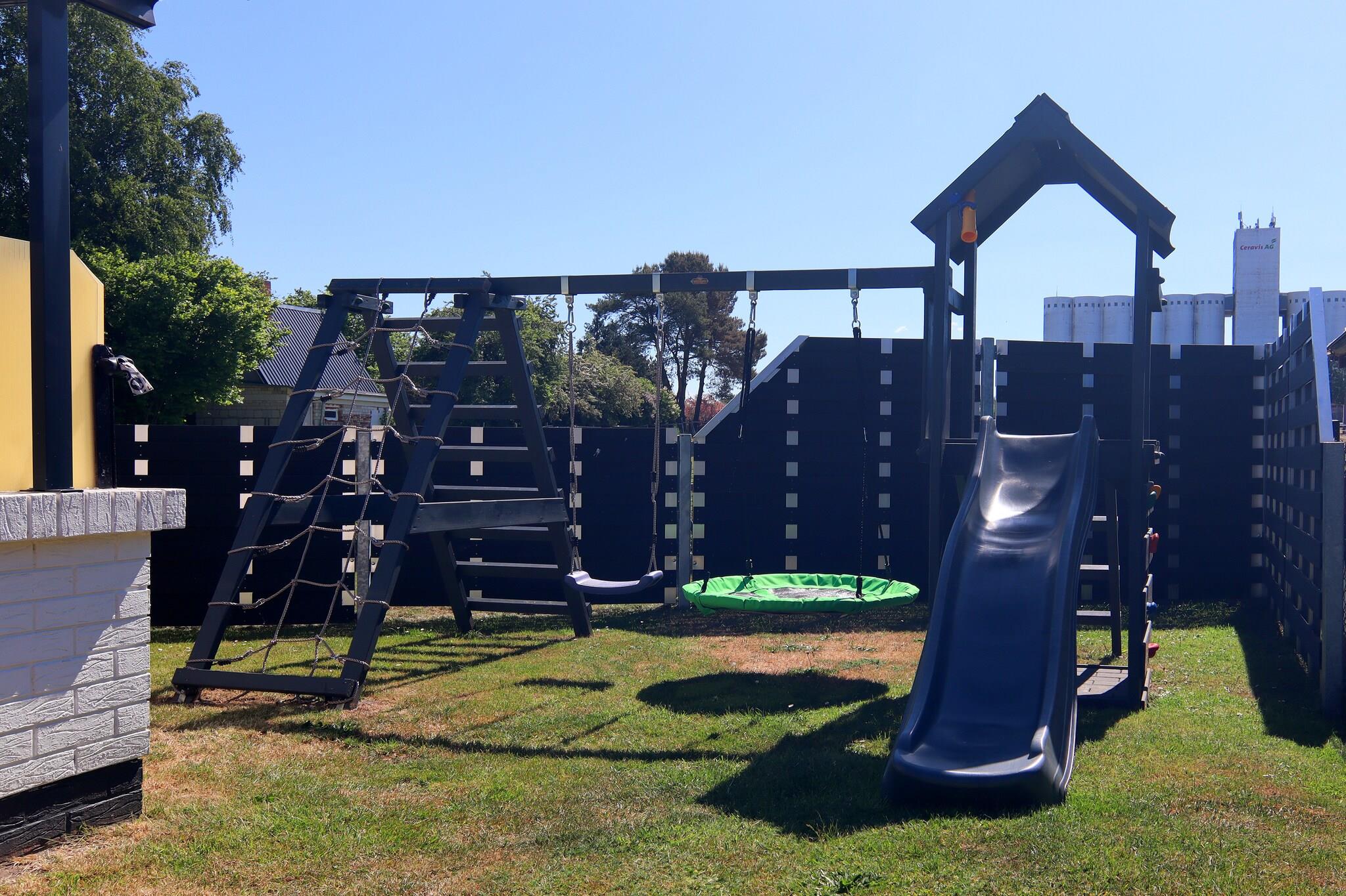 Bottenvåningen: (öppet kök(vattenkokare, brödrost, spis(Spis med 4 kokplattor, keramisk, elektrisk), Fläkt, kaffebryggare, ugn, mikrovågsugn, kylskåp), Vardags- och sovrum(Bäddsoffa 1 pers., TV(platt-tv), öppen spis, sitthörna, radio), sovrum(våningssäng, king size dubbelsäng), badrum(dusch(Duschkabin), handfat, toalett ), värme) terrass(privat, tak), trädgård(inhägnad), trädgårdsmöbler, solstole, grill, parkering, Parasoll, lekplats, Gungställning