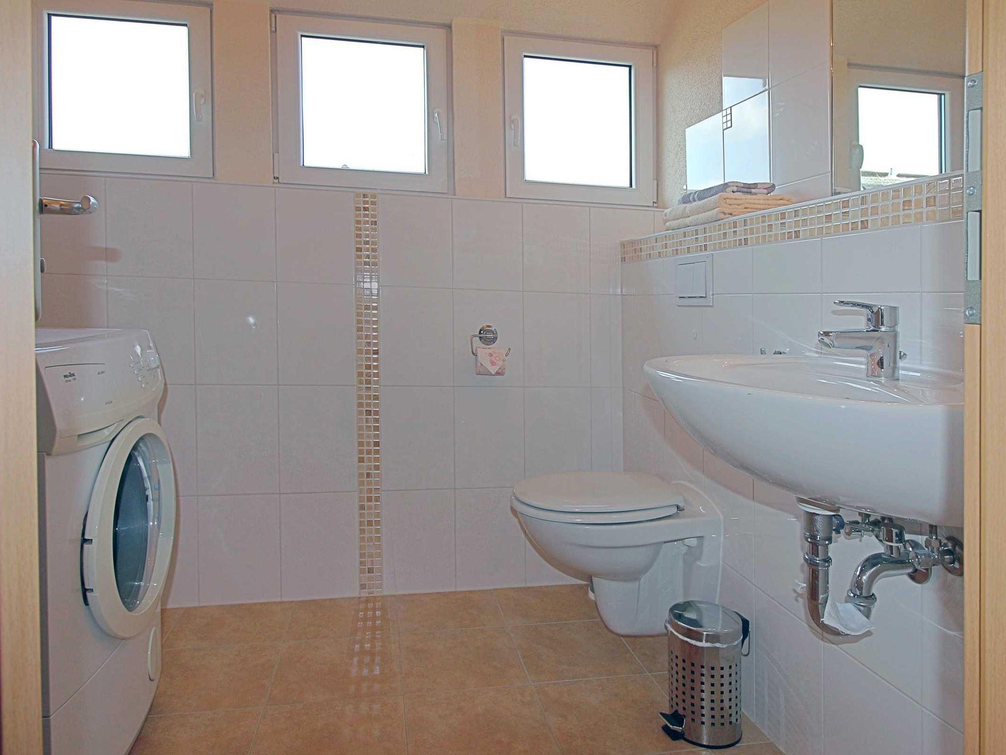Ebenfalls im OG befindet ein Gäste-WC mit Waschbecken und sogar einer Waschmaschine.