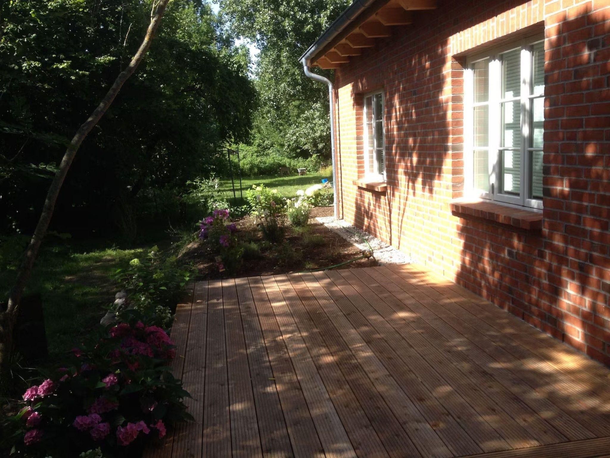 Das Haus ist von einem weitläufigen Garten umgeben, der mit einer großen Wiese und zahlreichen Bäumen ausgestattet ist. In diesem schönen Garten wachsen Obst- und Nussbäume. Direkt an den Garten schließt sich eine etwa 7.000 qm große Wiese an, die bis kurz vor den Bodden reicht. Der Garten wird von zwei imposanten Pappeln sowie Linden, Eschen und Fichten gesäumt, ergänzt durch Buschrosen und Obststräucher. An den Terrassen blühen verschiedene Blumen, die je nach Jahreszeit ihre Farbenpracht entfalten. An heißen Tagen bieten die Bäume, darunter der Walnussbaum, angenehmen Schatten, während die Sonnen-Pavillons zum Verweilen einladen. Auf dem Grundstück befindet sich zudem ein alter Brunnen. Im Sommer erfreuen sich die Besucher an der Vielzahl von Singvögeln, während Greifvögel und in der Dämmerung auch Waldkäuze und Fledermäuse um das Haus kreisen.