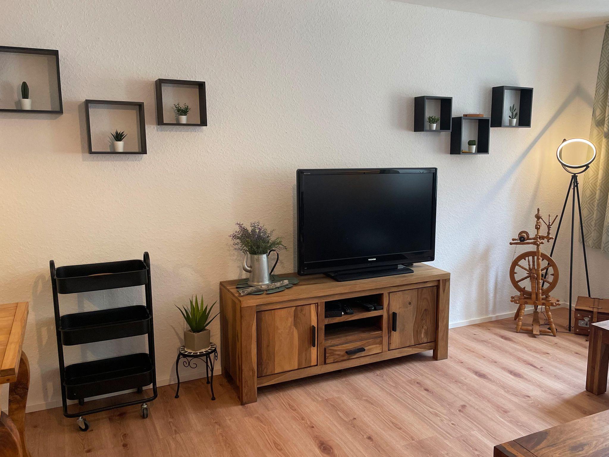 Im geräumigen Wohnzimmer können sie die Couch umwandeln in ein Bett für zwei Person, zusätzlich steht ein gemütlicher Ohrensessel zur Verfügung. Auf einem Sideboard steht ein TV-Gerät für ihre Unterhaltung mit SAT-Receiver. Auch hier ist ein HDMI-Anschluss vorhanden. Am rustikalen Esstisch können Sie Ihre Mahlzeiten nach einem schönen Urlaubstag genießen.