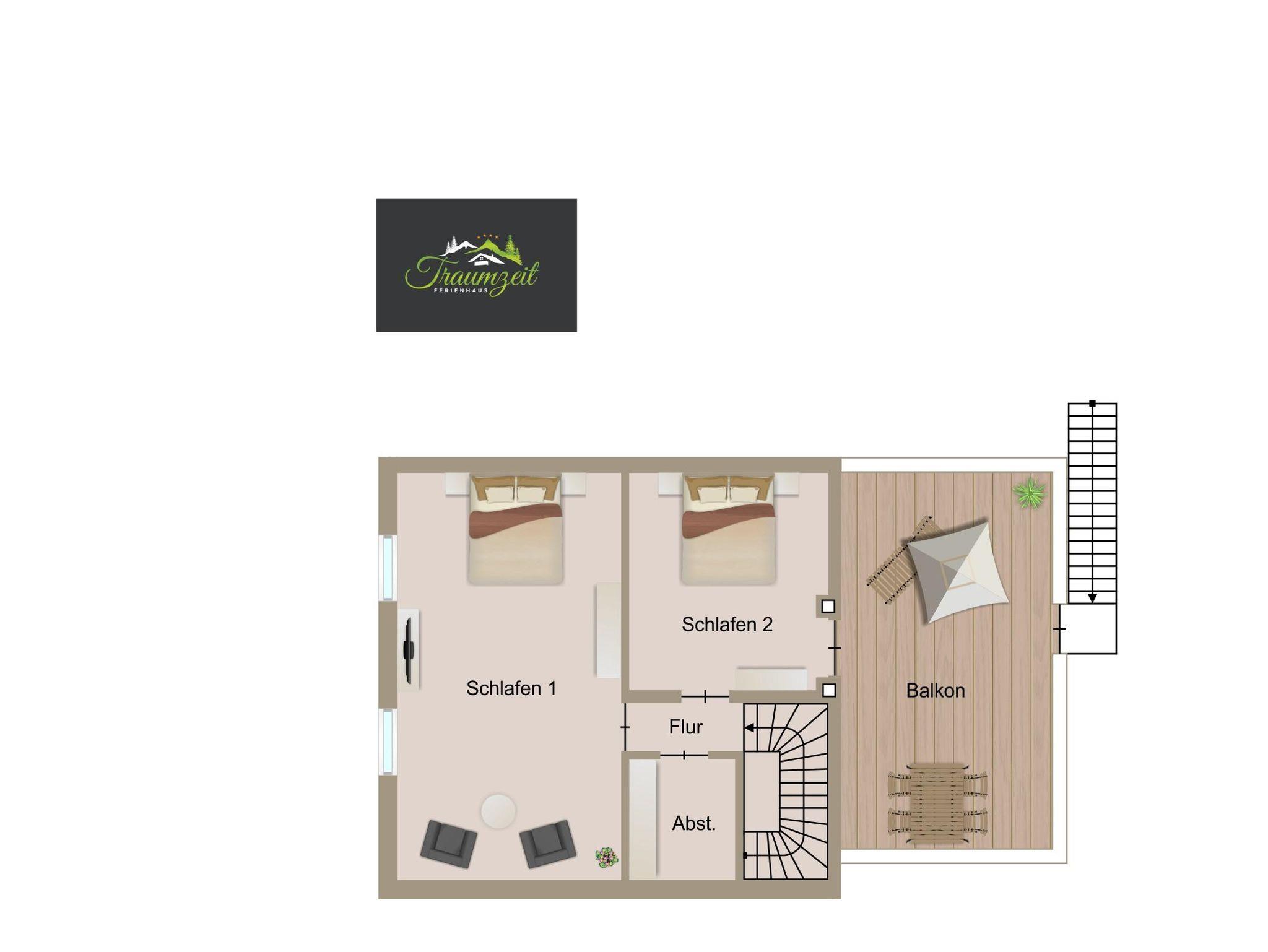 Im Obergeschoß befinden sich die beiden Schlafzimmer. Diese sind jeweils mit einem Doppel-Box-Spring-Bett ausgestattet. Im größeren Schlafzimmer befindet sich zusätzlich noch ein ausklappbares Bett, welches die Möglichkeit bietet unser Haus ggf. mit 6 Personen zu nutzen.