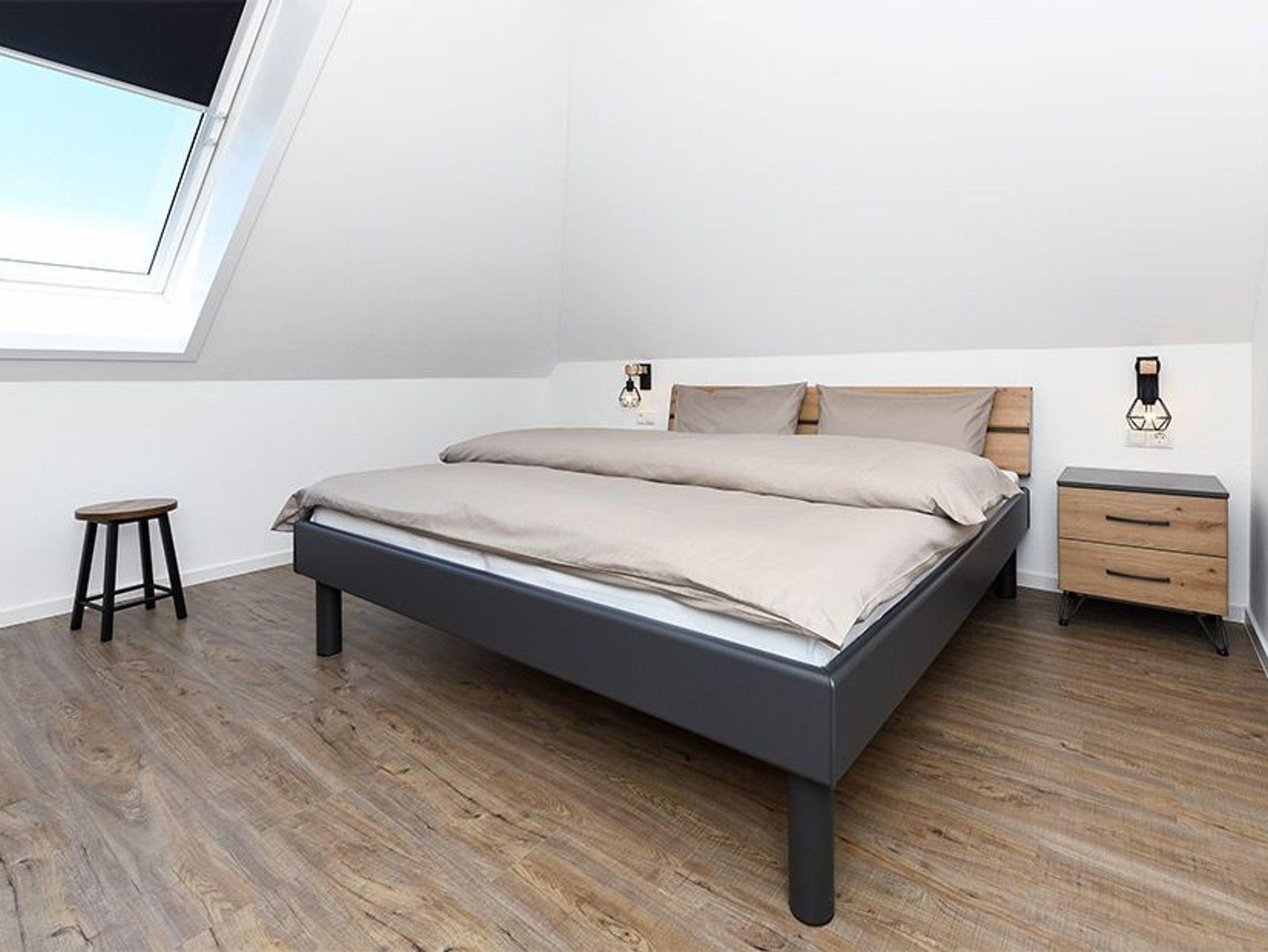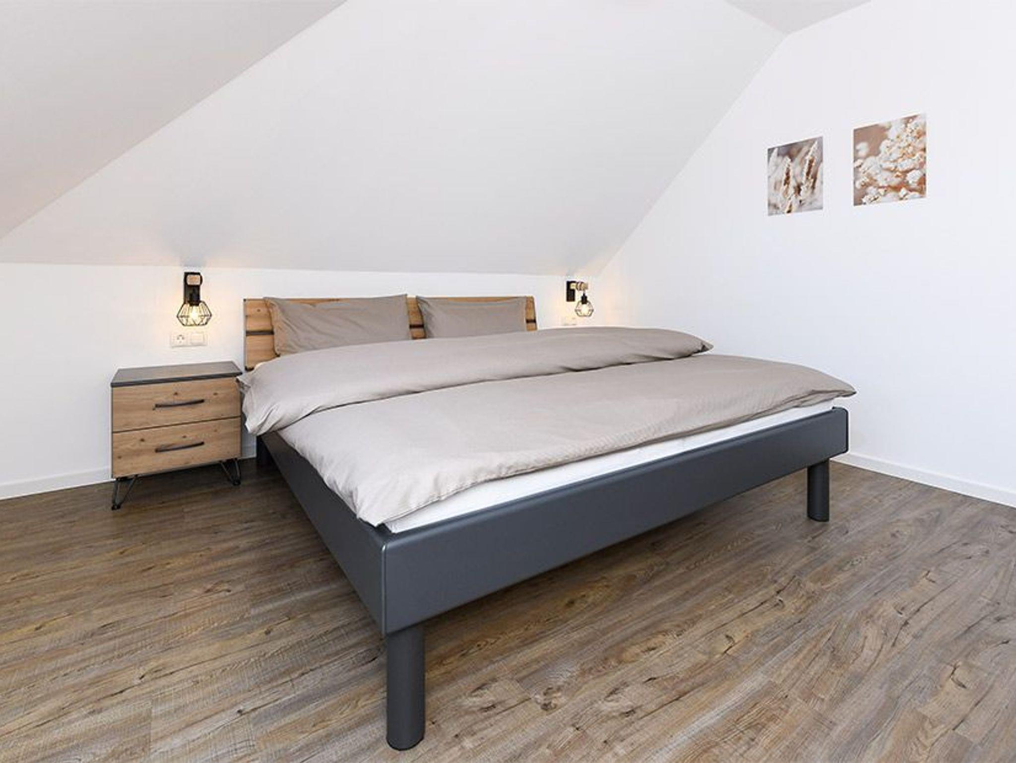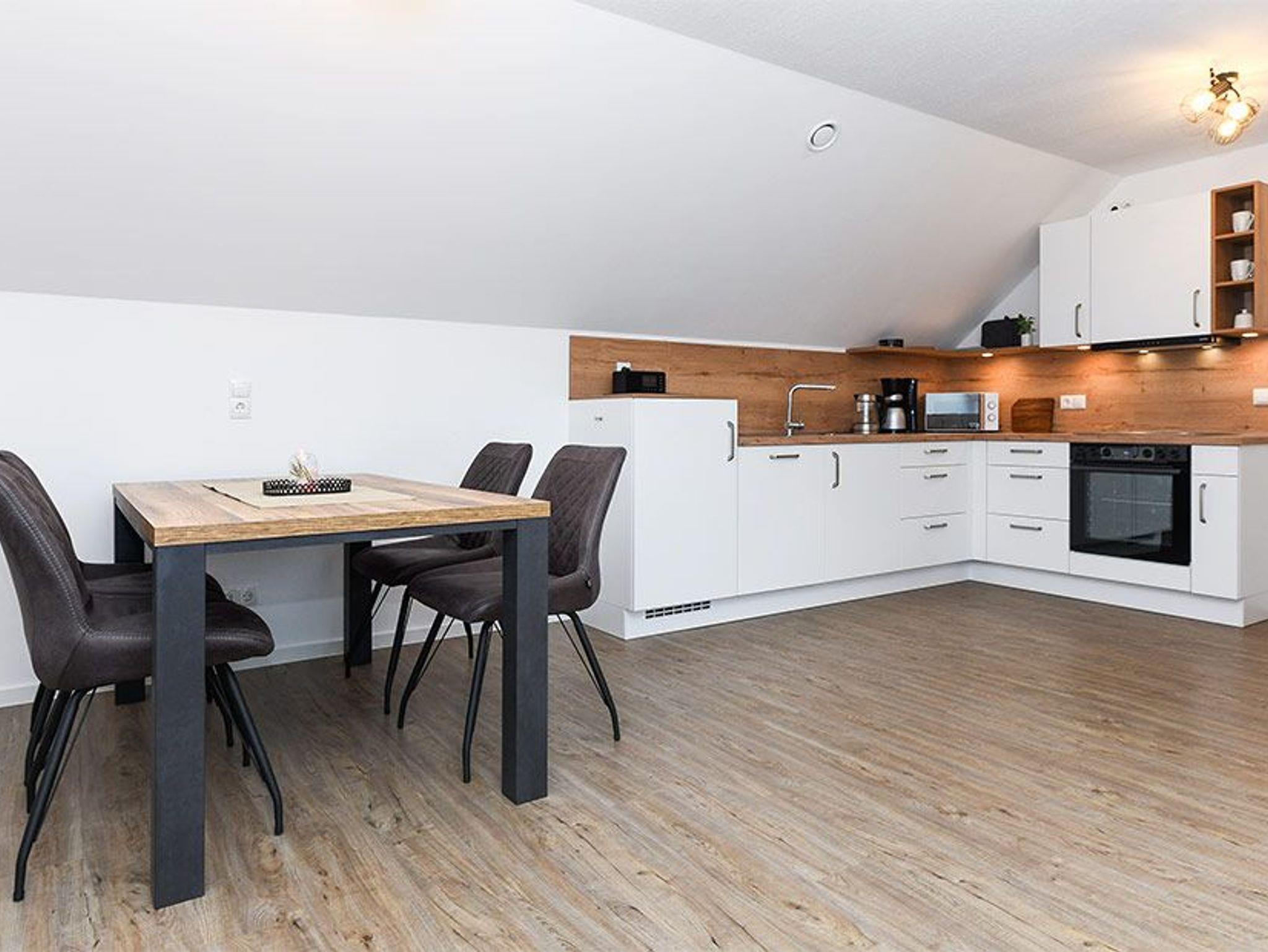Größe ca. 57 Quadratmeter. Wohnraum mit integrierter Küche. Schlafzimmer, zweites, separates Schlafzimmer, Badezimmer mit Dusche, Waschtisch und WC, Obergeschoss, optimal für 1 bis 4 Personen.