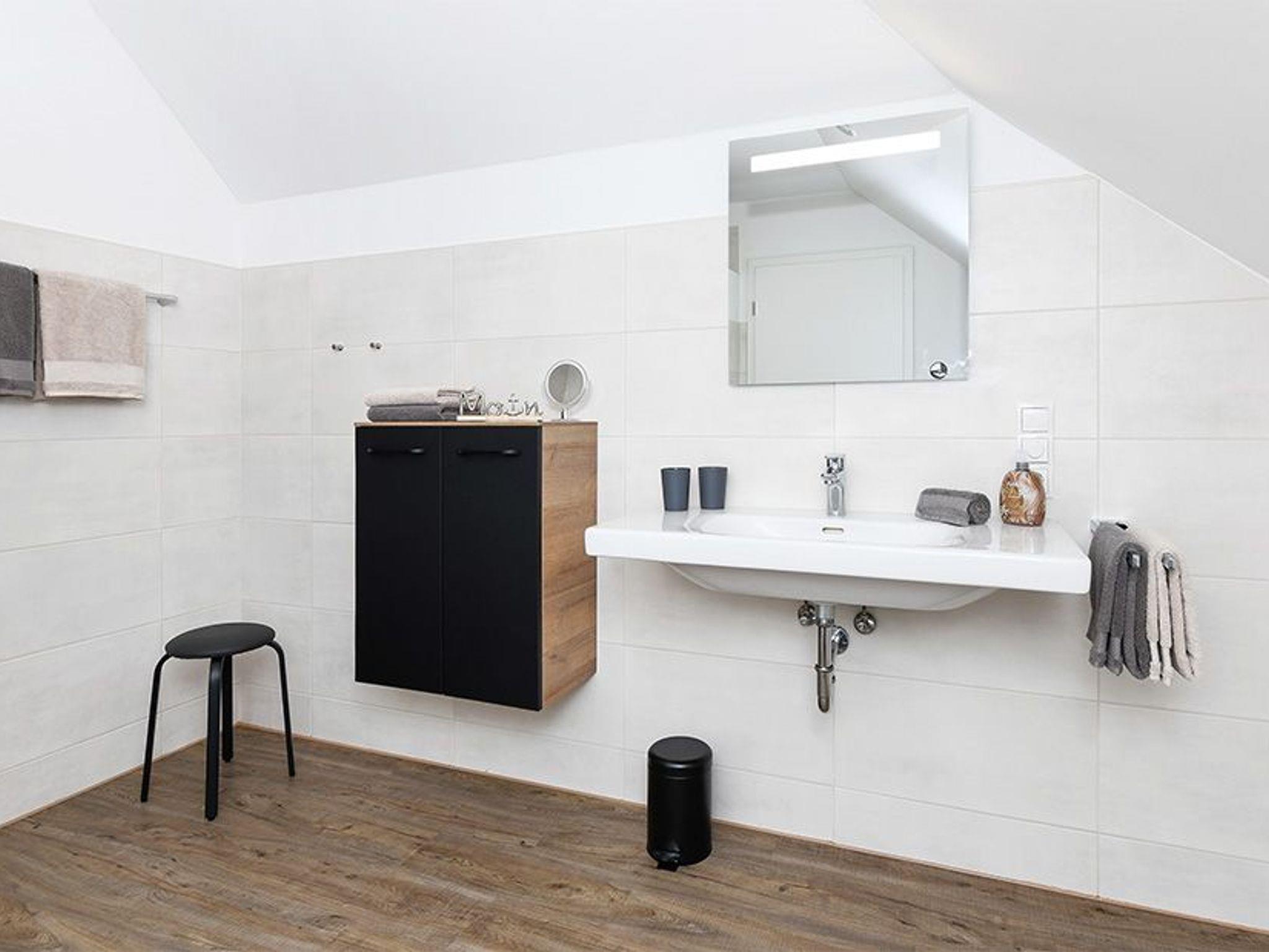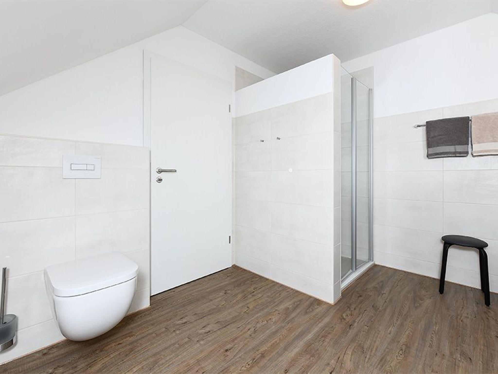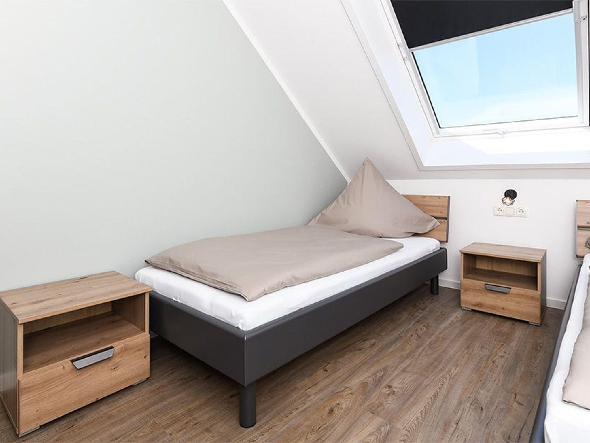 Größe ca. 57 Quadratmeter. Wohnraum mit integrierter Küche. Schlafzimmer, zweites, separates Schlafzimmer, Badezimmer mit Dusche, Waschtisch und WC, Obergeschoss, optimal für 1 bis 4 Personen.