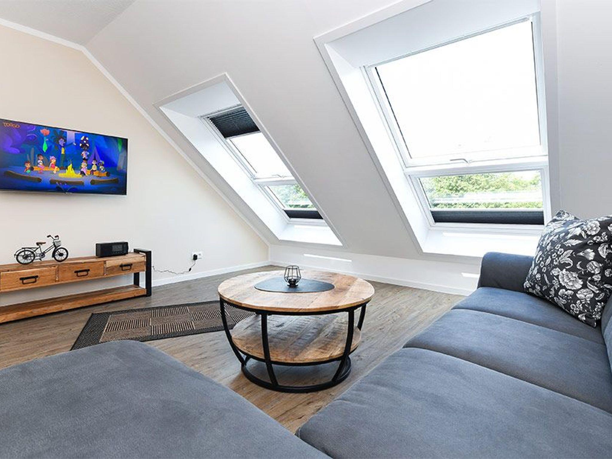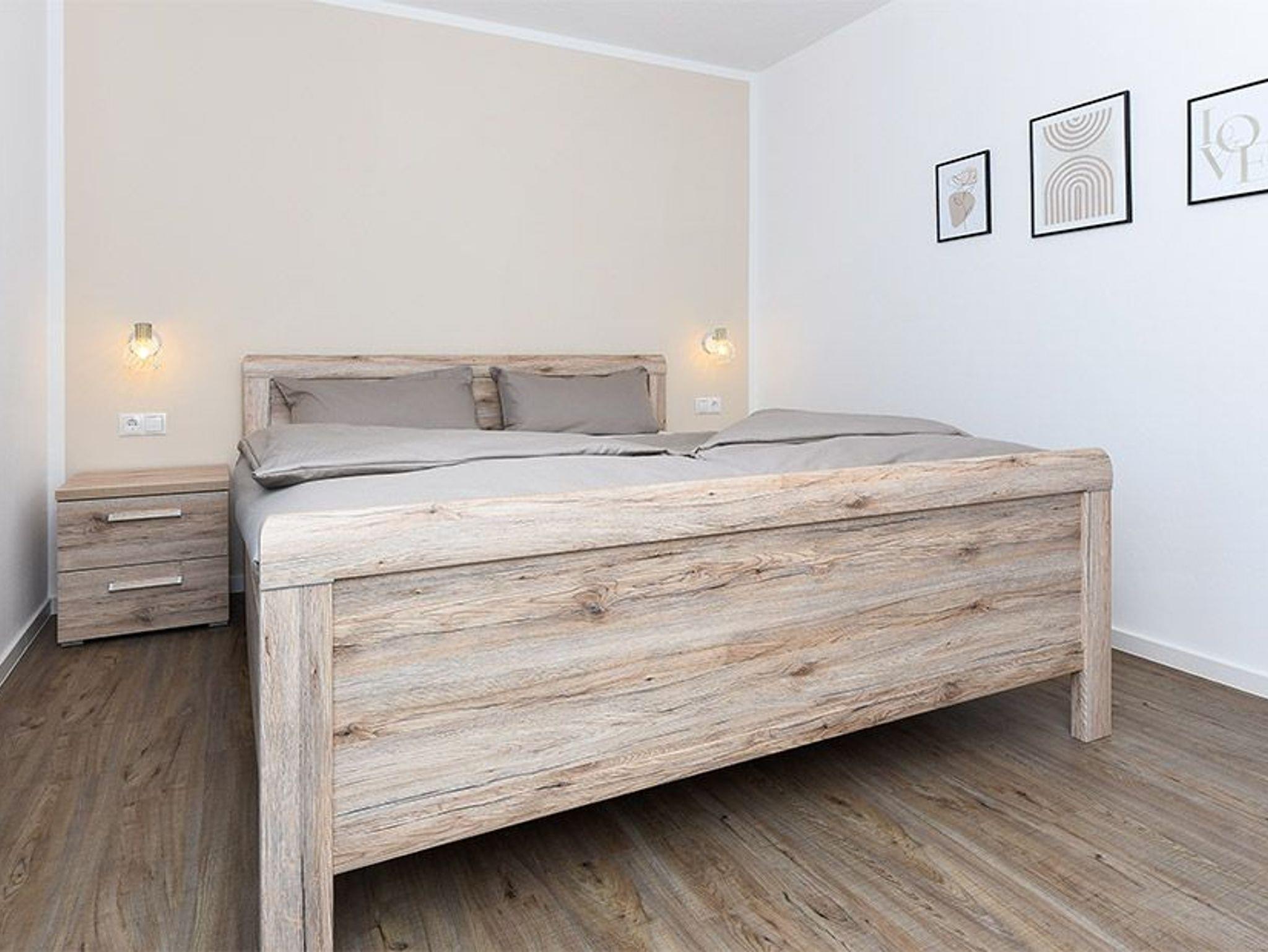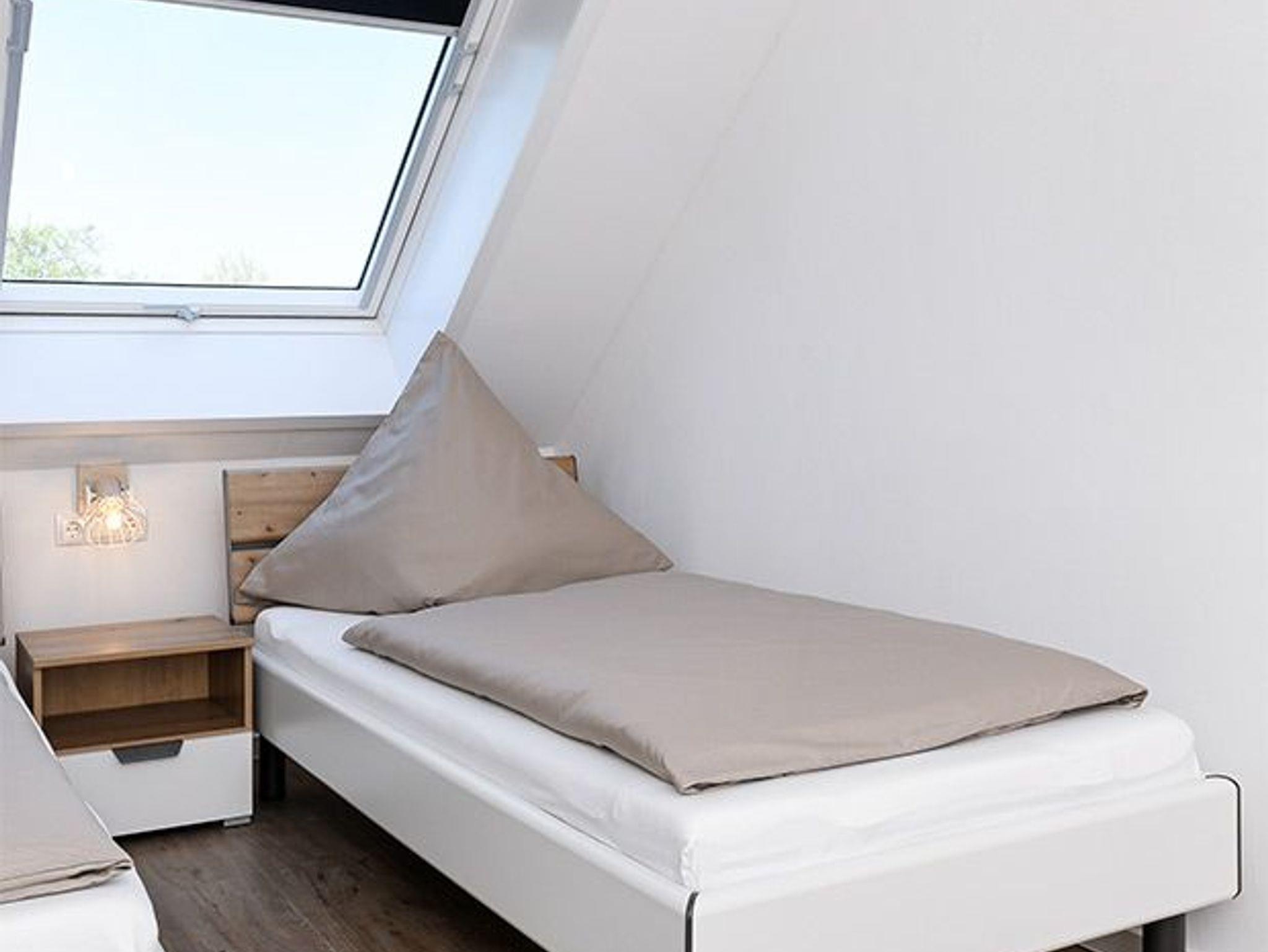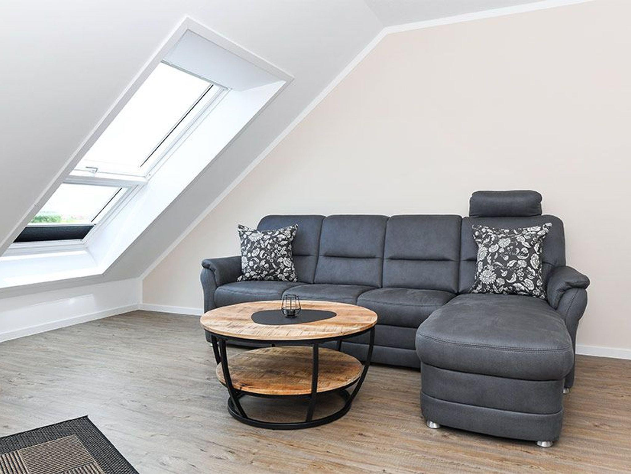 Größe ca. 64 Quadratmeter. Wohnraum mit integrierter Küche. Schlafzimmer, zweites separates Schlafzimmer/Kinderzimmer, Badezimmer mit Dusche, Waschtisch und WC, Obergeschoss, optimal für 2 bis 4 Personen.