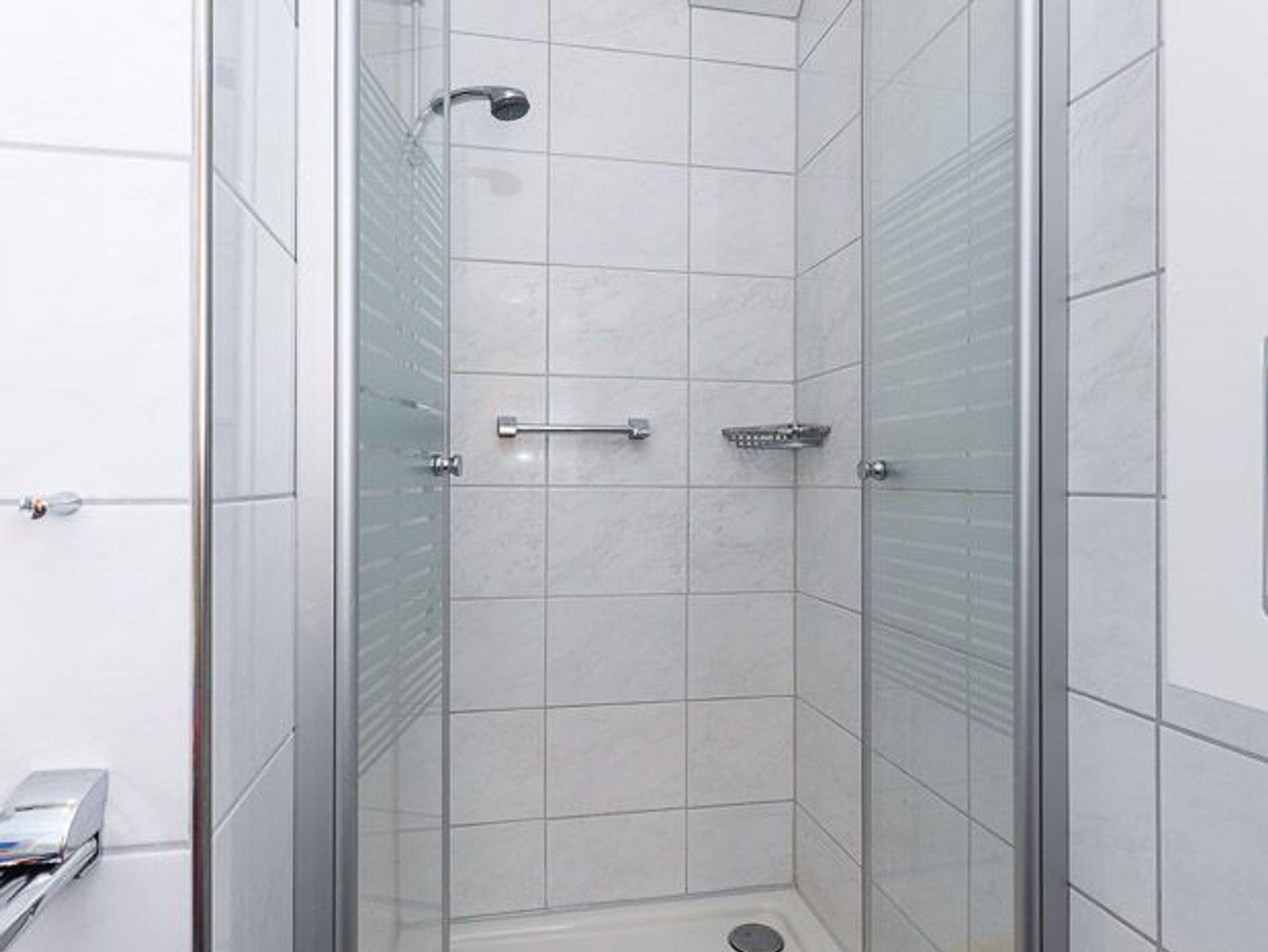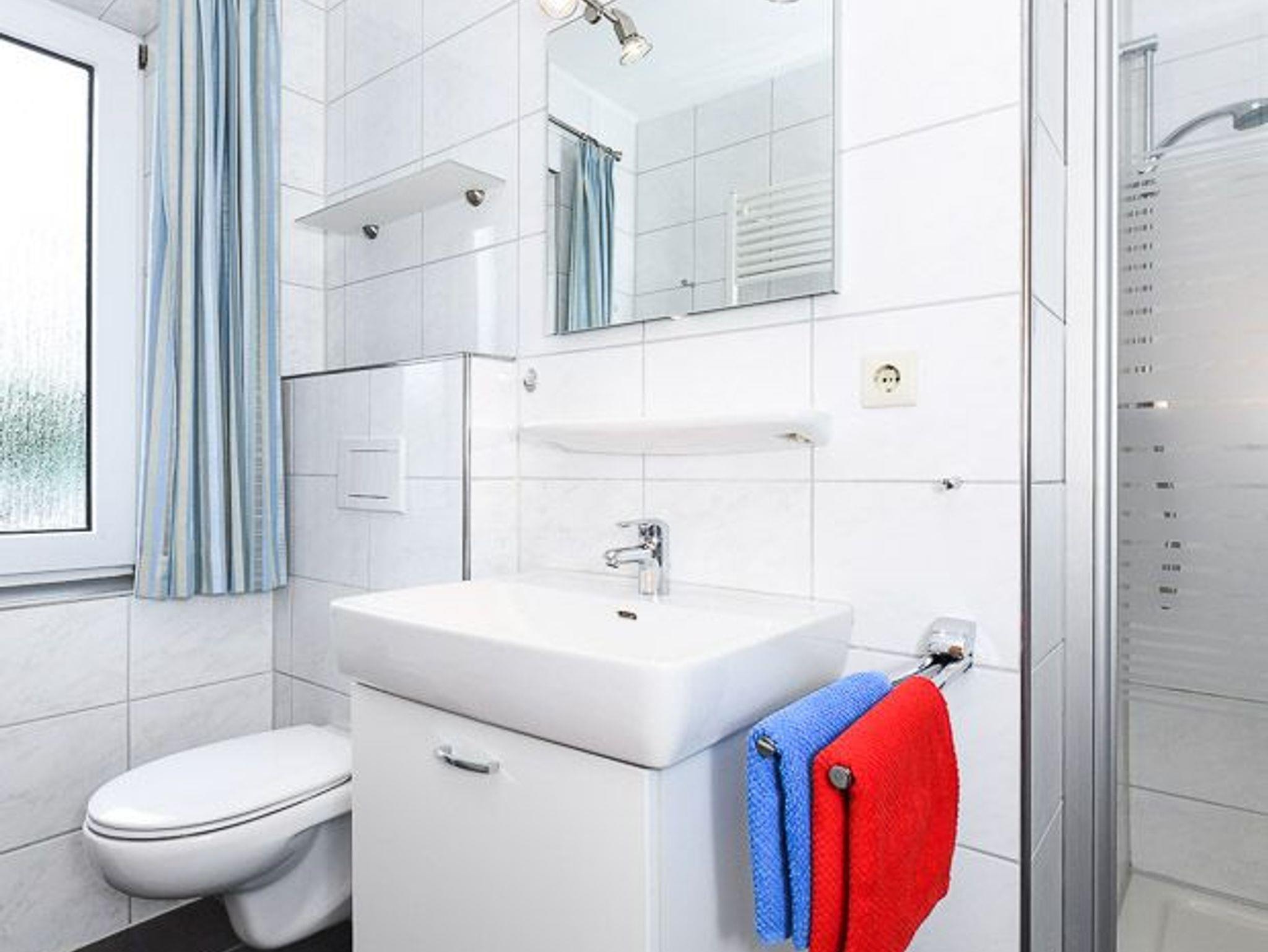 Badezimmer mit Dusche, Waschtisch und WC