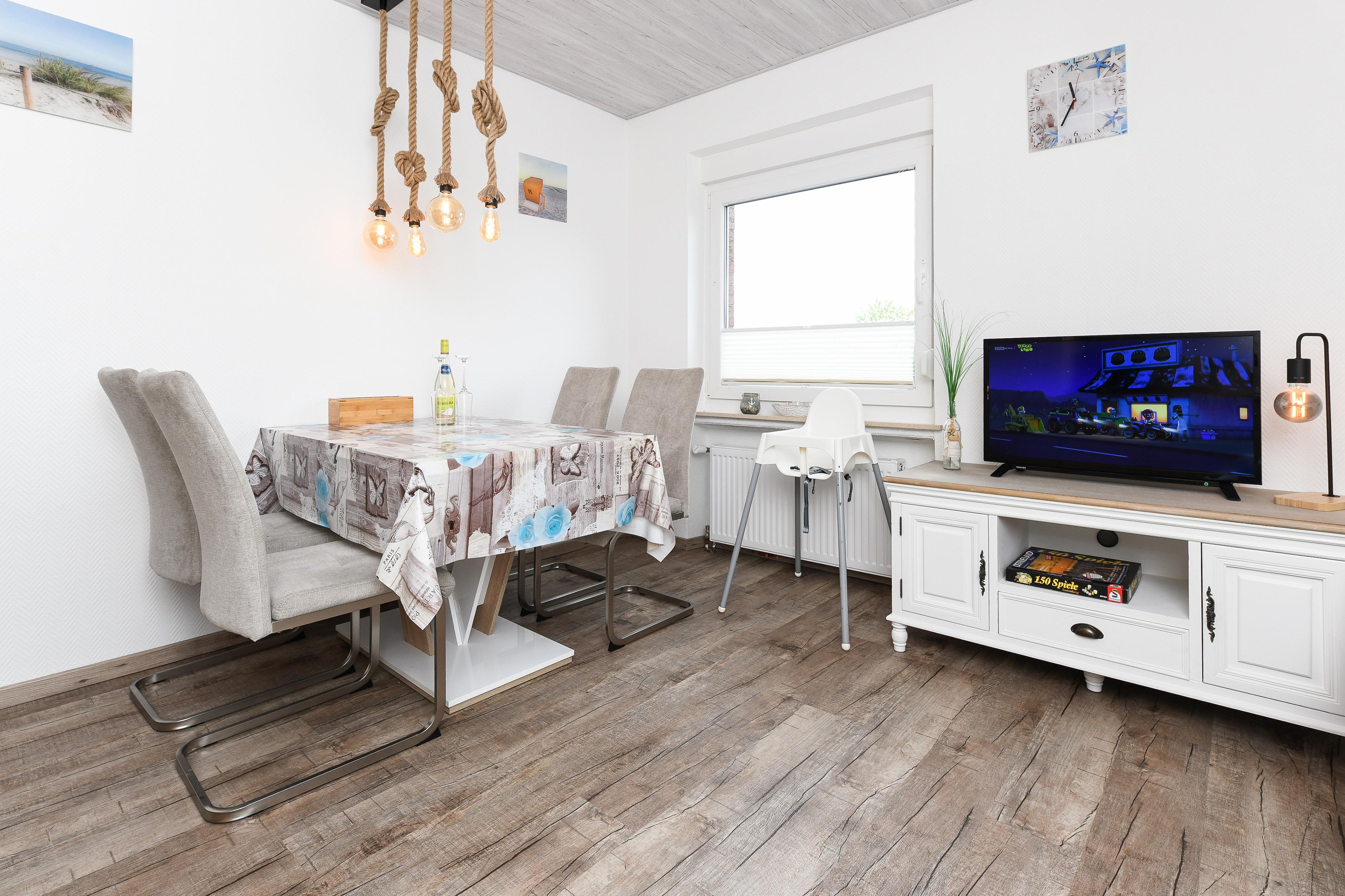 Gemütliche 2-Zimmer Wohnung (ca. 40 qm) im 1. Obergeschoss. Die Wohnung ist perfekt für Paare mit Kindern die dem Alltag mal eine Pause gönnen möchten. Die Wohnung ist wie folgt aufgeteilt. Im Wohnraum befindet sich eine Küchenzeile (Kaffeemaschine Filter, Toaster, Wasserkocher, Kühlschrank mit Eisfach sowie ein Mikrowellen Backofen) ein Tisch mit Sitzgelegenheiten sowie ein gemütliches Sofa. Die Wohnung hat ein separates Schlafzimmer mit einem Doppelbett sowie einem Etagenbett. Smart TV finden Sie im Wohnraum ein weiterer TV befindet sich im Schlafzimmer.