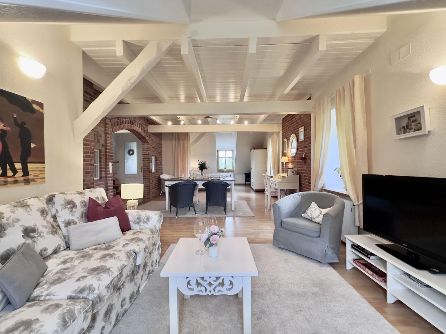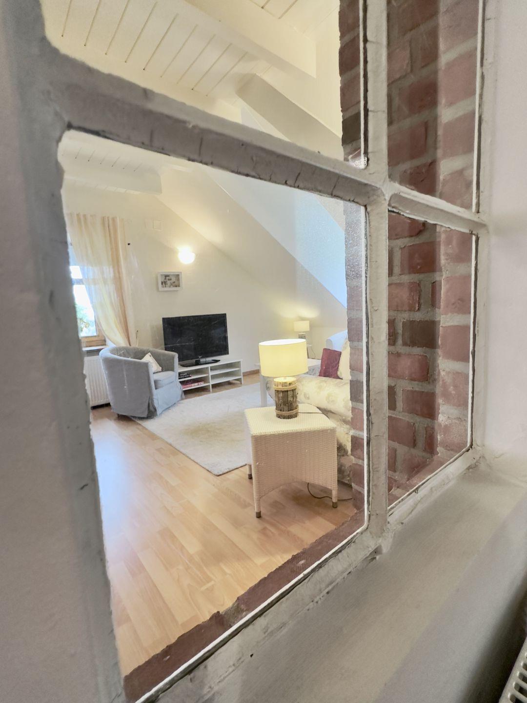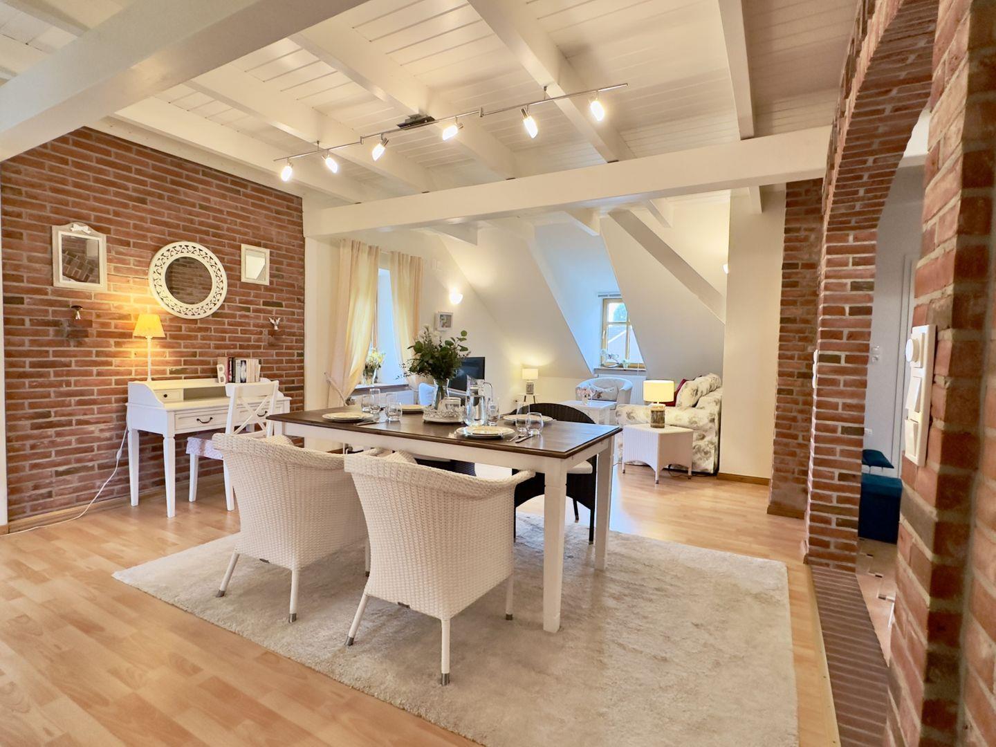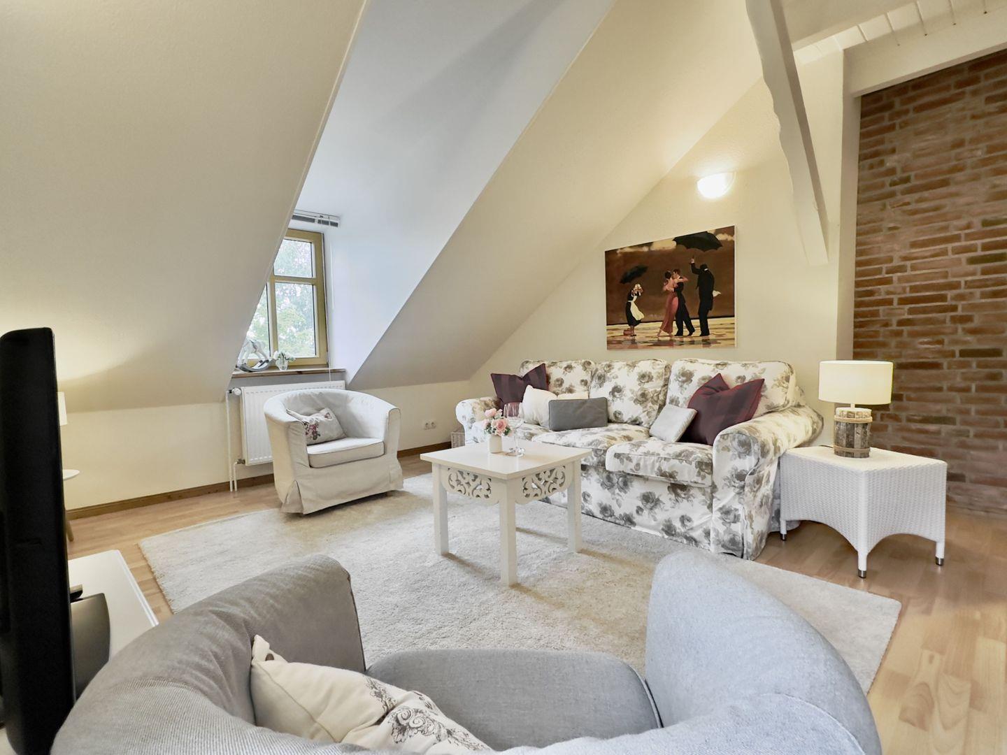 Bereits beim Betreten des Apartments werden Sie von den hellen, beeindruckenden Dachbalken im Wohnzimmer überwältigt. Diese weißen Balken und die verklinkerten Elemente verleihen dem Raum eine unverwechselbare, einladende Atmosphäre. Der gemütliche TV-Bereich, ausgestattet mit einem Sofa, das auch als Schlafsofa genutzt werden kann, lädt zu entspannten Abenden ein. Hier finden Sie Ihren persönlichen Rückzugsort nach einem ereignisreichen Tag.