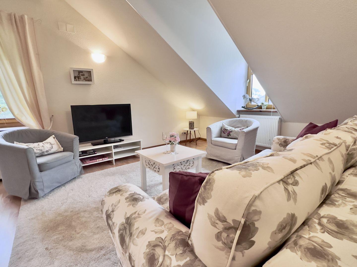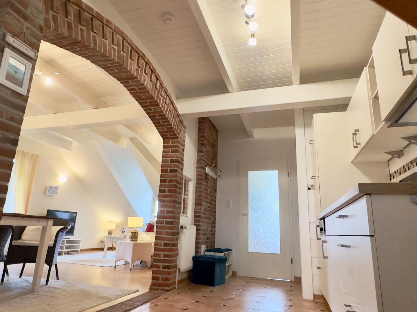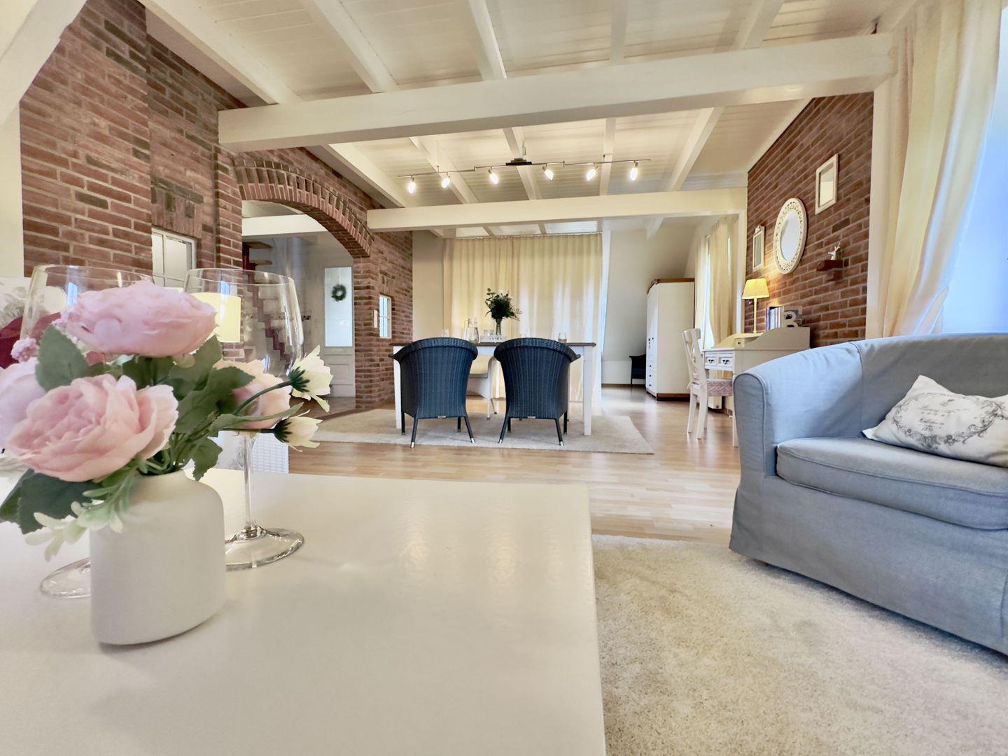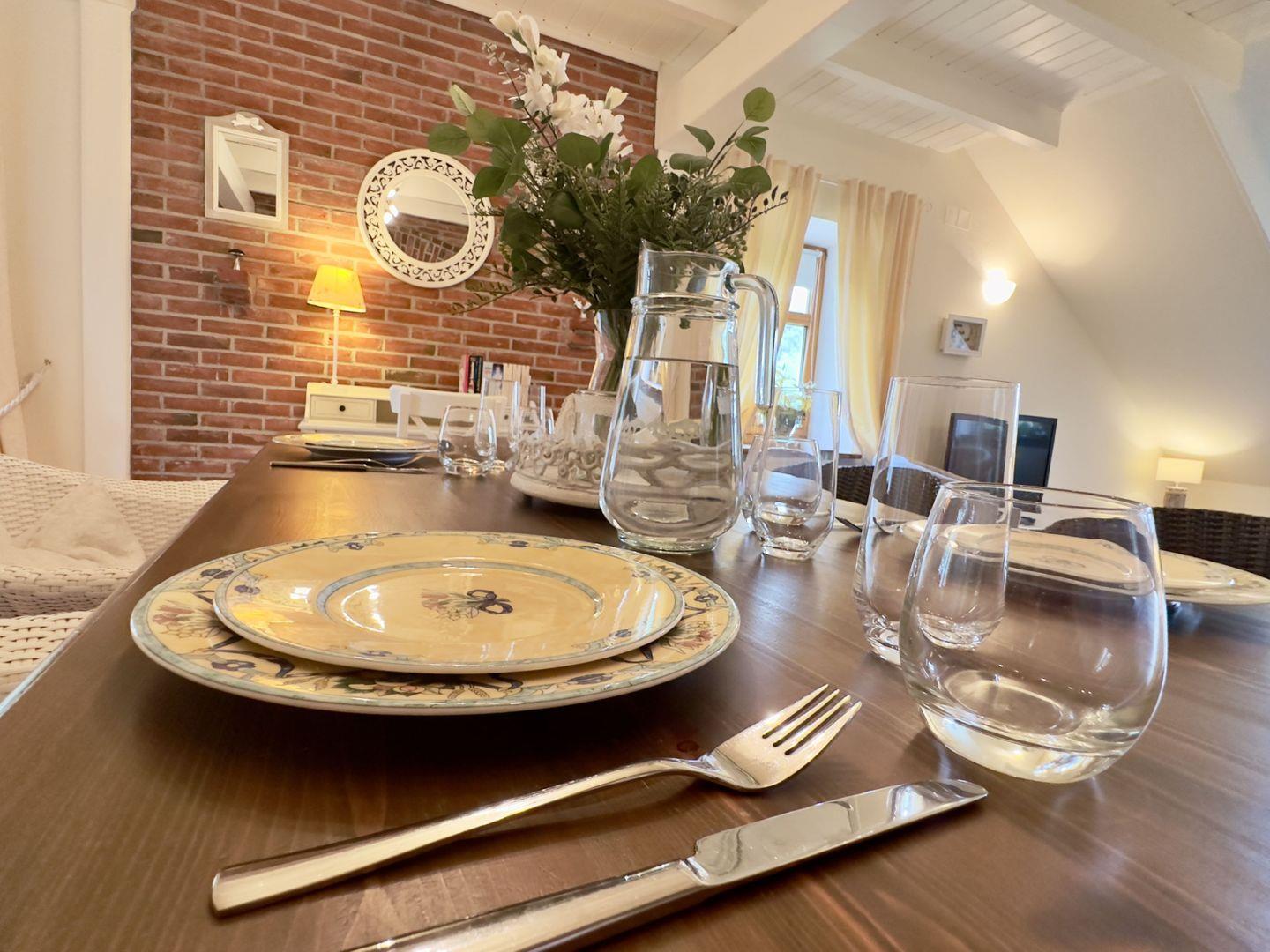 Bereits beim Betreten des Apartments werden Sie von den hellen, beeindruckenden Dachbalken im Wohnzimmer überwältigt. Diese weißen Balken und die verklinkerten Elemente verleihen dem Raum eine unverwechselbare, einladende Atmosphäre. Der gemütliche TV-Bereich, ausgestattet mit einem Sofa, das auch als Schlafsofa genutzt werden kann, lädt zu entspannten Abenden ein. Hier finden Sie Ihren persönlichen Rückzugsort nach einem ereignisreichen Tag.