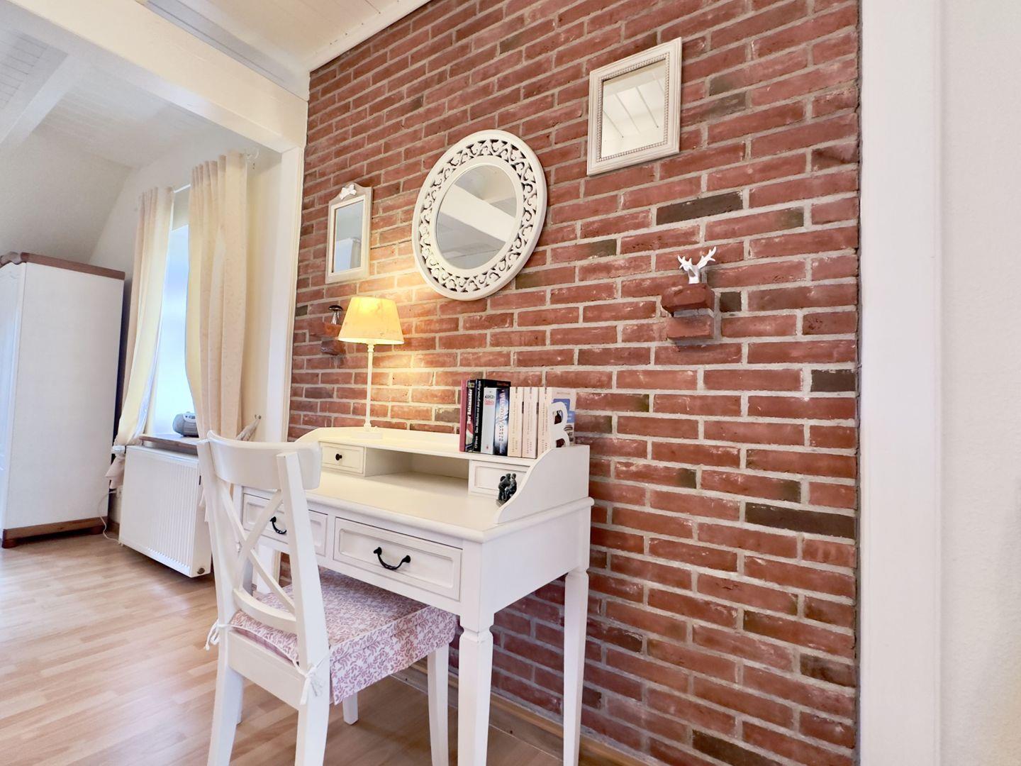 Das angrenzende Esszimmer, mit seinem rustikalen Holztisch, bietet Platz für gesellige Mahlzeiten und gemütliche Stunden. Ein zusätzlicher Schreibtisch steht bereit, um Ihnen die Möglichkeit zu geben, einen liebevollen Postgruß zu versenden oder einfach Ihre Gedanken festzuhalten.