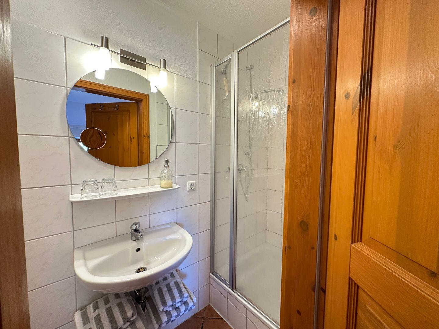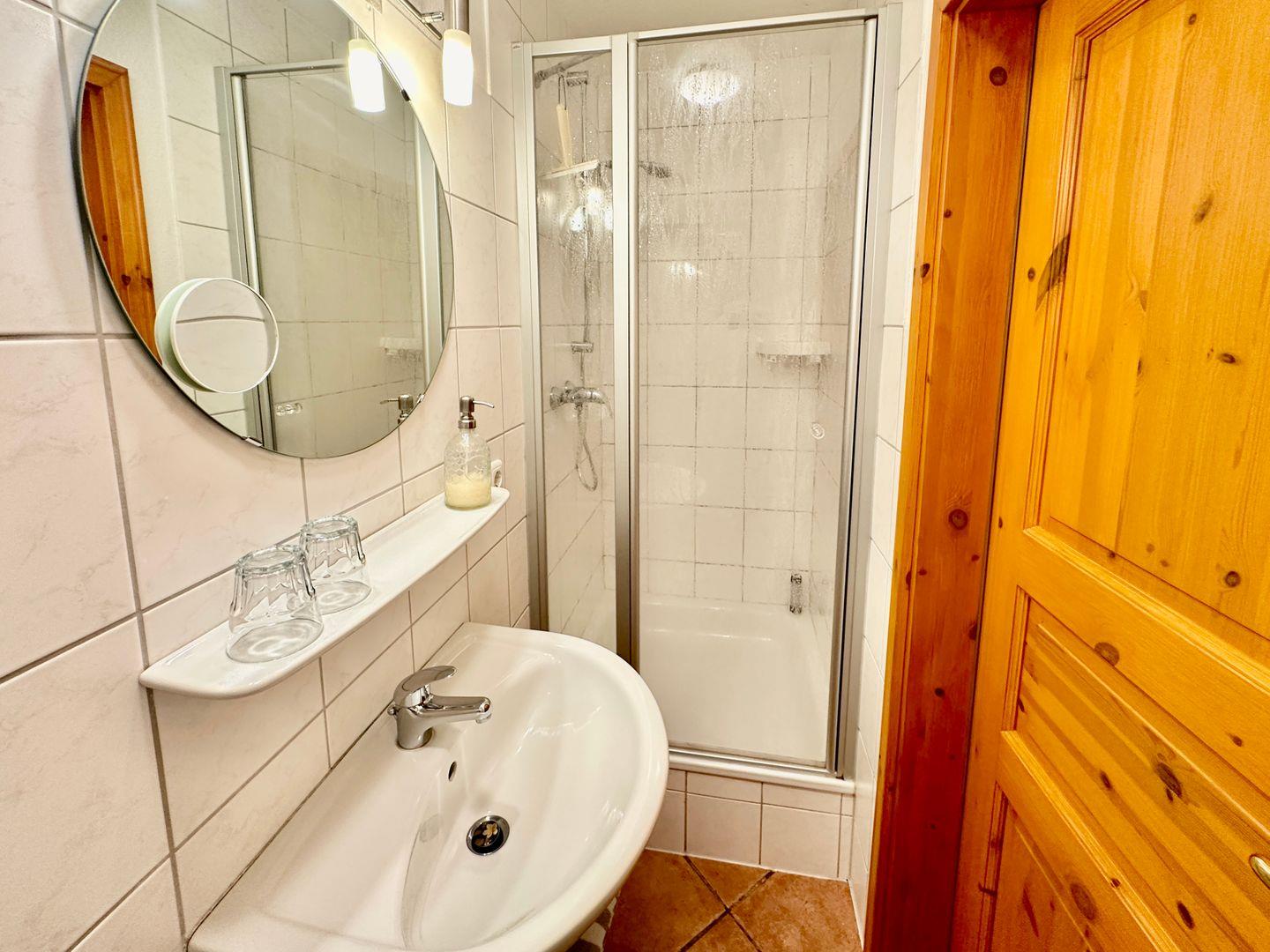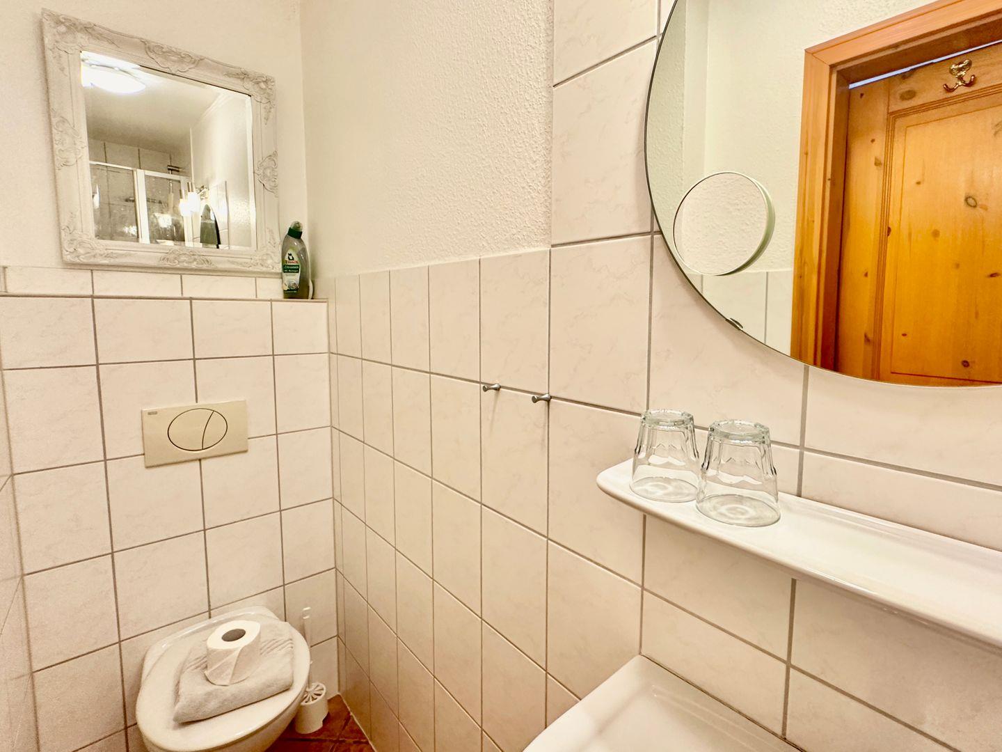Das kleine, hell geflieste Badezimmer ist ebenfalls bestens ausgestattet und bietet auf kompaktem Raum alles, was Sie für Ihre tägliche Pflege benötigen. Es fügt sich nahtlos in das stimmige Gesamtkonzept des Apartments ein und sorgt dafür, dass es Ihnen an nichts fehlt.