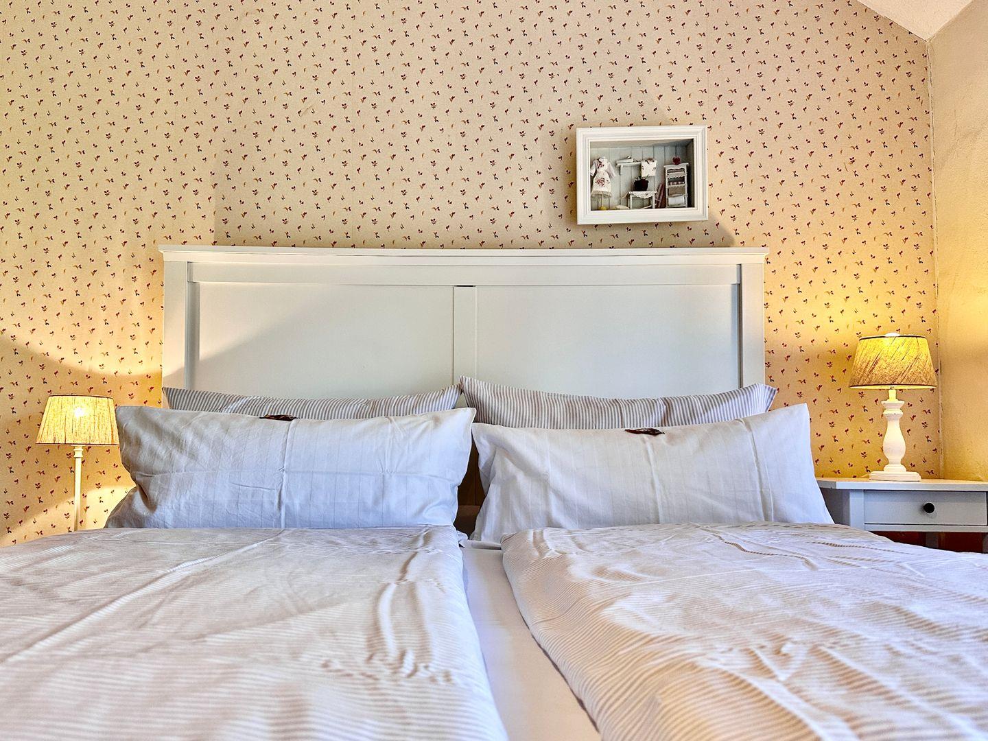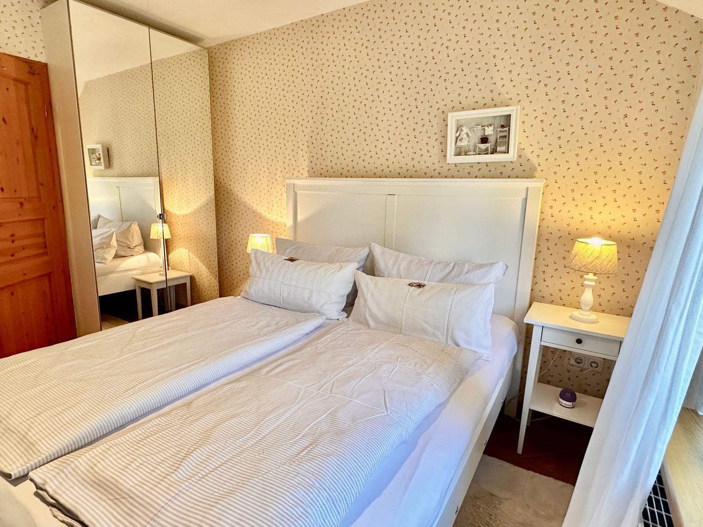 Der helle Wohn- und Schlafraum ist ein Ort, an dem Sie sich sofort zuhause fühlen. Die modernen Elemente verleihen dem Raum Frische, während die liebevoll erhaltenen Details den Charme vergangener Zeiten spürbar machen. Hier können Sie in gemütlicher Zweisamkeit entspannen und den Alltag weit hinter sich lassen.