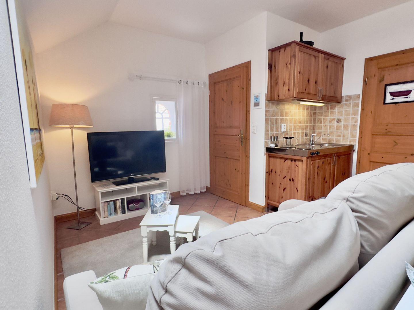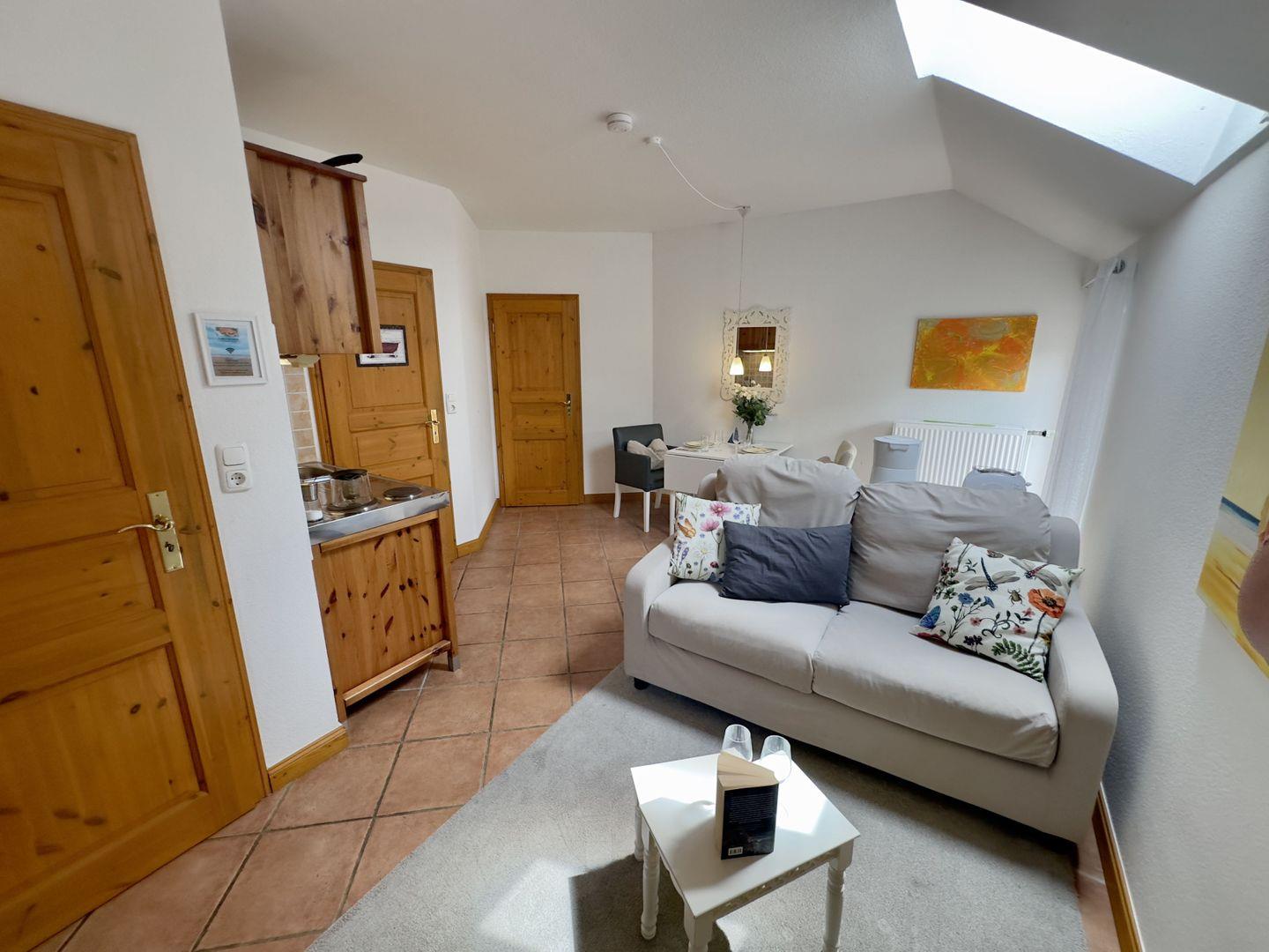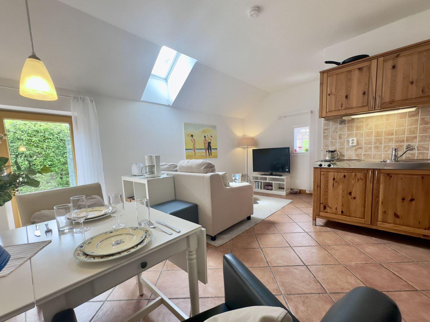 Das gemütliche Wohnzimmer besticht durch seine Funktionalität und bietet eine einladende Sofaecke, die perfekt für gemeinsame Stunden zu zweit ist. Hier können Sie sich zurücklehnen, entspannen und den Alltag hinter sich lassen. Die im Wohnzimmer integrierte Essgruppe bietet Platz für gemeinsame Mahlzeiten, bei denen Sie die Ruhe und Idylle dieses besonderen Ortes genießen können.
