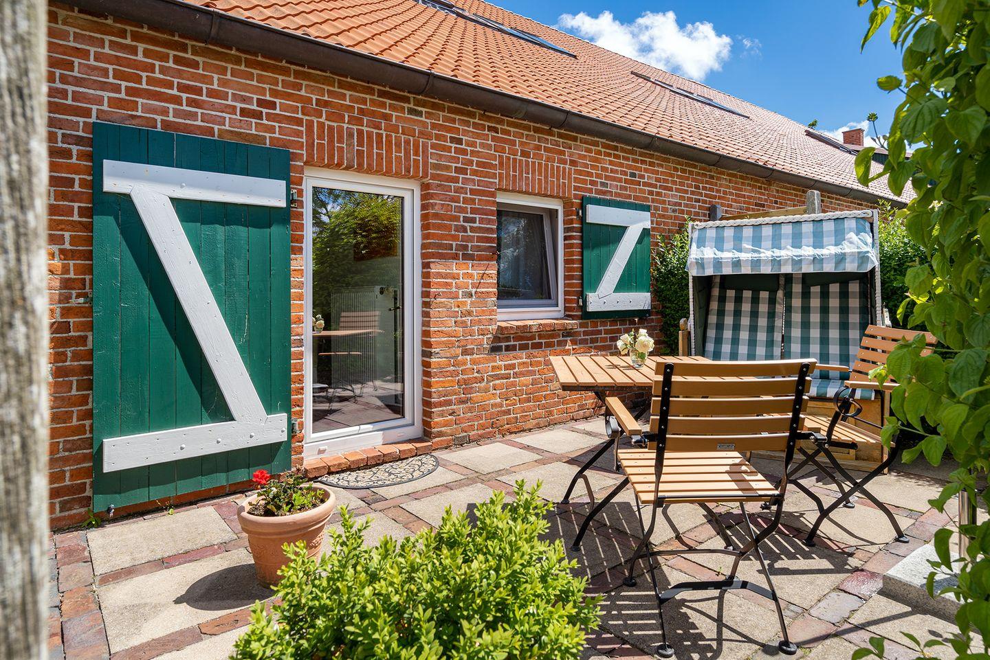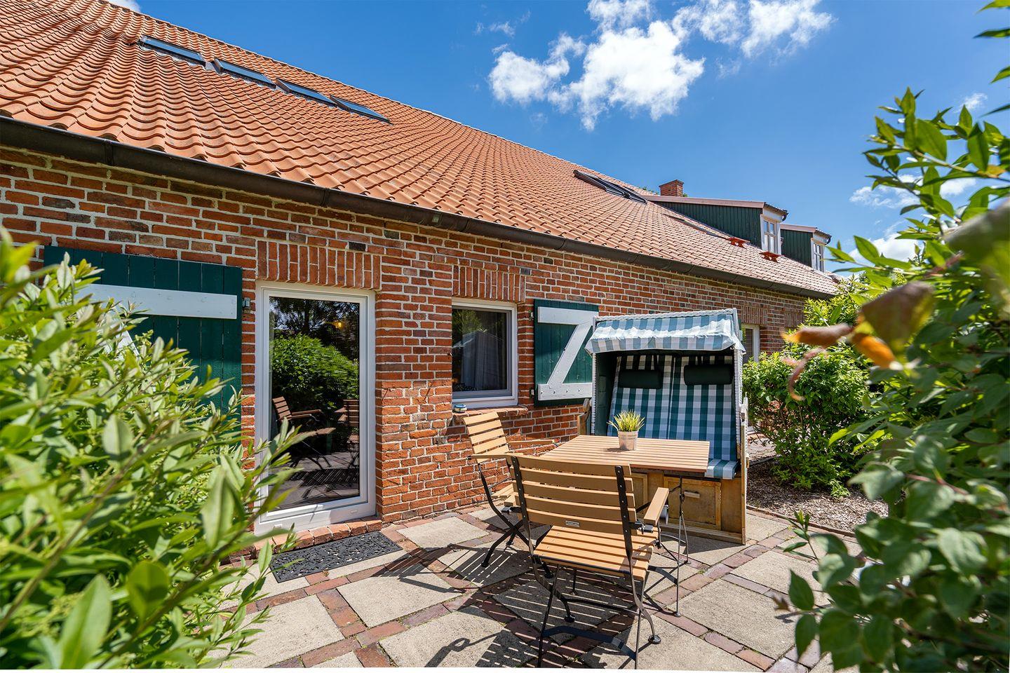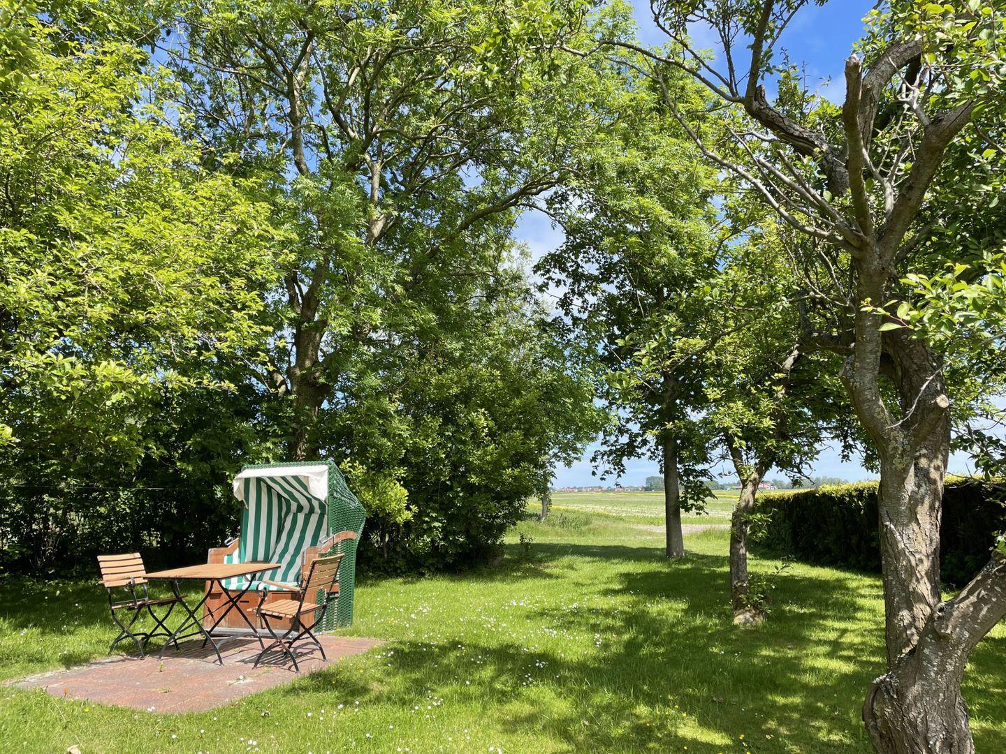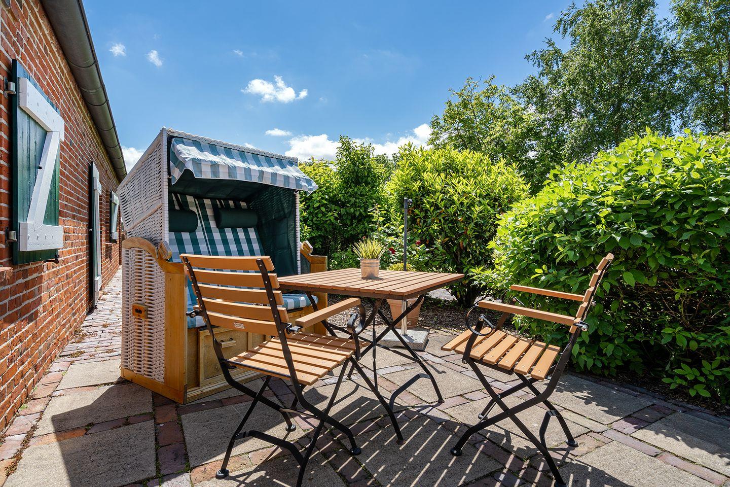 Die Terrasse führt direkt in den wunderschönen Garten des Gulfhofs, wo ein gemütlicher Strandkorb zum Träumen einlädt. Umgeben von grüner Natur, ist dies der perfekte Ort, um die Seele baumeln zu lassen und unvergessliche Momente zu genießen.