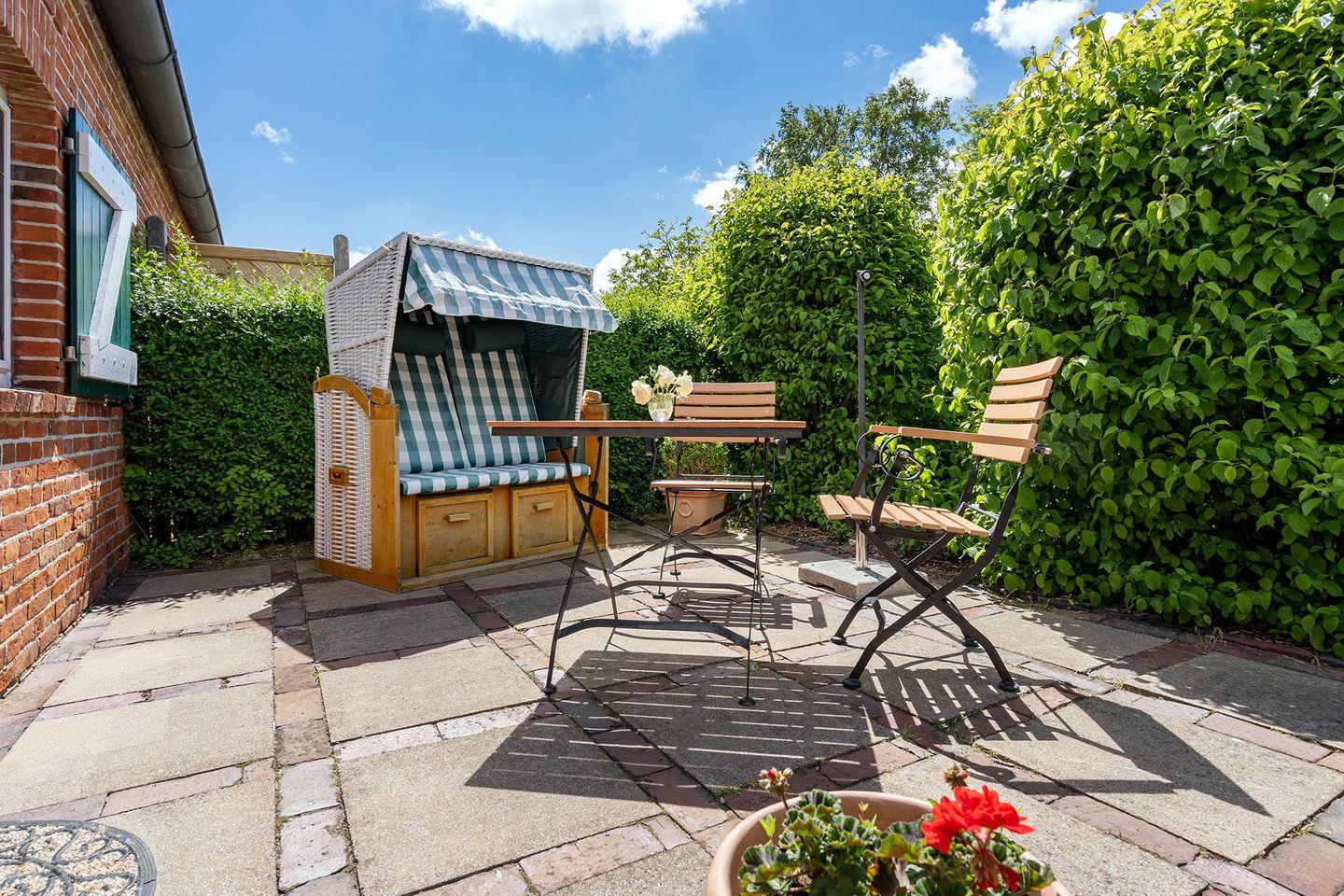 Ein besonderes Highlight des Apartments ist die zauberhafte Terrasse, die von üppigem Grün umgeben ist. Hier können Sie im gemütlichen Strandkorb entspannen oder die Gartenmöbel nutzen, um den Tag bei einem Glas Wein ausklingen zu lassen. Ob bei Sonnenaufgang oder in den späten Abendstunden – dieser Ort lädt zum Träumen und Verweilen ein.