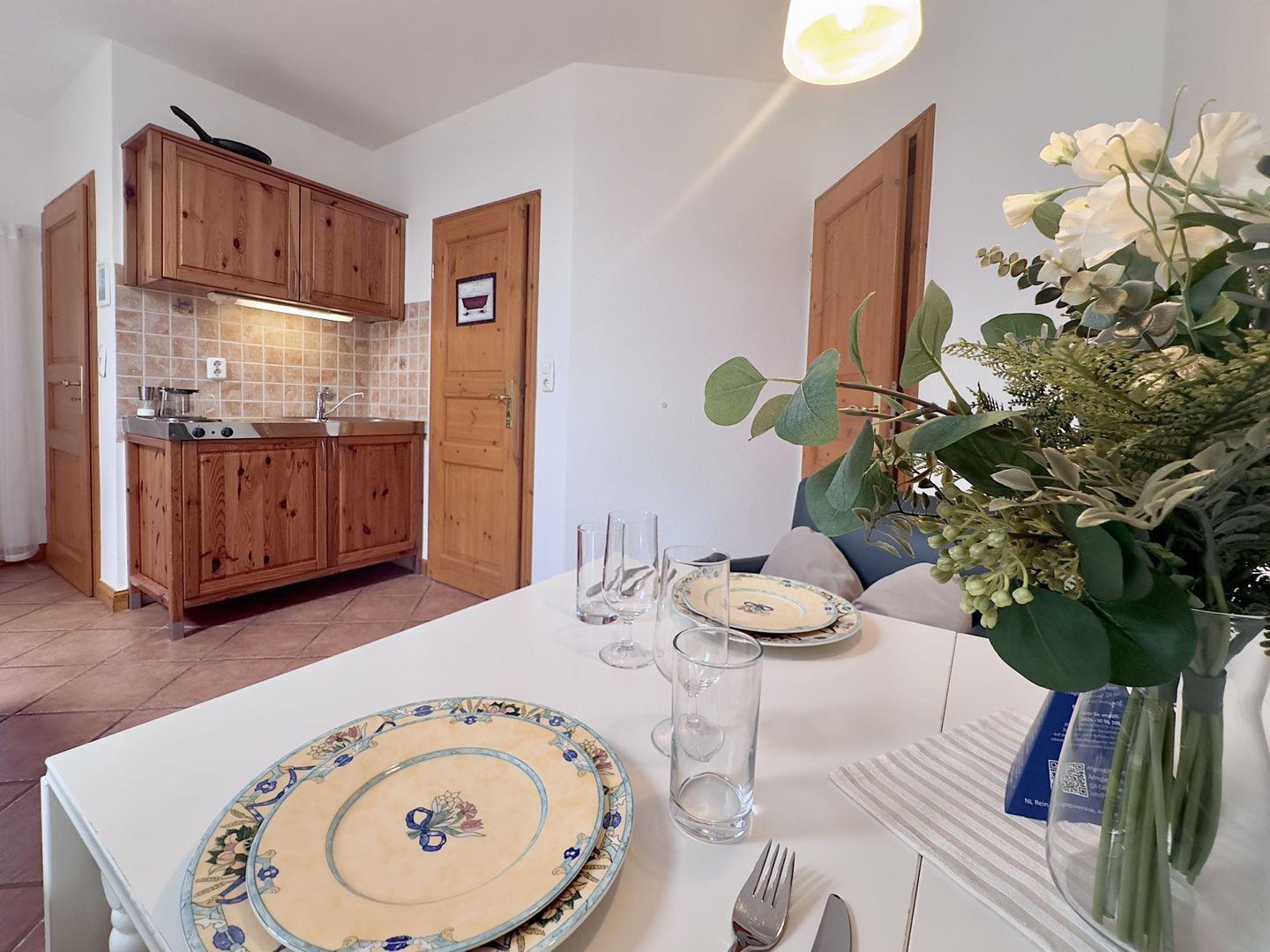 Die kleine, aber gut ausgestattete Küche ist ideal für die Selbstversorgung. Sie finden hier alles, was Sie benötigen, um sich Ihre Lieblingsgerichte zuzubereiten und den Tag mit einem guten Frühstück zu beginnen.
