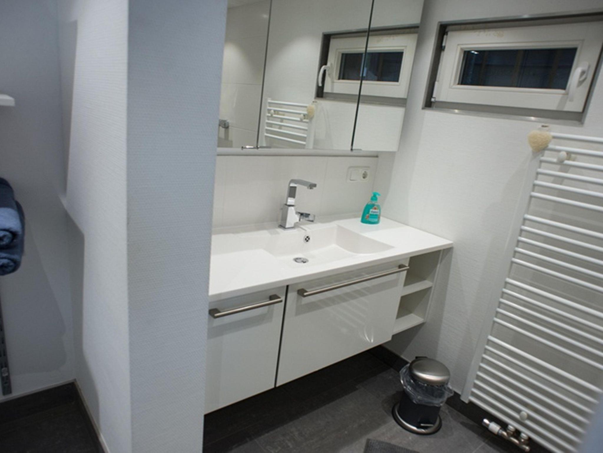 • Bad mit Dusche, Waschbecken, WC und Fön
